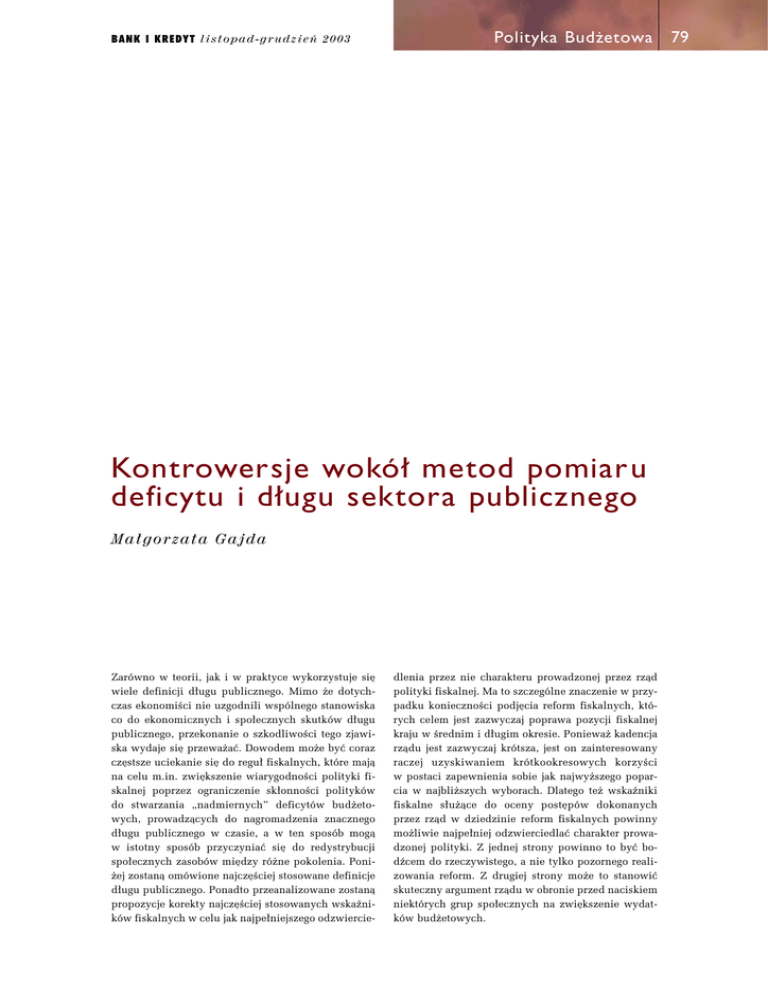 BANK I KREDYT l i s t o p a d - g r u d z i e ƒ 2 0 0 3 Polityka Bud˝etowa Kontrowersje wokó∏ metod pomiaru deficytu i d∏ugu sektora publicznego M a ∏ g o rz a t a G a j d a Zarówno w teorii, jak i w praktyce wykorzystuje si´ wiele definicji d∏ugu publicznego. Mimo ˝e dotychczas ekonomiÊci nie uzgodnili wspólnego stanowiska co do ekonomicznych i spo∏ecznych skutków d∏ugu publicznego, przekonanie o szkodliwoÊci tego zjawiska wydaje si´ przewa˝aç. Dowodem mo˝e byç coraz cz´stsze uciekanie si´ do regu∏ fiskalnych, które majà na celu m.in. zwi´kszenie wiarygodnoÊci polityki fiskalnej poprzez ograniczenie sk∏onnoÊci polityków do stwarzania „nadmiernych” deficytów bud˝etowych, prowadzàcych do nagromadzenia znacznego d∏ugu publicznego w czasie, a w ten sposób mogà w istotny sposób przyczyniaç si´ do redystrybucji spo∏ecznych zasobów mi´dzy ró˝ne pokolenia. Poni˝ej zostanà omówione najcz´Êciej stosowane definicje d∏ugu publicznego. Ponadto przeanalizowane zostanà propozycje korekty najcz´Êciej stosowanych wskaêników fiskalnych w celu jak najpe∏niejszego odzwiercie- dlenia przez nie charakteru prowadzonej przez rzàd polityki fiskalnej. Ma to szczególne znaczenie w przypadku koniecznoÊci podj´cia reform fiskalnych, których celem jest zazwyczaj poprawa pozycji fiskalnej kraju w Êrednim i d∏ugim okresie. Poniewa˝ kadencja rzàdu jest zazwyczaj krótsza, jest on zainteresowany raczej uzyskiwaniem krótkookresowych korzyÊci w postaci zapewnienia sobie jak najwy˝szego poparcia w najbli˝szych wyborach. Dlatego te˝ wskaêniki fiskalne s∏u˝àce do oceny post´pów dokonanych przez rzàd w dziedzinie reform fiskalnych powinny mo˝liwie najpe∏niej odzwierciedlaç charakter prowadzonej polityki. Z jednej strony powinno to byç bodêcem do rzeczywistego, a nie tylko pozornego realizowania reform. Z drugiej strony mo˝e to stanowiç skuteczny argument rzàdu w obronie przed naciskiem niektórych grup spo∏ecznych na zwi´kszenie wydatków bud˝etowych. 79 80 Polityka Bud˝etowa Poj´cie d∏ugu publicznego w teorii i w praktyce D∏ug publiczny jest najcz´Êciej okreÊlany jako finansowe zobowiàzanie w∏adz publicznych (paƒstwowych i samorzàdowych) z tytu∏u zaciàgni´tych po˝yczek1. Podobne uj´cie d∏ugu publicznego prezentuje M. Parkin2. Wed∏ug niego d∏ug publiczny jest to suma zaciàgni´tych po˝yczek, którà rzàd jest winien gospodarstwom domowym, przedsi´biorstwom oraz podmiotom zagranicznym. D∏ug publiczny jest ujmowany jako zasób, tzn. stanowi sum´ zakumulowanych w przesz∏oÊci deficytów pomniejszonà o sum´ zakumulowanych nadwy˝ek bud˝etowych. Wyst´powanie deficytu bud˝etowego w danym roku przyczynia si´ wi´c do powi´kszenia zasobu d∏ugu, nadwy˝ki bud˝etowej powoduje jego obni˝enie, natomiast równowaga bud˝etowa nie wp∏ywa na zasób d∏ugu publicznego w tym uj´ciu3. Innà przyczynà, jak wskazuje S. Owsiak, oprócz wyst´powania deficytów bud˝etowych mogà byç np. przymusowe wyw∏aszczenia mienia na zasadzie odp∏atnoÊci, zobowiàzania odszkodowawcze4. Przedstawione powy˝ej definicje d∏ugu majà wi´c charakter bardziej uniwersalny, uwzgl´dniajà najbardziej powszechnà przyczyn´ powstawania d∏ugu, tj. zaciàganie po˝yczek przez sektor publiczny. Jednak przy rozpatrywaniu definicji d∏ugu istotny jest tak˝e sposób okreÊlenia poj´cia deficytu bud˝etowego. W praktyce wyst´puje wiele zasadniczych ró˝nic w okreÊlaniu zarówno d∏ugu publicznego, jak i deficytu bud˝etowego w poszczególnych krajach. Zgodnie z przyj´tymi standardami mi´dzynarodowymi – zarówno przez Mi´dzynarodowy Fundusz Walutowy, jak i Uni´ Europejskà – deficyt bud˝etowy obejmuje deficyt ca∏ego sektora finansów publicznych (general government), czyli obejmuje bud˝et paƒstwa, bud˝ety lokalne oraz system finansowania ubezpieczeƒ spo∏ecznych, ponadto tzw. przedsi´biorstwa resortowe oraz instytucje niekomercyjne finansowane i kontrolowane przez rzàd na szczeblu centralnym lub lokalnym5. Do sektora finansów publicznych nie sà zaliczane jednostki komercyjne – przedsi´biorstwa, banki itp. – które stanowià w∏asnoÊç publicznà. Wyjàtek stanowià instytucje parabankowe udzielajàce kredytów wy∏àcznie ze Êrodków rzàdowych6. System GFS (Government Finance Statistics) stosowany przez MFW zawiera podzia∏ ca∏ego sektora general government na dwa podstawowe szczeble: centralny 1 Zob. m.in. S. Owsiak: Finanse publiczne. Teoria i praktyka. Warszawa 1998 Wydawnictwo Naukowe PWN, s. 217. 2 Por. M. Parkin: Economics. Addison – Wesley Publishing Company, Inc., 1990, s. 892-893. 3 Tam˝e. 4 S. Owsiak: Finanse ..., op.cit., s. 217. 5 Zob. A. Wernik: Niektóre problemy obliczeniowe i interpretacyjne deficytów bud˝etowych, s. 95. W: Finanse, banki i ubezpieczenia w Polsce u progu XXI wieku. Tom I: Finanse publiczne. Materia∏y konferencyjne, Poznaƒ, 14-17 wrzeÊnia 2000 r. 6 Ibidem. BANK I KREDYT l i s t o p a d - g r u d z i e ƒ 2 0 0 3 (central government) i lokalny (local government). W niektórych krajach wyst´puje tak˝e trzeci szczebel federalny (federal government). MFW porzàdkuje w ten sposób dane statystyczne pochodzàce z krajów cz∏onkowskich, które nie dokonujà powy˝szego rozró˝nienia, natomiast w metodzie stosowanej przez organy Unii Europejskiej istotny jest wynik ca∏ego sektora finansów publicznych bez podzia∏u na poszczególne szczeble7. Metoda GFS obejmuje ca∏y system statystyki bud˝etowej, który umo˝liwia analiz´ operacji finansowych sektora publicznego w ró˝nych przekrojach: wydatków, dochodów, sposobów finansowania deficytu itp. Metoda stosowana w UE dotyczy g∏ównie sposobu obliczania samego deficytu bud˝etowego, przy czym zawiera tak˝e szczegó∏owe zalecenia w sprawie sposobu ewidencjonowania operacji w sektorze finansów publicznych8. Obliczanie deficytu ca∏ego sektora finansów publicznych wymaga 