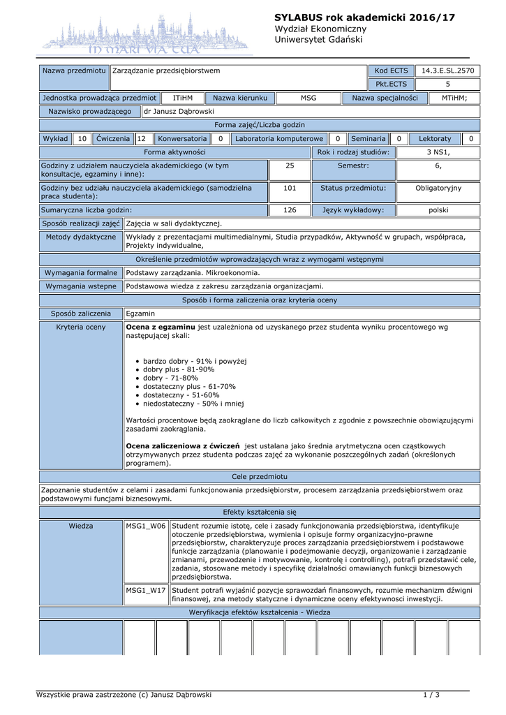 SYLABUS rok akademicki 2016/17 Wydział Ekonomiczny Uniwersytet Gdański Nazwa przedmiotu Zarządzanie przedsiębiorstwem Jednostka prowadząca przedmiot Nazwisko prowadzącego ITiHM Nazwa kierunku MSG Kod ECTS 14.3.E.SL.2570 Pkt.ECTS 5 Nazwa specjalności MTiHM; dr Janusz Dąbrowski Forma zajęć/Liczba godzin Wykład 10 Ćwiczenia 12 Konwersatoria 0 Laboratoria komputerowe Forma aktywności 0 Seminaria 0 Lektoraty Rok i rodzaj studiów: 3 NS1, 25 Semestr: 6, Godziny bez udziału nauczyciela akademickiego (samodzielna praca studenta): 101 Status przedmiotu: Obligatoryjny Sumaryczna liczba godzin: 126 Język wykładowy: polski Godziny z udziałem nauczyciela akademickiego (w tym konsultacje, egzaminy i inne): 0 Sposób realizacji zajęć Zajęcia w sali dydaktycznej. Metody dydaktyczne Wykłady z prezentacjami multimedialnymi, Studia przypadków, Aktywność w grupach, współpraca, Projekty indywidualne, Określenie przedmiotów wprowadzających wraz z wymogami wstępnymi Wymagania formalne Podstawy zarządzania. Mikroekonomia. Wymagania wstepne Podstawowa wiedza z zakresu zarządzania organizacjami. Sposób i forma zaliczenia oraz kryteria oceny Sposób zaliczenia Kryteria oceny Egzamin Ocena z egzaminu jest uzależniona od uzyskanego przez studenta wyniku procentowego wg następującej skali: bardzo dobry - 91% i powyżej dobry plus - 81-90% dobry - 71-80% dostateczny plus - 61-70% dostateczny - 51-60% niedostateczny - 50% i mniej Wartości procentowe będą zaokrąglane do liczb całkowitych z zgodnie z powszechnie obowiązującymi zasadami zaokrąglania. Ocena zaliczeniowa z ćwiczeń jest ustalana jako średnia arytmetyczna ocen cząstkowych otrzymywanych przez studenta podczas zajęć za wykonanie poszczególnych zadań (określonych programem). Cele przedmiotu Zapoznanie studentów z celami i zasadami funkcjonowania przedsiębiorstw, procesem zarządzania przedsiębiorstwem oraz podstawowymi funcjami biznesowymi. Efekty kształcenia się Wiedza MSG1_W06 Student rozumie istotę, cele i zasady funkcjonowania przedsiębiorstwa, identyfikuje otoczenie przedsiębiorstwa, wymienia i opisuje formy organizacyjno-prawne przedsiębiorstw, charakteryzuje proces zarządzania przedsiębiorstwem i podstawowe funkcje zarządzania (planowanie i podejmowanie decyzji, organizowanie i zarządzanie zmianami, przewodzenie i motywowanie, kontrolę i controlling), potrafi przedstawić cele, zadania, stosowane metody i specyfikę działalności omawianych funkcji biznesowych przedsiębiorstwa. MSG1_W17 Student potrafi wyjaśnić pozycje sprawozdań finansowych, rozumie mechanizm dźwigni finansowej, zna metody statyczne i dynamiczne oceny efektywnosci inwestycji. Weryfikacja efektów kształcenia - Wiedza Wszystkie prawa zastrzeżone (c) Janusz Dąbrowski 1/3 SYLABUS rok akademicki 2016/17 Wydział Ekonomiczny Uniwersytet Gdański Efekty MSG1_W06 X X MSG1_W17 X X Umiejętności MSG1_U06 Student konstruuje proste struktury organizacyjne i systemy motywacyjne, analizuje sprawozdania finansowe, potrafi ocenić efektyność inwestycji oraz obliczyć zysk ekononomiczny. Weryfikacja efektów kształcenia - Umiejętności Efekty MSG1_U06 Kompetencje X MSG1_K01 Student zna ograniczenia własnej wiedzy i konieczność jej ciągłego doskonalenia. MSG1_K04 Student prawidłowo idenfyfikuje dylematy w działalnosci gospodarczej przedsiębiorstwa, wykazuje odpowiedzialność za powierzone mu zadana, docenia inicjatywę, kreatywność i przedsiębiorczości wszystkich pracowników w osiąganiu sukcesu gospodarczego przedsiębiorstwa. Weryfikacja efektów kształcenia - Kompetencje Efekty MSG1_K01 X MSG1_K04 X X Treści programowe Wykłady 1. Przedsiębiorstwo jako podmiot gospodarczy (pojęcie i istota przedsiębiorstwa, formy organizacyjno-prawne przedsiębiorstwa, systematyka przedsiębiorstw, otoczenie przedsiębiorstwa i menedżerów, proces zarządzania przedsiębiorstwem). 2. Planowanie i podejmowanie decyzji w przedsiębiorstwie (planowanie w przedsiębiorstwie, planowanie strategiczne, planowanie operacyjne, biznesplan, podejmowanie decyzji). 3. Organizowanie i zarządzanie zmianami w przedsiębiorstwie (pojęcie struktury organizacyjnej, elementy struktury organizacyjnej, klasyczne typy struktur organizacyjnych, nowoczesne typy struktur organizacyjnych, zarządzanie zmianami). 4. Przewodzenie i motywowanie w przedsiębiorstwie (kierownik w przedsiębiorstwie, przywódca w przedsiębiorstwie, system motywowania w przedsiębiorstwie, zarządzanie przez cele). 5. Kontrola i controlling w przedsiębiorstwie (istota kontroli, etapy procesu kontroli, funkcje kontroli, rodzaje kontroli, istota controllingu, narzędzia controllingu). 6. Zarządzanie finansami przedsiębiorstwa (bilans, rachunek wyników, przepływy pieniężne, analiza finansowa, zarządzanie majątkiem obrotowym, inwestycje). 7. Zarządzanie produkcją i jakością (rozwój produktów, procesy produkcyjne, zdolność produkcyjna, produkcja odchudzona (JiT), definicja jakości, całkowity koszt jakości, kompleksowe zarządzanie jakością). 8. Zarządzanie zaopatrzeniem (rozwój funkcji zakupowej, organizacja zaopatrzenia, strategie zakupowe). 9. Zarządzanie zasobami ludzkimi (istota zarządzania zasobami ludzkimi, planowanie zasobów ludzkich, rekrutacja i selekcja, system ocen pracowników, wynagradzanie, szkolenie i rozwój pracowników). Ćwiczenia Wszystkie prawa zastrzeżone (c) Janusz Dąbrowski 2/3 SYLABUS rok akademicki 2016/17 Wydział Ekonomiczny Uniwersytet Gdański 1. 2. 3. 4. Badanie stylu kierowania na podstawie testu Reddina Konstruowanie systemu motywacyjnego przedsiębiorstwa - studium przypadku Opracowywanie schematu struktury organizacyjnej przedsiębiorstwa- studium przypadku Ocena sytuacji finansowej przesiębiorstwa (na podstawie sprawozdania finansowego wybranego przedsiębiorstwa) projekt 5. Zysk ekonomiczny przesiębiorstwa - zadanie 6. Ocena opłacalności inwestycji rzeczowych - zadanie Wykaz literatury podstawowej i uz