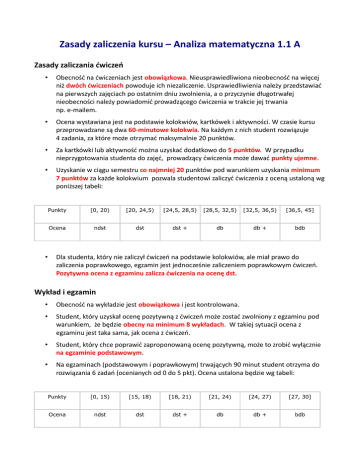 Zasady zaliczenia kursu – Analiza matematyczna 1.1 A Zasady zaliczania ćwiczeń • Obecność na ćwiczeniach jest obowiązkowa. Nieusprawiedliwiona nieobecność na więcej niż dwóch ćwiczeniach powoduje ich niezaliczenie. Usprawiedliwienia należy przedstawiać na pierwszych zajęciach po ostatnim dniu zwolnienia, a o przyczynie długotrwałej nieobecności należy powiadomić prowadzącego ćwiczenia w trakcie jej trwania np. e-mailem. • Ocena wystawiana jest na podstawie kolokwiów, kartkówek i aktywności. W czasie kursu przeprowadzane są dwa 60-minutowe kolokwia. Na każdym z nich student rozwiązuje 4 zadania, za które może otrzymać maksymalnie 20 punktów. • Za kartkówki lub aktywność można uzyskać dodatkowo do 5 punktów. W przypadku nieprzygotowania studenta do zajęć, prowadzący ćwiczenia może dawać punkty ujemne. • Uzyskanie w ciągu semestru co najmniej 20 punktów pod warunkiem uzyskania minimum 7 punktów za każde kolokwium pozwala studentowi zaliczyć ćwiczenia z oceną ustaloną wg poniższej tabeli: • Punkty [0, 20) [20, 24,5) [24,5, 28,5) [28,5, 32,5) [32,5, 36,5) [36,5, 45] Ocena ndst dst dst + db db + bdb Dla studenta, który nie zaliczył ćwiczeń na podstawie kolokwiów, ale miał prawo do zaliczenia poprawkowego, egzamin jest jednocześnie zaliczeniem poprawkowym ćwiczeń. Pozytywna ocena z egzaminu zalicza ćwiczenia na ocenę dst. Wykład i egzamin • Obecność na wykładzie jest obowiązkowa i jest kontrolowana. • Student, który uzyskał ocenę pozytywną z ćwiczeń może zostać zwolniony z egzaminu pod warunkiem, że będzie obecny na minimum 8 wykładach. W takiej sytuacji ocena z egzaminu jest taka sama, jak ocena z ćwiczeń. • Student, który chce poprawić zaproponowaną ocenę pozytywną, może to zrobić wyłącznie na egzaminie podstawowym. • Na egzaminach (podstawowym i poprawkowym) trwających 90 minut student otrzyma do rozwiązania 6 zadań (ocenianych od 0 do 5 pkt). Ocena ustalona będzie wg tabeli: Punkty [0, 15) [15, 18) [18, 21) [21, 24) [24, 27) [27, 30] Ocena ndst dst dst + db db + bdb • Ocenę dst może otrzymać również student, którego suma punktów z egzaminu i 20% punktów z kolokwiów (bez punktów za aktywność) jest nie mniejsza niż 15. Liczba punktów dodanych do wyniku egzaminu nie może być wyższa niż 4. UWAGI: 1. Na kolokwiach oraz egzaminach należy mieć przy sobie legitymację studencką. 2. Nieobecność na egzaminie należy bezzwłocznie usprawiedliwić u wykładowcy. 3. Sprawdziany (kolokwia, egzaminy) muszą być pisane przez studenta samodzielnie i mogą być weryfikowane ustnie. 4. Student, który dopuści się oszustwa podczas kolokwium lub egzaminu (podrzucenie pracy, podstawienie innej osoby, korzystanie z telefonu komórkowego itp.) otrzymuje ocenę niedostateczną i nie ma prawa do pisania kolejnych sprawdzianów (kolokwiów, egzaminów).