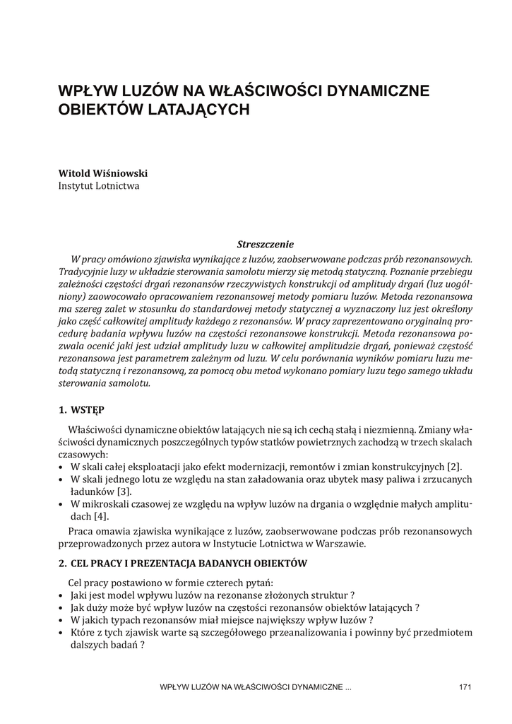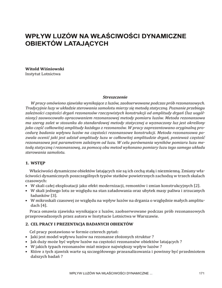 WPŁYW LUZÓW NA WŁAŚCIWOŚCI DYNAMICZNE OBIEKTÓW LATAJĄCYCH Witold Wiśniowski Instytut Lotnictwa Streszczenie W pracy omówiono zjawiska wynikające z luzów, zaobserwowane podczas prób rezonansowych. Tradycyjnie luzy w układzie sterowania samolotu mierzy się metodą statyczną. Poznanie przebiegu zależności częstości drgań rezonansów rzeczywistych konstrukcji od amplitudy drgań (luz uogólniony) zaowocowało opracowaniem rezonansowej metody pomiaru luzów. Metoda rezonansowa ma szereg zalet w stosunku do standardowej metody statycznej a wyznaczony luz jest określony jako część całkowitej amplitudy każdego z rezonansów. W pracy zaprezentowano oryginalną procedurę badania wpływu luzów na częstości rezonansowe konstrukcji. Metoda rezonansowa pozwala ocenić jaki jest udział amplitudy luzu w całkowitej amplitudzie drgań, ponieważ częstość rezonansowa jest parametrem zależnym od luzu. W celu porównania wyników pomiaru luzu metodą statyczną i rezonansową, za pomocą obu metod wykonano pomiary luzu tego samego układu sterowania samolotu. 1. WSTĘP Właściwości dynamiczne obiektów latających nie są ich cechą stałą i niezmienną. Zmiany właściwości dynamicznych poszczególnych typów statków powietrznych zachodzą w trzech skalach czasowych: • W skali całej eksploatacji jako efekt modernizacji, remontów i zmian konstrukcyjnych [2]. • W skali jednego lotu ze względu na stan załadowania oraz ubytek masy paliwa i zrzucanych ładunków [3]. • W mikroskali czasowej ze względu na wpływ luzów na drgania o względnie małych amplitudach [4]. Praca omawia zjawiska wynikające z luzów, zaobserwowane podczas prób rezonansowych przeprowadzonych przez autora w Instytucie Lotnictwa w Warszawie. 2. CEL PRACY I PREZENTACJA BADANYCH OBIEKTÓW • • • • Cel pracy postawiono w formie czterech pytań: Jaki jest model wpływu luzów na rezonanse złożonych struktur ? Jak duży może być wpływ luzów na częstości rezonansów obiektów latających ? W jakich typach rezonansów miał miejsce największy wpływ luzów ? Które z tych zjawisk warte są szczegółowego przeanalizowania i powinny być przedmiotem dalszych badań ? WPŁYW LUZÓW NA WŁAŚCIWOŚCI DYNAMICZNE ... 171 3. PRÓBY REZONANSOWE Próby rezonansowe są doświadczalnym sposobem wykrywania i badania rezonansów rzeczywistej konstrukcji poprzez odpowiednie wzbudzanie drgań oraz pomiar odpowiedzi. Wynikiem prób rezonansowych jest lista rezonansów zawierająca wartości częstości rezonansowych, współrzędne (rysunki) postaci drgań rezonansowych oraz wartości uogólnionych współczynników masy, sztywności i tłumienia [5]. Technologia prób rezonansowych umożliwia pomiar zależności częstości rezonansowych od amplitudy drgań. Zależność ta w bezpośredni sposób odzwierciedla udział luzów w drganiach rezonansowych. Aparatura badawcza Wzbudniki drgań 4. LuZ uOgÓLNIONY Luz jest to odcinek niesprężystego ruchu względnego współpracujących ze sobą elementów konstrukcji. Luzy istniejące w elementach konstrukcji ujawniają się w różnym stopniu w zależności od postaci drgań. Model układu drgającego z luzem przedstawiono na rysunku 1. Rys. 1. Model układu z luzem Na rysunku 2 przedstawiono zależność częstości drgań rezonansowych od wielkość luzów modelu i rzeczywistej konstrukcji. 172 PRACE INSTYTUTU LOTNICTWA Nr 202 Rys. 2. Zależność częstości drgań rezonansowych od wartości luzów modelu oraz rzeczywistej konstrukcji gdzie: A – układ bez luzu, B – model według rys. 1, C – rzeczywista konstrukcja Wraz ze wzrostem amplitudy drgań maleje w nich udział luzu. Wraz ze zmniejszeniem się udziału luzu w całkowitej amplitudzie drgań częstość rezonansowa zbliża się do częstości układu bez luzu. Dla modelu układu z luzem względną zależność amplitudy luzu od częstości rezonansowych opisuje zależność [1]: gdzie: L – a – f0rez – frez – wielkość luzu, amplituda drgań rezonansowych, częstość drgań rezonansowych bez luzu, częstość drgań rezonansowych z luzem L. Zależność tę przedstawiono graficznie na rysunku 3. WPŁYW LUZÓW NA WŁAŚCIWOŚCI DYNAMICZNE ... 173 Rys. 3. Zależność względnej wartości luzu od zmian częstości rezonansowych W rzeczywistej złożonej strukturze jaką jest statek latający w każdym rezonansie luzy sumują się i korelują ze sztywnością „biorącą” udział w drganiach. Luz „przypisany” do postaci drgań nazwano luzem uogólnionym. Zależność przedstawiona na rysunku umożliwia doświadczalną ocenę luzu uogólnionego [4]. Zależność częstości drgań rzeczywistych rezonansów od ich amplitudy jest identyczna z teoretyczną wynikającą z modelu w przedziale drgań porównywalnych z amplitudą luzów. W zakresie mniejszych amplitud zjawisko wzrostu częstości drgań rezonansowych można wyjaśnić jako wynik stanu „niepełnego” rozwinięcia się drgań całego układu z powodu niewystarczającej energii wzbudzania która jest potrzebna do pokonania np. tarcia suchego. Największe luzy mogą wystąpić w mechanicznych układach sterowania w których nie zastosowano wzmacniaczy. W takich przypadkach przy zgodnym ruchu sterownic i powierzchni sterowych mamy do czynienia z nieograniczonym luzem. Ewentualnych sztywności potrzebnych dla ruchu drgającego można doszukiwać się w mięśniach pilota oraz „własnej sztywności elementów sterowania”. Rys. 4. Algorytm rezonansowego pomiaru luzu uogólnionego 174 PRACE INSTYTUTU LOTNICTWA Nr 202 Znaczące luzy mogą występować w rezonansach układów sterowania z jednym węzłem, w których sterownica w kabinie drga w przeciw-fazie do powierzchni sterowych. W oparciu o zależności wynikające z modelu układu z luzem przedstawionym na rysunkach 1, 2 i 3 można prowadzić pomiar wielkości luzu uogólnionego według algorytmu, jak na rysunku 4. 5. PORÓWNANIE WYNIKÓW POmIARu LuZu mETODą 