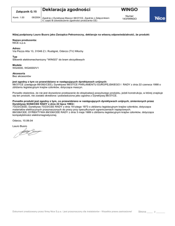 Załącznik G.15 Kontr. 1.00 Deklaracja zgodności 06/2004 Zgodnie z Dyrektywą Maszyn 98/37/CE, Zgodnie z Załącznikiem II, część B (oświadczenie zgodności producenta CE) WINGO Numer 143/WINGO Niżej podpisany Lauro Buoro jako Zarządca Pełnomocny, deklaruje na własną odpowiedzialność, że produkt: Nazwa producenta: NICE s.p.a. Adres: Via Pezza Alta 13, 31046 Z.I. Rustignè, Oderzo (TV) Włochy Typ Siłownik elektromechaniczny “WINGO” do bram skrzydłowych Modele WG4000, WG4000/V1 Akcesoria Bez akcesoriów jest zgodny z tym co przewidziano w następujących dyrektywach unijnych: 98/37/CE (zastępuje 89/392/CEE); Dyrektywa 98/37/CE PARLAMENTU EUROPEJSKIEGO I RADY z dnia 22 czerwca 1998 o zbliżeniu legislacyjnym krajów członków, dotycząca maszyn. Ponadto stwierdza, że nie jest dozwolone przekazanie do eksploatacji powyższego produktu, jeżeli konstrukcja, w której znajduje się ten produkt, nie została określona i poświadczona jako zgodna z Dyrektywą 98/37/CE. Ponadto produkt jest zgodny z tym, co przewidziano w następujących dyrektywach unijnych, zmienionych przez Dyrektywę 93/68/CEE RADY z dnia 22 lipca 1993r: 73/23/CEEE; Dyrektywa 73/23/CEE RADY z dnia 19 lutego 1973 o zbliżeniu legislacyjnym krajów członków, dotycząca materiałów elektrycznych przeznaczonych do pracy przy specyficznych ograniczeniach napięciowych. 89/336/CEE; DYREKTYWA 89/336/CEE RADY z dnia 3 maja 1989 o zbliżeniu legislacyjnym krajów członków, dotycząca kompatybilności elektromagnetycznej. Oderzo, 10.06.04 Lauro Buoro Dokument zrealizowany przez firmę Nice S.p.a. i jest przeznaczony dla instalatorów - Wszelkie prawa zastrzeżone! Strona ____ z ______