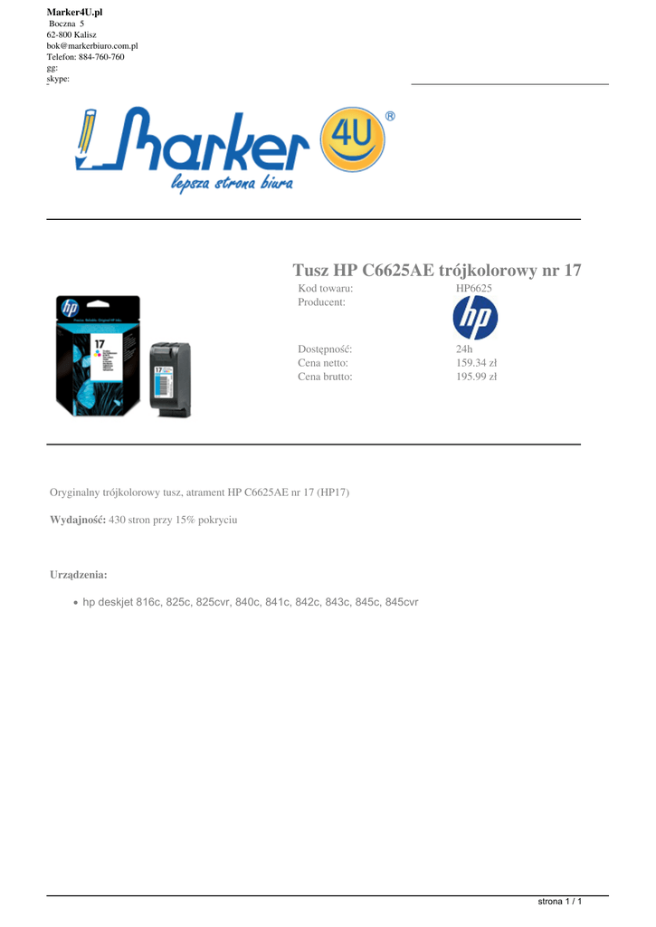 Marker4U.pl Boczna 5 62-800 Kalisz [email protected] Telefon: 884-760-760 gg: skype: Tusz HP C6625AE trójkolorowy nr 17 Kod towaru: Producent: HP6625 Dostępność: Cena netto: Cena brutto: 24h 159.34 zł 195.99 zł Oryginalny trójkolorowy tusz, atrament HP C6625AE nr 17 (HP17) Wydajność: 430 stron przy 15% pokryciu Urządzenia: hp deskjet 816c, 825c, 825cvr, 840c, 841c, 842c, 843c, 845c, 845cvr strona 1 / 1 Powered by TCPDF (www.tcpdf.org)