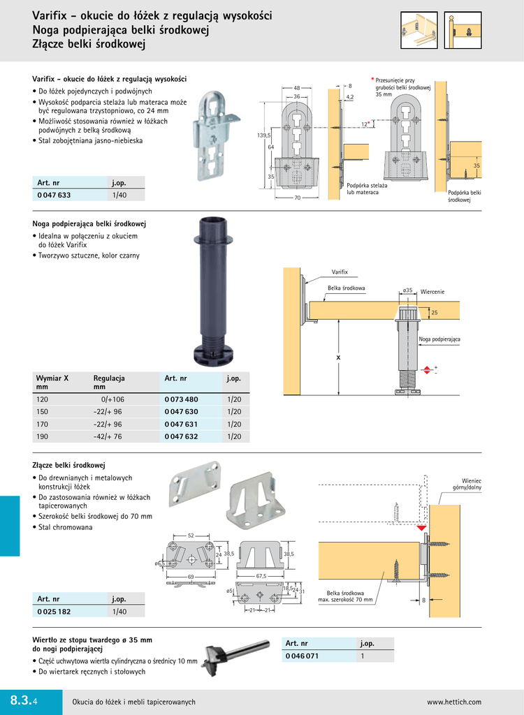 Varifix - okucie do łóżek z regulacją wysokości Noga podpierająca belki środkowej Złącze belki środkowej Varifix - okucie do łóżek z regulacją wysokości * Przesunięcie przy 8 48 36 • Do łóżek pojedynczych i podwójnych • Wysokość podparcia stelaża lub materaca może być regulowana trzystopniowo, co 24 mm • Możliwość stosowania również w łóżkach podwójnych z belką środkową • Stal zobojętniana jasno-niebieska grubości belki środkowej 35 mm 4,2 12* 139,5 64 35 Art. nr j.op. 0 047 633 1/40 35 Podpórka stelaża lub materaca Podpórka belki środkowej 70 Noga podpierająca belki środkowej • Idealna w połączeniu z okuciem do łóżek Varifix • Tworzywo sztuczne, kolor czarny Varifix Belka środkowa ø35 Wiercenie 25 Noga podpierająca x Wymiar X mm 120 Regulacja mm j.op. 0 073 480 1/20 -22/+ 96 0 047 630 1/20 170 -22/+ 96 0 047 631 1/20 190 -42/+ 76 0 047 632 1/20 150 0/+106 Art. nr + - Złącze belki środkowej • Do drewnianych i metalowych konstrukcji łóżek • Do zastosowania również w łóżkach tapicerowanych • Szerokość belki środkowej do 70 mm • Stal chromowana Wieniec górny/dolny 52 24 38,5 38,5 ø6,5 67,5 69 18,524 31 ø5 Art. nr j.op. 0 025 182 1/40 Wiertło ze stopu twardego ø 35 mm do nogi podpierającej • Część uchwytowa wiertła cylindryczna o średnicy 10 mm • Do wiertarek ręcznych i stołowych 8.3. 4 Okucia do łóżek i mebli tapicerowanych 21 Belka środkowa max. szerokość 70 mm 8 21 Art. nr j.op. 0 046 071 1 www.hettich.com