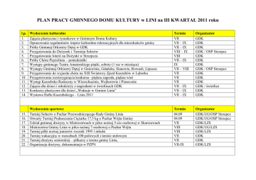 PLAN PRACY GMINNEGO DOMU KULTURY w LINI na III KWARTAŁ 2011 roku l.p. 1. 2. 3. 4. 5. 6. 7. 8. 9. 10. 11. 12. 13. 14. Wydarzenie kulturalne Zajęcia plastyczne i rysunkowe w Gminnym Domu Kultury Opracowanie regulaminów imprez kulturalno-rekreacyjnych dla mieszkańców gminy Próby Gminnej Orkiestry Dętej w GDK Przygotowania do Dożynek i Turnieju Sołectw Przygotowanie loterii na Dożynki w Strzepczu Próby Chóru Pięciolinia – poniedziałki Występy gminnego Teatru Amatorskiego piątki, soboty (1 raz w miesiącu) Występy Gminnej Orkiestry Dętej w Gniewinie, Gdańsku, Sianowie, Rowach, Lipuszu Przygotowanie do wyjazdu chóru na XIII Światowy Zjazd Kaszubów w Lęborku Przygotowania rozstrzygnięcia konkursu –piękna zagroda, piękna wieś Występ Kaszebsko Rodzezny w Wierzchucinie, Wejherowie i Piasecznie Zajęcia dla dzieci i młodzieży z nagrodami w świetlicach GDK Konkursy plastyczne dla dzieci „Wakacje w Gminie Linia” Wystawa Haftu Kaszubskiego – Linia 2011 Termin VII VII – IX VII – IX VIII – IX VIII VII – IX IX VII – VIII VII VII VII VII – IX VII – IX VII – IX Organizator GDK GDK GDK GDK / OSP Strzepcz GDK GDK GDK GDK / OSP Strzepcz GDK GDK GDK GDK / świetlice GDK GDK 15. 16. 17. 18. 19. 20. 21. 22. Wydarzenia sportowe Turniej Sołectw o Puchar Przewodniczącego Rady Gminy Linia Otwarty Turniej Podnoszenia Ciężarka 17,5 kg o Puchar Wójta Gminy Udział gminnej drużyny w Mistrzostwach w piłce nożnej 5-cio osobowej w Skarszewach Mistrzostwa Gminy Linia w piłce nożnej 7-osobowej o Puchar Wójta Turniej piłki nożnej juniorów rocznik 1995 i młodsi Turniej wakacyjny w warcabach 100-polowych i tenisie stołowym Turniej drużyny seniorskiej – piłkarzy z terenu gminy Linia, Organizacja drużyny, dokumentacja w PZPN Termin 04.09 04.09 VII VIII VIII VII VII VII-IX Organizator GDK/UG/OSP Strzepcz GDK/UG/OSP Strzepcz GDK/LZS GDK/UG/LZS GDK/LZS GDK GDK GDK/LZS 23. 24. 25. 26. 27. 28. 29. 30. 31. Turystyka i rekreacja Organizacja wycieczek dla dzieci i młodzieży z terenu gminy Linia Organizacja wycieczek po Szwajcarii Kaszubskiej Wycieczka krajoznawcza do Gdańska dla członków Orkiestry Wyjazd do teatru dla członków grupy teatralnej i mieszkańców Konkurs na najpiękniejszą zagrodę i miejscowość w gminie Zabawy rekreacyjno – sportowe podczas dożynek gminnych Uporządkowanie terenów zielonych nad brzegami jezior na terenie Gminy Linia Występ Gminnej Orkiestry Dętej podczas pielgrzymki do Sianowa Wyjazd integracyjny dla członków chóru do Garcygorza Termin VII – VIII VII – VIII VIII VIII VII IX VII VII VII Organizator GDK/Bądźmy Razem GDK/Bądźmy Razem GDK GDK GDK/UG GDK/OSP Strzepcz GDK GDK GDK