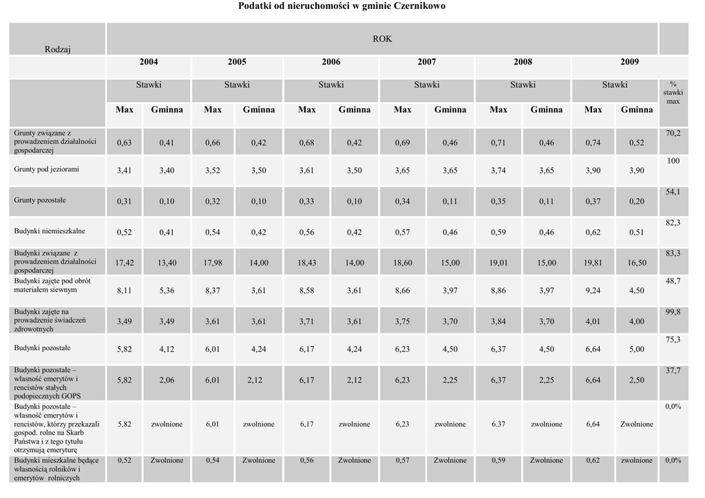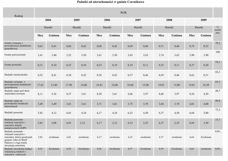 Podatki od nieruchomości w gminie Czernikowo ROK Rodzaj 2004 2005 2006 2007 2008 Stawki Stawki Stawki Stawki Stawki 2009 % stawki max Stawki Max Gminna Max Gminna Max Gminna Max Gminna Max Gminna Max Gminna Grunty związane z prowadzeniem działalności gospodarczej 0,63 0,41 0,66 0,42 0,68 0,42 0,69 0,46 0,71 0,46 0,74 0,52 Grunty pod jeziorami 3,41 3,40 3,52 3,50 3,61 3,50 3,65 3,65 3,74 3,65 3,90 3,90 Grunty pozostałe 0,31 0,10 0,32 0,10 0,33 0,10 0,34 0,11 0,35 0,11 0,37 0,20 Budynki niemieszkalne 0,52 0,41 0,54 0,42 0,56 0,42 0,57 0,46 0,59 0,46 0,62 0,51 17,42 13,40 17,98 14,00 18,43 14,00 18,60 15,00 19,01 15,00 19,81 16,50 8,11 5,36 8,37 3,61 8,58 3,61 8,66 3,97 8,86 3,97 9,24 4,50 Budynki zajęte na prowadzenie świadczeń zdrowotnych 3,49 3,49 3,61 3,61 3,71 3,61 3,75 3,70 3,84 3,70 4,01 4,00 Budynki pozostałe 5,82 4,12 6,01 4,24 6,17 4,24 6,23 4,50 6,37 4,50 6,64 5,00 5,82 2,06 6,01 6,17 2,12 6,23 2,25 6,37 2,25 6,64 2,50 70,2 100 54,1 82,3 Budynki związane z prowadzeniem działalności gospodarczej Budynki zajęte pod obrót materiałem siewnym 83,3 48,7 99,8 75,3 Budynki pozostałe – własność emerytów i rencistów stałych podopiecznych GOPS Budynki pozostałe – własność emerytów i rencistów, którzy przekazali gospod. rolne na Skarb Państwa i z tego tytułu otrzymują emeryturę Budynki mieszkalne będące własnością rolników i emerytów rolniczych 37,7 2,12 0,0% 5,82 zwolnione 6,01 zwolnione 6,17 zwolnione 6,23 zwolnione 6.37 zwolnione 6,64 Zwolnione 0,52 Zwolnione 0,54 Zwolnione 0,56 Zwolnione 0,57 Zwolnione 0,59 Zwolnione 0,62 zwolnione 0,0%