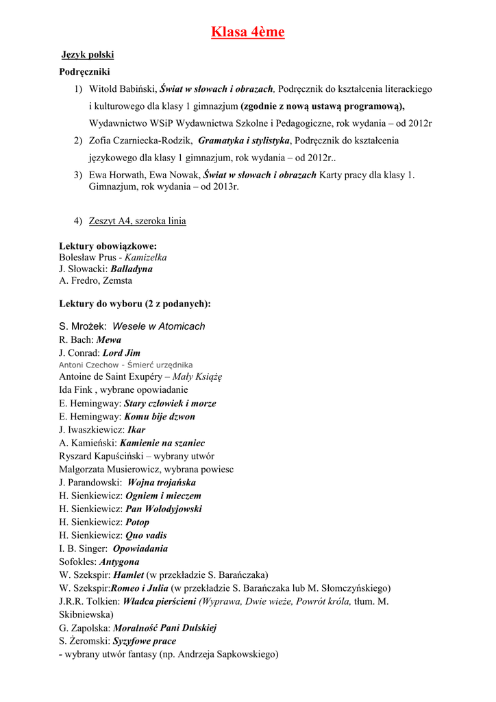 Klasa 4ème Język polski Podręczniki 1) Witold Babiński, Świat w słowach i obrazach, Podręcznik do kształcenia literackiego i kulturowego dla klasy 1 gimnazjum (zgodnie z nową ustawą programową), Wydawnictwo WSiP Wydawnictwa Szkolne i Pedagogiczne, rok wydania – od 2012r 2) Zofia Czarniecka-Rodzik, Gramatyka i stylistyka, Podręcznik do kształcenia językowego dla klasy 1 gimnazjum, rok wydania – od 2012r.. 3) Ewa Horwath, Ewa Nowak, Świat w słowach i obrazach Karty pracy dla klasy 1. Gimnazjum, rok wydania – od 2013r. 4) Zeszyt A4, szeroka linia Lektury obowiązkowe: Bolesław Prus - Kamizelka J. Słowacki: Balladyna A. Fredro, Zemsta Lektury do wyboru (2 z podanych): S. Mrożek: Wesele w Atomicach R. Bach: Mewa J. Conrad: Lord Jim Antoni Czechow - Śmierć urzędnika Antoine de Saint Exupéry – Mały Książę Ida Fink , wybrane opowiadanie E. Hemingway: Stary człowiek i morze E. Hemingway: Komu bije dzwon J. Iwaszkiewicz: Ikar A. Kamieński: Kamienie na szaniec Ryszard Kapuściński – wybrany utwór Malgorzata Musierowicz, wybrana powiesc J. Parandowski: Wojna trojańska H. Sienkiewicz: Ogniem i mieczem H. Sienkiewicz: Pan Wołodyjowski H. Sienkiewicz: Potop H. Sienkiewicz: Quo vadis I. B. Singer: Opowiadania Sofokles: Antygona W. Szekspir: Hamlet (w przekładzie S. Barańczaka) W. Szekspir:Romeo i Julia (w przekładzie S. Barańczaka lub M. Słomczyńskiego) J.R.R. Tolkien: Władca pierścieni (Wyprawa, Dwie wieże, Powrót króla, tłum. M. Skibniewska) G. Zapolska: Moralność Pani Dulskiej S. Żeromski: Syzyfowe prace - wybrany utwór fantasy (np. Andrzeja Sapkowskiego)