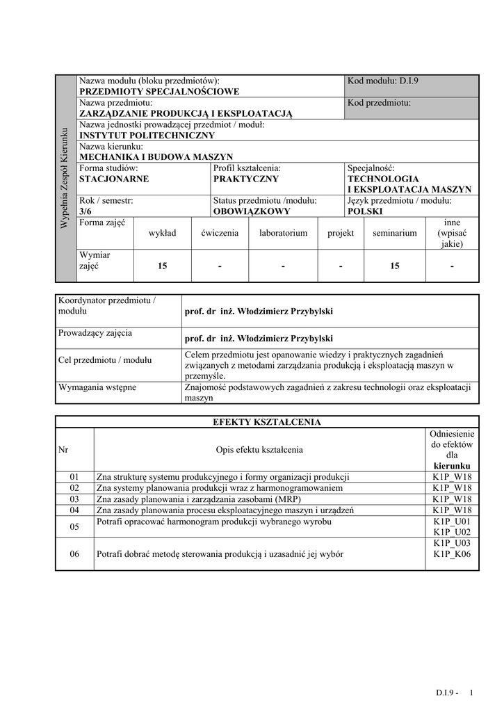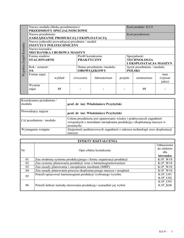 Wypełnia Zespół Kierunku Nazwa modułu (bloku przedmiotów): PRZEDMIOTY SPECJALNOŚCIOWE Nazwa przedmiotu: ZARZĄDZANIE PRODUKCJĄ I EKSPLOATACJĄ Nazwa jednostki prowadzącej przedmiot / moduł: INSTYTUT POLITECHNICZNY Nazwa kierunku: MECHANIKA I BUDOWA MASZYN Forma studiów: Profil kształcenia: STACJONARNE PRAKTYCZNY Rok / semestr: 3/6 Forma zajęć Status przedmiotu /modułu: OBOWIĄZKOWY wykład ćwiczenia laboratorium 15 - - Wymiar zajęć Koordynator przedmiotu / modułu Prowadzący zajęcia Cel przedmiotu / modułu Wymagania wstępne Kod modułu: D.I.9 Kod przedmiotu: Specjalność: TECHNOLOGIA I EKSPLOATACJA MASZYN Język przedmiotu / modułu: POLSKI inne projekt seminarium (wpisać jakie) - 15 - prof. dr inż. Włodzimierz Przybylski prof. dr inż. Włodzimierz Przybylski Celem przedmiotu jest opanowanie wiedzy i praktycznych zagadnień związanych z metodami zarządzania produkcją i eksploatacją maszyn w przemyśle. Znajomość podstawowych zagadnień z zakresu technologii oraz eksploatacji maszyn EFEKTY KSZTAŁCENIA Nr Opis efektu kształcenia 01 02 03 04 05 06 Zna strukturę systemu produkcyjnego i formy organizacji produkcji Zna systemy planowania produkcji wraz z harmonogramowaniem Zna zasady planowania i zarządzania zasobami (MRP) Zna zasady planowania procesu eksploatacyjnego maszyn i urządzeń Potrafi opracować harmonogram produkcji wybranego wyrobu Potrafi dobrać metodę sterowania produkcją i uzasadnić jej wybór Odniesienie do efektów dla kierunku K1P_W18 K1P_W18 K1P_W18 K1P_W18 K1P_U01 K1P_U02 K1P_U03 K1P_K06 D.I.9 - 1 TREŚCI PROGRAMOWE Wykład Pojęcie systemu produkcyjnego. Otoczenie systemu produkcyjnego. Podstawowe pojęcia i definicje związane z procesem produkcyjnym i eksploatacją maszyn . Istota zarządzania. Główne cele i strategie zarządzania systemem produkcyjnym i eksploatacyjnym. Podejmowanie decyzji w procesie zarządzania. Struktura systemu produkcyjnego i formy organizacji produkcji. Seryjność produkcji. Koncentracja produkcji. Planowanie i sterowanie produkcją. Podsystem planowania produkcji PPC: planowanie długoterminowe (strategiczne), średnioterminowe (taktyczne) i krótkoterminowe (operacyjne). Harmonogramowanie i optymalizacja procesu produkcyjnego. Sterowanie i nadzorowanie procesu produkcyjnego w czasie rzeczywistym. Zarządzanie zapasami. Metoda planowania potrzeb materiałowych (MRP). Planowanie zasobów produkcyjnych (MRP II). Organizacja procesów zaopatrzenia i dystrybucji. Synchronizacja przepływu materiałów wg koncepcji JIT. Sterowanie przepływem produkcji (Kanban). Produkcja oszczędna (Lean Production). Zarządzanie wąskimi przekrojami (OPT). Kompleksowe zarządzanie jakością (TQM). Zarządzanie kosztami (ABC i ABM). Zarządzanie rozwojem systemu produkcyjnego. Zarządzanie zasobami ludzkimi i pracą w zespole. Seminarium Opracowanie harmonogramów przebiegu procesów w warunkach ograniczonych zasobów produkcyjnych. Opracowanie podstawowych algorytmów prognozowania produkcji. Seminaryjne opracowania indywidualne z zakresu zarządzania produkcją i eksploatacją. Literatura podstawowa Literatura uzupełniająca Metody kształcenia Durlik I.: Inżynieria zarządzania. cz. I i II. Agencja Wydawnicza Placet, Warszawa 2001. Muhlemann A.P., Oakland J.S., Lokyer K.G.: Zarządzanie. Produkcja i usługi. PWN, Warszawa 2001. Michalski R., Niziński S.: Podstawy eksploatacji obiektów technicznych. Wydawnictwo ART, Olsztyn 2000. Koźmiński A., Piotrkowski W.: Zarządzanie – teoria i praktyka. PWN, Warszawa 2000. Wykład z prezentacją multimedialną. Omawianie przykładów praktycznych zastosowań z przemysłu. Metody weryfikacji efektów kształcenia Nr efektu kształcenia Dwa pisemne kolokwia w semestrze. 01, 02, 03, 04 Referat seminaryjny 05, 06 Dyskusja w grupie seminaryjnej. 05, 06 Forma i warunki Zaliczenie wykładu na podstawie 2-ch kolokwiów – testów w czasie trwania zaliczenia semestru (waga 50 %). Zaliczenie seminarium na podstawie indywidualnych opracowań pisemnych referatów seminaryjnych (50 %). D.I.9 - 2 NAKŁAD PRACY STUDENTA Udział w wykładach Samodzielne studiowanie tematyki wykładów Udział w ćwiczeniach audytoryjnych, laboratoryjnych, projektowych i seminariach Samodzielne przygotowywanie się do ćwiczeń* Przygotowanie projektu / eseju / itp. * Przygotowanie się do egzaminu / zaliczenia Udział w konsultacjach Inne ŁĄCZNY nakład pracy studenta w godz. Liczba punktów ECTS za przedmiot Liczba godzin 15 5 15 10 10 5 60 2 Liczba p. ECTS związana z zajęciami praktycznymi* 0,8 Liczba p. ECTS za zajęciach wymagające bezpośredniego udziału nauczycieli akademickich 1,2 D.I.9 - 3