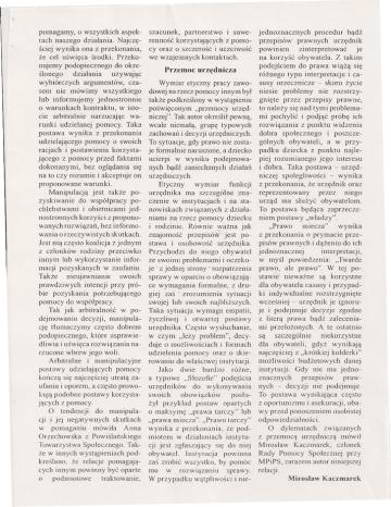 pomagamy, o wszystkicb aspektach naszego działania. Najczęściej wynika ona z przekonania, że cel uświęca środki. Przekonujemy podopiecznego do określonego działania używając wybiórczych argumentów, czasem nie mówimy wszystkiego lub informujemy jednostronnie o warunkach kontraktu, w istocie arbitralnie narzucając warunki udzielanej pomocy. Taka postawa wynika z przekonania udzielającego pomocy o swoich racjach i postawienia korzystającego z pomocy przed faktami dokonanymi, bez oglądania się na to czy rozumie i akceptuje on proponowane warunki. Manipulacją jest także pozyskiwanie do współpracy po-· chlebstwami i obietnicami jednostronnych korzyści z proponowanych rozwiązań, bez informowania o rzeczywistych skutkach. Jest nią często koalicja zjednym z członków rodziny przeciwko innym lub wykorzystanie informacji pozyskanych w zaufaniu. Także nieujawnianie swoich prawdziwych intencji przy próbie pozyskania potrzebującego pomocy do współpracy. Tak jak arbitralność w podejmowaniu decyzji, manipulację tłumaczymy często dobrem podopiecznego, które usprawiedliwia i uświęca rozwiązania narzucone wbrew jego woli. Arbitralne i manipulacyjne postawy udzielających pomocy kończą się najczęściej utratą zaufania i oporem, a często prowokują podobne postawy korzystających z pomocy. O tendencji do manipulacji i jej negatywnych skutkach w pomaganiu mówiła Anna Orzechówska z Powiślańskiego Towarzystwa Społecznego. Także w innych wystąpieniach podkreślano, że relacje pomagających innym powinny być oparte o podmiotowe traktowanie, szacunek, partnerstwo i suwerenność korzystających z pomocy oraz o szczerość i uczciwość we wzajemnych kontaktach. Przemoc urzędnicza Wymiar etyczny pracy zawodowej na rzecz pomocy innym był także podkreślony w wystąpieniu poświęconym "przemocy urzędniczej". Tak autor określił pewną, wcale niemałą, grupę typowych zachowań i decyzji urzędniczych. To sytuacje, gdy prawo nie zostaje formalnie naruszone, a dziecko ucierpi w wyniku podejmowanych bądź zaniechanych działań urzędniczych. Etyczny wyrmar funkcji urzędnika ma szczególne znaczenie w instytucjach i na stanowiskach związanych z działaniami na rzecz pomocy dziecku i rodzinie. Równie ważna jak znajomość przepisów jest postawa i osobowość urzędnika. Przychodzi do niego obywatel ze swoimi problemami i oczekuje - z jednej strony - rozpatrzenia sprawy w oparciu o obowiązujące wymagania formalne, z drugiej zaś - zrozumienia sytuacji swojej lub swoich najbliższych. Taka sytuacja wymaga empatii, życzliwej i otwartej postawy urzędnika. Często wysłuchanie, w czym "leży problem", decyduje o możliwościach i formach udzielenia pomocy oraz o skierowaniu do właściwej instytucji. "Jako dwie bardzo różne, a typowe "fi lozofie" podejścia urzędników do wykonywania swoich obowiązków posłużył przykład postaw opartych o maksymę "prawa tarczy" lub "prawa miecza". "Prawo tarczy" wynika z przekonania, że podmiotem w działaniach instytucji jest zgłaszający się do niej obywatel. r nstytucja powinna zaś zrobić wszystko, by pomóc mu w rozwiązaniu sprawy. W przypadku wątpliwości i nie- jednoznacznych procedur bądź przepisów prawnych urzędnik powinien zinterpretować Je na korzyść obywatela. Z takim podejściem do prawa wiążą się różnego typu interpretacje i casusy orzecznicze - skoro życie niesie problemy nie rozstrzygnięte przez przepisy prawne, to należy się nad tymi problemami pochylić i podjąć próbę ich rozwiązania z punktu widzenia dobra społecznego i poszczególnych obywateli, a w przypadku dziecka z punktu najlepiej rozumianego jego interesu i dobra. Taka postawa - urzędniczej spolegl iwości - wyn ika z przekonania, że urzędnik oraz reprezentowany przez niego urząd ma służyć obywatelom. To postawa będąca zaprzeczeniem postawy "władzy". "Prawo miecza" wynika z przekonania o prymacie przepisów prawnych i dążeniu do ich jednoznacznej interpretacji, w myśl powiedzenia: "Twarde prawo, ale prawo". W tej postawie nieważne są korzystne dla obywatela casusy i przypadki indywidualne rozstrzygnięte wcześniej - urzędnik je ignoruje i podejmuje decyzje zgodne z literą prawa bądź zaleceniami przełożonych. A te ostatnio są szczególnie niekorzystne dla obywateli, gdyż wynikają najczęściej z "krótkiej kołderki" możliwości budżetowych danej instytucji. Gdy nie ma jednoznacznych przepisów prawnych - decyzji nie podejmuje. To postawa wynikająca często z oportunizmu i asekuracji, obawy przed ponoszeniem osobistej odpowiedzialności. O dylematach związanych z przemocą urzędniczą mówił Mirosław Kaczmarek, członek Rady Pornocy Społecznej przy MPiPS, zarazem autor niniejszej relacji. Mirosław Kaczmarek
