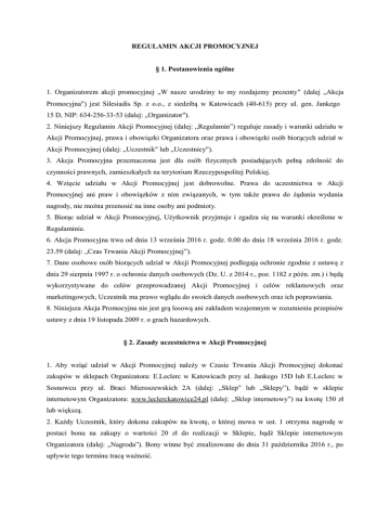 REGULAMIN AKCJI PROMOCYJNEJ § 1. Postanowienia ogólne 1. Organizatorem akcji promocyjnej „W nasze urodziny to my rozdajemy prezenty” (dalej „Akcja Promocyjna") jest Silesiadis Sp. z o.o., z siedzibą w Katowicach (40-615) przy ul. gen. Jankego 15 D, NIP: 634-256-33-53 (dalej: „Organizator"). 2. Niniejszy Regulamin Akcji Promocyjnej (dalej: „Regulamin”) reguluje zasady i warunki udziału w Akcji Promocyjnej, prawa i obowiązki Organizatora oraz prawa i obowiązki osób biorących udział w Akcji Promocyjnej (dalej: „Uczestnik" lub „Uczestnicy"). 3. Akcja Promocyjna przeznaczona jest dla osób fizycznych posiadających pełną zdolność do czynności prawnych, zamieszkałych na terytorium Rzeczypospolitej Polskiej. 4. Wzięcie udziału w Akcji Promocyjnej jest dobrowolne. Prawa do uczestnictwa w Akcji Promocyjnej ani praw i obowiązków z nim związanych, w tym także prawa do żądania wydania nagrody, nie można przenosić na inne osoby ani podmioty. 5. Biorąc udział w Akcji Promocyjnej, Użytkownik przyjmuje i zgadza się na warunki określone w Regulaminie. 6. Akcja Promocyjna trwa od dnia 13 września 2016 r. godz. 0.00 do dnia 18 września 2016 r. godz. 23.59 (dalej: „Czas Trwania Akcji Promocyjnej”). 7. Dane osobowe osób biorących udział w Akcji Promocyjnej podlegają ochronie zgodnie z ustawą z dnia 29 sierpnia 1997 r. o ochronie danych osobowych (Dz. U. z 2014 r., poz. 1182 z późn. zm.) i będą wykorzystywane do celów przeprowadzanej Akcji Promocyjnej i celów reklamowych oraz marketingowych, Uczestnik ma prawo wglądu do swoich danych osobowych oraz ich poprawiania. 8. Niniejsza Akcja Promocyjna nie jest grą losową ani zakładem wzajemnym w rozumieniu przepisów ustawy z dnia 19 listopada 2009 r. o grach hazardowych. § 2. Zasady uczestnictwa w Akcji Promocyjnej 1. Aby wziąć udział w Akcji Promocyjnej należy w Czasie Trwania Akcji Promocyjnej dokonać zakupów w sklepach Organizatora: E.Leclerc w Katowicach przy ul. Jankego 15D lub E.Leclerc w Sosnowcu przy ul. Braci Mieroszewskich 2A (dalej: „Sklep” lub „Sklepy”), bądź w sklepie internetowym Organizatora: www.leclerckatowice24.pl (dalej: „Sklep internetowy”) na kwotę 150 zł lub większą. 2. Każdy Uczestnik, który dokona zakupów na kwotę, o której mowa w ust. 1 otrzyma nagrodę w postaci bonu na zakupy o wartości 20 zł do realizacji w Sklepie, bądź Sklepie internetowym Organizatora (dalej: „Nagroda”). Bony winne być zrealizowane do dnia 31 października 2016 r., po upływie tego terminu tracą ważność. 3. Do kwoty uprawniającej do otrzymania Nagrody, o której mowa w ust. 1 nie wlicza się wartości zakupionych w Sklepie następujących produktów: 1) napojów alkoholowych w rozumieniu art. 46 ust. 1 ustawy z dnia 26 października 1982 r. o wychowaniu w trzeźwości i przeciwdziałaniu alkoholizmowi (Dz. U. z 2016 r. poz. 487 z późn. zm.); 2) wyrobów tytoniowych, papierosów elektronicznych, pojemników zapasowych lub rekwizytów tytoniowych w rozumieniu ustawy z dnia 9 listopada 1995 r. o ochronie zdrowia przed następstwami używania tytoniu i wyrobów tytoniowych (Dz. U z 2015 r., poz. 298 z późn. zm.); 3) produktów leczniczych w rozumieniu art. 2 pkt 32 ustawy Prawo farmaceutyczne (Dz. U. z 2008 r. Nr 45, poz. 271 z późn. zm.); 4) preparatów do początkowego żywienia niemowląt oraz przedmiotów służących do karmienia niemowląt w rozumieniu ustawy z dnia 25 sierpnia 2006 r. o bezpieczeństwie żywności i żywienia (Dz. U. z 2015 r. poz. 594 z późn. zm.). 4. Wartość produktów, o których mowa w art. 3 nie jest wliczana do kwoty koniecznej do uzyskania Nagrody. 5. Nagroda zostaje przekazana Uczestnikowi: 1) w Punkcie Obsługi Klienta w Sklepie po okazaniu paragonu – w przypadku zakupów dokonywanych w Sklepach, 2) przez kuriera doręczającego zakupy – w przypadku zakupów dokonywanych w Sklepie internetowym. 6. W przypadku gdy Uczestnik dokona zakupów na kwotę stanowiącą wielokrotność kwoty 150 zł, otrzyma on Nagrodę za każde kolejne pełne wydane 150 zł. 7. W przypadku zwrotu produktów, przy zakupie których Uczestnik otrzymał Nagrodę, jest on również zobowiązany do zwrotu Nagrody, jeżeli suma pozostałych zakupów nie przekracza kwoty 150 zł. 8. Bon nie może zostać zrealizowany w celu zakupu produktów, o których mowa w ust. 3. § 3. Reklamacje 1. Ewentualne reklamacje można zgłaszać na piśmie, do dnia 26 września 2016 r., listem poleconym na adres Organizatora, bądź e-mailem: [email protected]. O zachowaniu terminu do wniesienia reklamacji decyduje data stempla pocztowego. 2. Reklamacje rozpatruje Organizator w terminie 14 dni od jej otrzymania. § 4. Postanowienia końcowe 1. Regulamin dostępny jest do wglądu w siedzibie Organizatora oraz na stronach internetowych: www. katowice.e-leclerc.pl, www. sosnowiec.e-leclerc.pl, www.leclerckatowice24.pl. 2. Organizator zastrzega sobie prawo zmiany postanowień Regulaminu w przypadku zmian przepisów prawnych lub innych zdarzeń mających wpływ na organizowanie Akcji Promocyjnej. Zmienione warunki Regulaminu zostaną udostępnione w siedzibie Organizatora i na stronach internetowych: www. katowice.e-leclerc.pl, www. sosnowiec.e-leclerc.pl, www.leclerckatowice24.pl. najpóźniej w dniu wejścia w życie zmienionego Regulaminu 3. W sprawach nieuregulowanych w Regulaminie zastosowanie mają odpowiednie powszechnie obowiązujące przepisy. 4. Wzięcie udziału w Akcji Promocyjnej oznacza zapoznanie się Uczestnika z Regulaminem i zaakceptowanie jego warunków. 5. Organizator zastrzega sobie prawo zmiany Regulaminu. 6. Sytuacje nie objęte niniejszym Regulaminem oraz wątpliwości co do jego treści rozstrzyga Organizator.