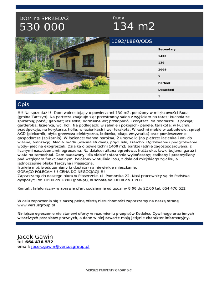 Ruda DOM na SPRZEDAŻ 134 m2 530 000 1092/1880/ODS Secondary 1400 130 2009 5 Perfect Detached 1 Opis !!!! Na sprzedaż !!! Dom wolnostojący o powierzchni 130 m2, położony w miejscowości Ruda (gmina Tarczyn). Na parterze znajduje się: przestronny salon z wyjściem na taras; kuchnia ze spiżarnią; pokój; gabinet; łazienka; oddzielne wc; przedpokój i korytarz. Na poddaszu: 3 pokoje; garderoba; łazienka, wc, holl. Na podłogach: w salonie i pokojach- panele, terakota; w kuchni, przedpokoju, na korytarzu, hollu, w łazienkach i wc- terakota. W kuchni meble w zabudowie, sprzęt AGD (piekarnik, płyta grzewcza elektryczna, lodówka, okap, zmywarka) oraz pomieszczenie gospodarcze (spiżarnia). W łazience: wanna narożna, 2 umywalki (na piętrze: łazienka i wc- do własnej aranżacji). Media: woda (własna studnia); prąd; siła; szambo. Ogrzewanie i podgrzewanie wody- piec na ekogroszek. Działka o powierzchni 1400 m2; bardzo ładnie zagospodarowana, z licznymi nasadzeniami; ogrodzona. Na działce: altana ogrodowa, huśtawka, ławki bujane; garaż i wiata na samochód. Dom budowany "dla siebie"; starannie wykończony; zadbany i przemyślany pod względem funkcjonalnym. Położony w otulinie lasu, z dala od miejskiego zgiełku, a jednocześnie blisko Tarczyna i Piaseczna. Istnieje możliwość zamiany (z dopłatą) na niewielkie mieszkanie. GORĄCO POLECAM !!! CENA DO NEGOCJACJI !!! Zapraszamy do naszego biura w Piasecznie, ul. Pomorska 22. Nasi pracownicy są do Państwa dyspozycji od 10:00 do 18:00 (pon-pt), w sobotę od 10:00 do 13:00. Kontakt telefoniczny w sprawie ofert codziennie od godziny 8:00 do 22:00 tel. 664 476 532 W celu zapoznania się z naszą pełną ofertą nieruchomości zapraszamy na naszą stronę www.versusgroup.pl Niniejsze ogłoszenie nie stanowi oferty w rozumieniu przepisów Kodeksu Cywilnego oraz innych właściwych przepisów prawnych, a dane w niej zawarte mają jedynie charakter informacyjny. Jacek Gawin tel. 664 476 532 email: [email protected] VERSUS PROPERTY GROUP S.C. Powered by TCPDF (www.tcpdf.org)