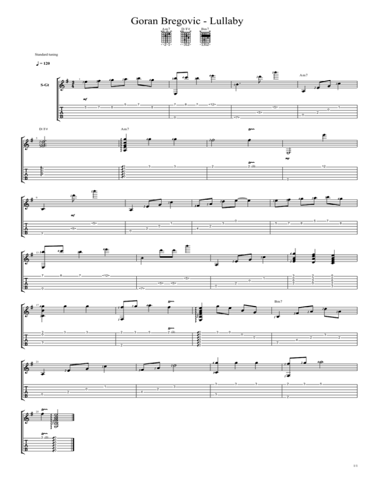 Goran Bregovic - Lullaby Am7 D/ F# Bm7 - -2-1- - - 312 - - 1312 - Standard tuning = 120 Am7 1 S-Gt 5 7 5 8 7 7 8 8 7 <12> <5> <5> 0 D/ F# Am7 3 2 4 3 1 0 2 0 <7> 1 0 2 0 5 3 3 2 (3) 2 12 0 9 <5> <5> 0 7 0 2 1 0 3 2 4 5 7 5 8 7 8 13 7 8 7 <12> <5> <5> 0 <5> 0 <7> 3 0 0 2 1 0 2 2 3 2 0 0 0 0 2 3 Bm7 17 3 0 3 3 2 3 3 2 (3) 5 2 0 0 0 2 2 0 3 0 0 0 2 3 2 4 2 21 2 0 0 1 4 2 3 3 3 3 3 2 3 5 2 25 2 (3) 0 0 0 2 2 0 1/1