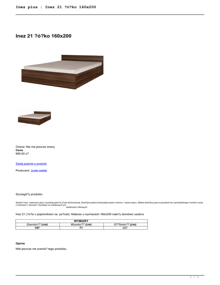 Inez plus : Inez 21 ?ó?ko 160x200 Inez 21 ?ó?ko 160x200 Ocena: Nie ma jeszcze oceny Cena 685,00 z? Zadaj pytanie o produkt Producent: Jurek meble Szczegó?y produktu System Inez wykonany jest z wysokiej jako?ci p?yty laminowanej. Dost?pna jedna kolorystyka jesion ciemny + jesion jasny. Mebel dost?pny jest w paczkach do samodzielnego monta?u wraz z instrukcj? i okuciami. Szuflady na metalowych pro wadnicach rolkowych. Inez 21 (?o?e z pojemnikiem na po?ciel) Materac o wymiarach 160x200 nale?y domówic osobno Szeroko?? (cm) 167 WYMIARY Wysoko?? (cm) 71 G??boko?? (cm) 207 Opinie Nikt jeszcze nie ocenia? tego produktu. 1 / 1 Powered by TCPDF (www.tcpdf.org)