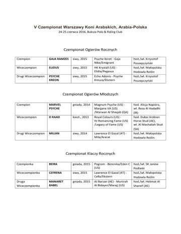 V Czempionat Warszawy Koni Arabskich, Arabia-Polska 24-25 czerwca 2016, Buksza Polo & Riding Club Czempionat Ogierów Rocznych Czempion GAJA RAMZES siwy, 2015 Psyche Keret - Gaja Nike/Emigrant Wiceczempion ELIDUS siwy, 2015 HK Krystall (US) Elidia/Pegasus Drugi Wiceczempion PSYCHE KREON siwy, 2015 Echo Adonis - Psyche Kreuza/Ekstern hod./wł. Krzysztof Poszepczyński hod./wł. Małopolska Hodowla Roślin hod./wł. Krzysztof Poszepczyński Czempionat Ogierów Młodszych Czempion MARVEL PSYCHE gniady, 2014 Magnum Psyche (US) Marjjana VA (US) /Marwan Al Shaqab (QA) Wiceczempion D RAAD kaszt., 2013 Royal Colours (US) HJ Romancing Fame (US) /Legacy of Fame (US) Drugi Wiceczempion MILIAN siwy, 2014 Lawrence El Gazal (AT) Mila/Ararat hod. Alicja Napióra, wł. Reza Al Hadadhi (IR) hod. Dubai Arabian Horse Stud (AE), wł. Al Mashaliah Stud (SA) hod./wł. Małopolska Hodowla Roślin Czempionat Klaczy Rocznych Czempionka BEIRA gniada, 2015 Pogrom - Berenika/Eden C (US) Wiceczempionka CEFRENA siwa, 2015 Lawrence El Gazal (AT) Cella/Ekstern Druga Wiceczempionka MANARET BABEL gniada, 2015 AJ Barzan (AE) - Munirah Al Bidayer/Marajj (US) hod./wł. SK Janów Podlaski hod./wł. Małopolska Hodowla Roślin hod./wł. Hekmat Al Shareif (AE) Czempionat Klaczy Młodszych Czempionka Wiceczempionka Druga Wiceczempionka PUSTYNIA KAHILA CELITA gniada, 2013 EL LARINERA gniada, 2014 gniada, 2014 Kahil Al Shaqab (QA) Pustynna Malwa Lawrence El Gazal (AT) Cella/Ekstern Empire - El Emeera /Ekstern hod./wł. SK Michałów hod./wł. Malopolska Hodowla Roślin hod./wł. SK Michałów Czempionat Ogierów Starszych Czempion GIRLAN-BEY siwy, 2002 Pesal Gracja/Bis/Monogramm (US) Wiceczempion PSYCHE ULL siwy, 2012 Forteynas Magic (US) Psyche Victoria/Ekstern Drugi Wiceczempion AL DJAMAL siwy, 2010 WH Justice (US) - Djasira Princess Psytadel /Psytadel (US) hod. M. Bogajewicz. wł. Kristoffersen Family hod./wł. Krzysztof Poszepczyński hod. Claudia Polte Welbers, wł. Ali Jassim (BH) Czempionat Klaczy Starszych Czempionka PSYCHE VICTORIA siwa, 2006 Ekstern - PallasAtena/Ecaho Wiceczempionka ANAWERA siwa, 2012 Piaff - Altamira/Ekstern Druga Wiceczempionka ESHRAK AL KAHERAH gniada, 2010 Mirajh RCA - El Sayyeda/Imperial Baarez Best in Show PSYCHE VICTORIA hod./wł. Krzysztof Poszepczyński hod./wł. SK Janów Podlaski hod.: Al Kaherah Stud (EG) wł.: Rabab Stud (EG)