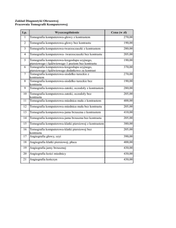 Zakład Diagnostyki Obrazowej Pracownia Tomografii Komputerowej Lp. Wyszczególnienie Cena (w zł) 1 Tomografia komputerowa-głowy z kontrastem 270,00 2 Tomografia komputerowa-głowy bez kontrastu 190,00 3 Tomografia komputerowa-twarzoczaszki z kontrastem 280,00 4 Tomografia komputerowa- twarzoczaszki bez kontrastu 205,00 5 Tomografia komputerowa-kregosłupa szyjnego, piersiowego i lędźwiowego 1 poziom bez kontrastu Tomografia komputerowa-kregosłupa szyjnego, piersiowego i lędźwiowego dodatkowo za kontrast Tomografia komputerowa-siodełko tureckie z kontrastem Tomografia komputerowa-siodełko tureckie bez kontrastu Tomografia komputerowa-zatoki, oczodoły z kontrastem 190,00 6 7 8 9 370,00 270,00 190,00 280,00 10 Tomografia komputerowa-zatoki, oczodoły bez kontrastu 11 Tomografia komputerowa-miednica mała z kontrastem 205,00 12 Tomografia komputerowa-miednica mała bez kontrastu 205,00 13 Tomografia komputerowa-jama brzuszna z kontrastem 410,00 14 Tomografia komputerowa-jama brzuszna bez kontrastu 205,00 15 Tomografia komputerowa-klatki piersiowej z kontrastem 380,00 16 Tomografia komputerowa-klatki piersiowej bez kontrastu 17 Angiografia głowy, szyi 205,00 18 Angiografia klatki piersiowej, płuca 400,00 19 Angiografia jamy brzusznej 430,00 20 Angiografia kości miednicy 430,00 21 Angiografia kończyn 430,00 400,00 390,00