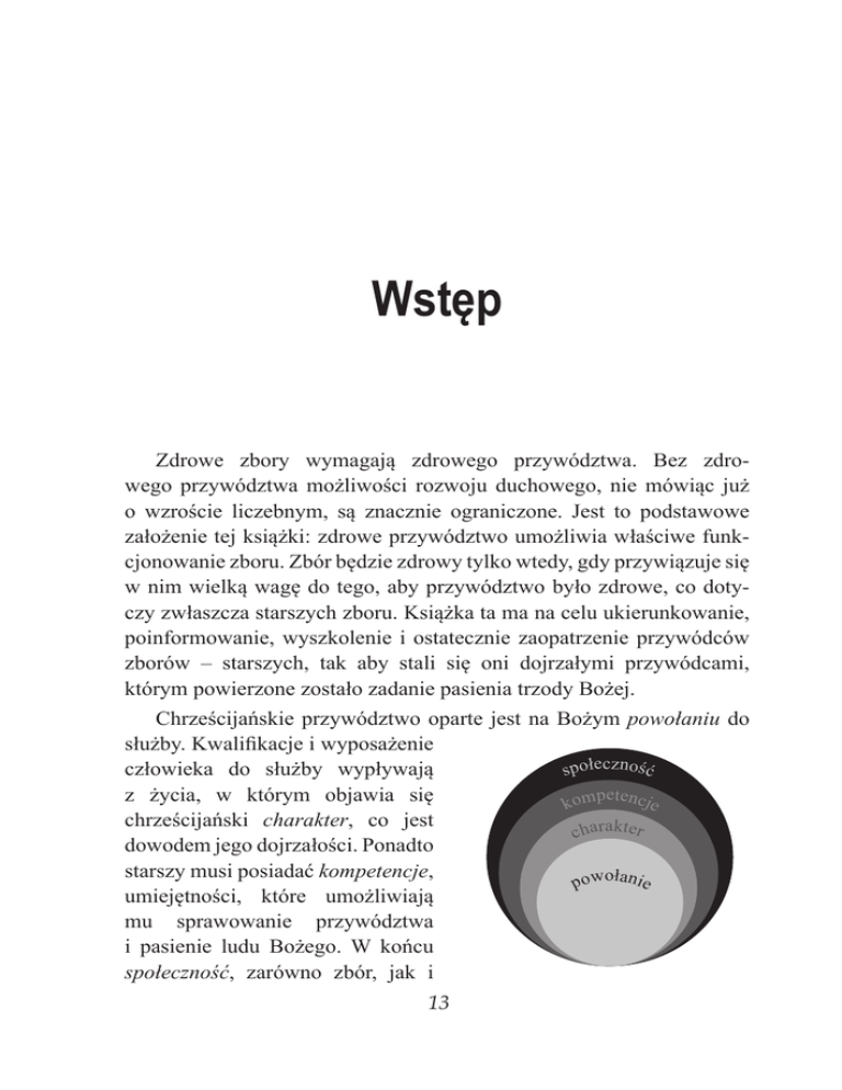 Wstęp Zdrowe zbory wymagają zdrowego przywództwa. Bez zdrowego przywództwa możliwości rozwoju duchowego, nie mówiąc już o wzroście liczebnym, są znacznie ograniczone. Jest to podstawowe założenie tej książki: zdrowe przywództwo umożliwia właściwe funkcjonowanie zboru. Zbór będzie zdrowy tylko wtedy, gdy przywiązuje się w nim wielką wagę do tego, aby przywództwo było zdrowe, co dotyczy zwłaszcza starszych zboru. Książka ta ma na celu ukierunkowanie, poinformowanie, wyszkolenie i ostatecznie zaopatrzenie przywódców zborów – starszych, tak aby stali się oni dojrzałymi przywódcami, którym powierzone zostało zadanie pasienia trzody Bożej. Chrześcijańskie przywództwo oparte jest na Bożym powołaniu do służby. Kwalifikacje i wyposażenie człowieka do służby wypływają społeczność petencje z życia, w którym objawia się kom chrześcijański charakter, co jest charakter dowodem jego dojrzałości. Ponadto starszy musi posiadać kompetencje, powołanie umiejętności, które umożliwiają mu sprawowanie przywództwa i pasienie ludu Bożego. W końcu społeczność, zarówno zbór, jak i 13 jego kontekst społeczny stanowią obszar, gdzie starszy może służyć, będąc przywódcą w społeczności wierzących, i osobą składającą świadectwo w otaczającym go środowisku. Wszystkie cztery aspekty są niezbędne dla chrześcijańskiego przywództwa, umożliwiając mu niezbędną efektywność; żaden z nich nie jest opcjonalny. O całej serii Książka ta jest pierwszym tomem czterotomowej serii książek poświęconych przywództwu starszych w zborach, wydanych przez College Press w latach 2009–2011. Poszczególne książki noszą następujące tytuły: Answer: His Call (Odpowiedz na Jego powołanie); Reflect: His Character (Odzwierciedlaj Jego charakter); Lead: His Church (Prowadź Jego Kościół) i Enjoy: His People (Ciesz się Jego ludem). Te cztery tomy odnoszą się do czterech podstawowych komponentów chrześcijańskiego przywództwa, które zostały wcześniej przedstawione. Książki te nie są naukowymi traktatami dotyczącymi funkcjonowania urzędu starszych. Z założenia mają być użytecznymi przewodnikami, które wykorzystując praktyczne i naukowe spostrzeżenia, stanowią „vademecum” starszego zboru. Każdy rozdział celowo jest krótki i kończy się skłaniającymi do refleksji pytaniami, które mogą służyć do użytku własnego albo mogą być pomocą Książki te nie są w nauczaniu i zaopatrywaniu do służby naukowymi traktatami siebie nawzajem. W tym tomie, tomie dotyczącymi pierwszym, zajmiemy się tematem funkcjonowania urzędu Bożego powołania do służby starstarszych. szego jako przywódcy zboru. Rozdział pierwszy podejmuje zagadnienie istoty powołania w życiu przywódcy zboru. Rozdział drugi dotyczy tematu duchowego nawrócenia i przeobrażenia koniecznego w życiu starszego. W rozdziale trzecim przedstawione są kwalifikacje starszego, a w rozdziale czwartym – modele procesu wyboru starszego. W rozdziale piątym, nakreślając rolę i funkcję starszych w zborze, przedstawia się ideę zarządzania sprawowanego przez starszych. Ostatni rozdział omawia wartość i znaczenie odpowiedzialności starszych przed innymi starszymi w aspekcie duchowym i pastoralnym, z uwzględnieniem wzajemnej oceny. 14 Odpowiedz na Jego powołanie Książka ta może być wykorzystana na dwa sposoby. Po pierwsze, może być ona wykorzystana do osobistego studium. Starszy zboru może ją czytać w celu poszerzenia swojej wiedzy i osobistego zbudowania. Możesz być nowym starszym albo doświadczonym przywódcą, który poszukuje dodatkowej perspektywy i spostrzeżeń. Niezależnie od tego pytania znajdujące się na końcu każdego rozdziału mogą pomóc Ci w tym, byś jako chrześcijanin i starszy zboru zastosował zawarte w nich nauczanie w Twoim życiu. Drugi sposób, w jaki ta książka może być wykorzystana, dotyczy wszystkich starszych w społeczności. Każdy starszy może przeczytać tę książkę, rozważyć indywidualne pytania do zastosowania, a następnie skorzystać z grupowych pytań do przemyślenia (które również znajdują się na końcu rozdziałów), co może stanowić podstawę do dyskusji na spotkaniu starszych. Mamy nadzieję, że w obu tych przypadkach – czy jako studium osobiste, czy też grupowe – książka ta okaże się przydatna w Twoim życiu i służbie. O autorach Książka Answer: His Call (Odpowiedz na Jego powołanie) nie jest dziełem jednego autora. Jest ona owocem niezależnej pracy trzech autorów współpracujących ze sobą i omawiających wspólnie swoje różnorodne doświadczenia i punkty widzenia. Jeden z autorów jest nauczycielem akademickim (James Estep, po lewej stronie), drugi jest doradcą Kościoła (David Roadcup, w środku), a ostatni z nich jest pracownikiem Kościoła (Gary Johnson). Chociaż wszyscy trzej znali się osobiście już od dłuższego czasu, to dopiero ich wspólny pobyt w Heiligenkreuz w Austrii, gdzie nauczali studentów z Europy Wschodniej i Azji Środkowej w Haus Edelweiss (TCMI), sprawił, że po raz pierwszy wszyscy trzej usiedli razem i podzielili się swoją troską dotyczącą zdrowia zborów i ich przywództwa. W czasie rozmów przy kawie zrodziła się idea napisania tej serii książek, których myślą przewodnią jest wzmocnienie starszych jako przywódców zborów. Wstęp 15 Chociaż poszczególni autorzy podjęli się napisania przydzielonych sobie rozdziałów, ostateczna forma każdego rozdziału powstała w wyniku wspólnego rozważenia jego treści i ponownego jego opracowaJesteśmy przekonani, nia przez wszystkich trzech autorów, że zdrowe przywództwo którzy spotkali się w Indianopolis buduje zdrową wspólnotę w Indianie. Tak więc projekt ten jest dziełem trzech autorów i ma stanowić pomoc dla przywódców zborów, którzy służą jako starsi Kościoła. Modlimy się za Ciebie i członków Twojego zboru,