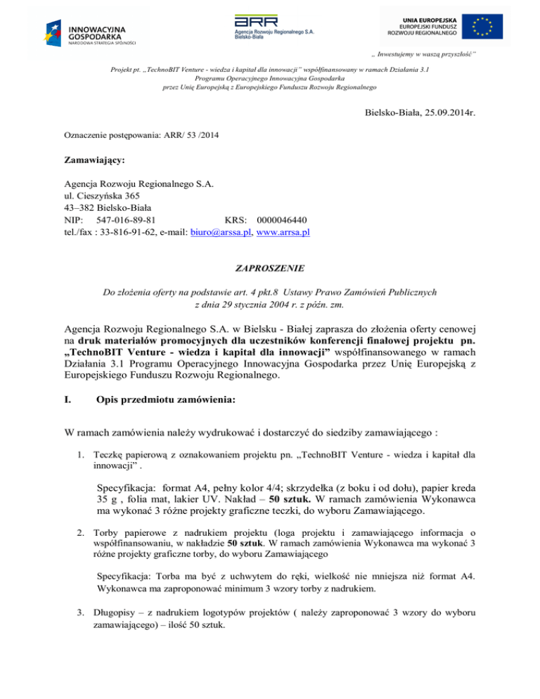 „ Inwestujemy w waszą przyszłość” Projekt pt. „TechnoBIT Venture - wiedza i kapitał dla innowacji” współfinansowany w ramach Działania 3.1 Programu Operacyjnego Innowacyjna Gospodarka przez Unię Europejską z Europejskiego Funduszu Rozwoju Regionalnego Bielsko-Biała, 25.09.2014r. Oznaczenie postępowania: ARR/ 53 /2014 Zamawiający: Agencja Rozwoju Regionalnego S.A. ul. Cieszyńska 365 43–382 Bielsko-Biała NIP: 547-016-89-81 KRS: 0000046440 tel./fax : 33-816-91-62, e-mail: [email protected], www.arrsa.pl ZAPROSZENIE Do złożenia oferty na podstawie art. 4 pkt.8 Ustawy Prawo Zamówień Publicznych z dnia 29 stycznia 2004 r. z późn. zm. Agencja Rozwoju Regionalnego S.A. w Bielsku - Białej zaprasza do złożenia oferty cenowej na druk materiałów promocyjnych dla uczestników konferencji finałowej projektu pn. „TechnoBIT Venture - wiedza i kapitał dla innowacji” współfinansowanego w ramach Działania 3.1 Programu Operacyjnego Innowacyjna Gospodarka przez Unię Europejską z Europejskiego Funduszu Rozwoju Regionalnego. I. Opis przedmiotu zamówienia: W ramach zamówienia należy wydrukować i dostarczyć do siedziby zamawiającego : 1. Teczkę papierową z oznakowaniem projektu pn. „TechnoBIT Venture - wiedza i kapitał dla innowacji” . Specyfikacja: format A4, pełny kolor 4/4; skrzydełka (z boku i od dołu), papier kreda 35 g , folia mat, lakier UV. Nakład – 50 sztuk. W ramach zamówienia Wykonawca ma wykonać 3 różne projekty graficzne teczki, do wyboru Zamawiającego. 2. Torby papierowe z nadrukiem projektu (loga projektu i zamawiającego informacja o współfinansowaniu, w nakładzie 50 sztuk. W ramach zamówienia Wykonawca ma wykonać 3 różne projekty graficzne torby, do wyboru Zamawiającego Specyfikacja: Torba ma być z uchwytem do ręki, wielkość nie mniejsza niż format A4. Wykonawca ma zaproponować minimum 3 wzory torby z nadrukiem. 3. Długopisy – z nadrukiem logotypów projektów ( należy zaproponować 3 wzory do wyboru zamawiającego) – ilość 50 sztuk. „ Inwestujemy w waszą przyszłość” Projekt pt. „TechnoBIT Venture - wiedza i kapitał dla innowacji” współfinansowany w ramach Działania 3.1 Programu Operacyjnego Innowacyjna Gospodarka przez Unię Europejską z Europejskiego Funduszu Rozwoju Regionalnego 4. Zaproszenia na konferencje wraz kopertami: format A-4 , papier kreda lub inny stosowny do okoliczności. Nakład – 50 sztuk. W ramach zamówienia Wykonawca ma wykonać 3 różne projekty graficzne zaproszeń, do wyboru Zamawiającego 5. Druk Prezentacji – łącznie ok. 20 stron w kolorze, format A-4. Nakład – 50 kompletów. II. Warunki udzielenia zamówienia W zamówieniu mogą uczestniczyć Oferenci, którzy: 1. Zapewnią wykonanie wszystkich w/w działań. 2. Posiadają doświadczenie i dysponują potencjałem osobowym i technicznym do wykonania zamówienia. Dla potwierdzenie powyższego warunku należy załączyć do oferty wykaz wykonanych usług w ciągu ostatnich 12 miesięcy, polegających na druku materiałów konferencyjnych. Dla spełnienia w/w warunku należy wykazać się wykonaniem minimum 5 w/w zamówień w okresie minionego roku. Oferty nie spełniające w/w warunku nie będą rozpatrywane. 3. Zamawiający nie dopuszcza złożenia ofert częściowych. 4. Zamówienie należy wykonać w terminie 5 dni roboczych, licząc od daty otrzymania materiałów od Zamawiającego. W przypadku nie dotrzymania terminu, zamawiający naliczy Wykonawcy karę umowną. 5. Ofertę należy złożyć na formularzu oferty cenowej (Załącznik nr 1) w wyznaczonym terminie, zawierającą następujące informacje: nazwę i adres oferenta, cena netto/brutto za wykonanie całość zamówienia, termin płatności oraz osobę i telefon do kontaktu. 6. Cenę (netto/brutto) należy podać w złotych polskich cyfrowo, do dwóch miejsc po przecinku oraz słownie. Cena stanowi całkowity koszt Oferenta za jaki zobowiązuje się wykonać całość usługi. IV. Oferta winna zawierać: 1. Cenę netto i brutto wykonania całości zamówienia. 2. Wykaz wykonanych usług wykonanych w ciągu ostatniego roku. V. Kryteria wyboru najkorzystniejszej oferty: O wyborze najkorzystniejszej oferty będą decydowały najniższa cena oraz doświadczenie oferenta. Cena – waga - 70 % W zakresie kryterium „ceny”, ocena ofert będzie przeprowadzona w oparciu o wyliczenie na podstawie wzoru matematycznego: „ Inwestujemy w waszą przyszłość” Projekt pt. „TechnoBIT Venture - wiedza i kapitał dla innowacji” współfinansowany w ramach Działania 3.1 Programu Operacyjnego Innowacyjna Gospodarka przez Unię Europejską z Europejskiego Funduszu Rozwoju Regionalnego Najniższa oferowana cena oferty C = x 70 pkt. Cena oferty badanej Doświadczenie Wykonawcy – waga – 30 pkt. W zakresie kryterium „Doświadczenie Wykonawcy”, oferty będą oceniane na podstawie informacji przedstawionych w ofercie Wykonawca – wykaz wykonanych usług. Punkty będą przyznawane według zasady wyliczenia z proporcji, mając na uwadze wszystkie oferty nie podlegające odrzuceniu. VI. Termin i miejsce złożenia oferty: Pisemną ofertę należy złożyć w siedzibie Agencji Rozwoju Regionalnego S.A. przy ul. Cieszyńskiej 365 w Bielsku-Białej (sekretariat Biura Zarządu na II piętrze) w terminie do 6 października 2014 r. do godz. 12.00 z dopiskiem „Oferta na druk materiałów konferencyjnych projektu „TechnoBIT Venture – wiedza i kapitał dla innowacji”. Zamawiający nie dopuszcza przesłania oferty faksem lub e-mailem. VII. Dodatkowe informacje: Dodatkowych informacji w sprawie przedmiotu zamówienia udziela: Elżbieta Szczerba, e-mail: [email protected], tel./fax 33/816-91-62. W załączeniu wzór formularza oferty. mgr Maria Socha Prokurent ARR S.A