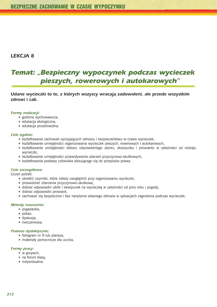 BEZPIECZNE ZACHOWANIE W CZASIE WYPOCZYNKU LEKCJA 8 Temat: „Bezpieczny wypoczynek podczas wycieczek pieszych, rowerowych i autokarowych” Udane wycieczki to te, z których wszyscy wracają zadowoleni, ale przede wszystkim zdrowi i cali. Formy realizacji: • godzina wychowawcza, • edukacja ekologiczna, • edukacja prozdrowotna. Cele ogólne: • kszta³towanie • kszta³towanie • kszta³towanie wycieczki, • kszta³towanie • kszta³towanie zachowañ sprzyjaj¹cych zdrowiu i bezpieczeñstwu w czasie wycieczek, umiejêtnoœci organizowania wycieczek pieszych, rowerowych i autokarowych, umiejêtnoœci doboru odpowiedniego ubioru, ekwipunku i prowiantu w zale¿noœci od rodzaju umiejêtnoœci przewidywania zdarzeñ przyczynowo-skutkowych, postawy cz³owieka stosuj¹cego siê do przepisów prawa. Cele szczegółowe: Uczeñ potrafi: • okreœliæ czynniki, które nale¿y uwzglêdniæ przy organizowaniu wycieczki, • przewidzieæ zdarzenia przyczynowo-skutkowe, • dobraæ odpowiedni ubiór i ekwipunek na wycieczkê w zale¿noœci od pory roku i pogody, • dobraæ odpowiedni prowiant, • zachowaæ siê bezpiecznie i bez nara¿ania w³asnego zdrowia w sytuacjach zagro¿enia podczas wycieczek. Metody nauczania: • pogadanka, • pokaz, • dyskusja, • æwiczeniowa. Pomoce dydaktyczne: • foliogram nr 9 lub plansza, • materia³y pomocnicze dla ucznia. Formy pracy: • w grupach, • na forum klasy, • indywidualna. 212 MODUŁ IV PLAN ZAJĘĆ: 1. Nauczyciel zwraca uwagê uczniów na zdjêcia w æwiczeniach 1 - 3. Uczniowie okreœlaj¹, jaki rodzaj wycieczki (piesza, rowerowa czy autokarowa) jest przedstawiony na zdjêciach. 2. Nastêpnie dzieli klasê na 3 grupy. Ka¿da grupa przygotowuje siê do udzia³u w tego rodzaju wycieczce, któr¹ wylosuje spoœród wspomnianych zdjêæ. Przy opracowywaniu ka¿da grupa korzysta z wyników pracy z poprzedniej lekcji (Lekcja 7 - æwiczenia 3, 5). Uczniowie dostosowuj¹ prezentowany tam materia³ do rodzaju wycieczki, uzupe³niaj¹c brakuj¹ce elementy. 3. Przedstawiciele poszczególnych grup prezentuj¹ wyniki prac na forum klasy. 4. Uczniowie zapisuj¹ wyniki prac w æwiczeniach 1, 2, 3. 5. Nauczyciel prezentuje foliogram nr 9 i wymienia najczêstsze zagro¿enia wystêpuj¹ce na wycieczkach omawiaj¹c przy tym ich istotê oraz wspólnie z uczniami zastanawia siê, jak uchroniæ siê przed nimi. Nastêpnie wraz z uczniami ustala, jakiego typu wycieczek one dotycz¹. 6. Nauczyciel og³asza konkurs na najlepszy plakat pt. „Bezpieczna wycieczka” przestrzegaj¹cy przed zagro¿eniami na wycieczce. Technika prac – dowolna. Czas wykonania – 2 tygodnie. Najlepsze prace prezentowane bêd¹ np. na forum szko³y. 213 BEZPIECZNE ZACHOWANIE W CZASIE WYPOCZYNKU MATERIAŁY POMOCNICZE DLA UCZNIA – LEKCJA 8 Temat: „Bezpieczny wypoczynek podczas wycieczek pieszych, rowerowych i autokarowych” Udane wycieczki to te, z których wszyscy wracają zadowoleni, ale przede wszystkim zdrowi i cali. Ćwiczenie 1 Uzupe³nij niezbêdnik wycieczkowy na wycieczce pieszej o ustalone na forum klasy wspólnie z nauczycielem dodatkowe elementy uwzglêdniaj¹ce specyfikê tego rodzaju wycieczki. Wykorzystaj æwiczenia 3 i 5 z lekcji 7. NIEZBĘDNIK WYCIECZKOWY – ubiór i wyposażenie: – ................................................................................................................................................................. – ................................................................................................................................................................. – ................................................................................................................................................................. – ................................................................................................................................................................. – ................................................................................................................................................................. – ................................................................................................................................................................. – ................................................................................................................................................................. 214 MODUŁ IV – ................................................................................................................................................................. – ................................................................................................................................................................. – ................................................................................................................................................................. – ................................................................................................................................................................. – ................................................................................................................................................................. – ................................................................................................................................................................. – ................................................................................................................................................................. – ................................................................................................................................................................. – ................................................................................................................................................................. – ......................................................