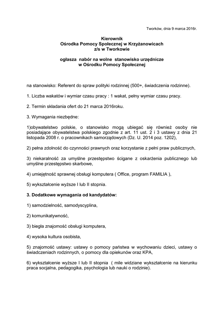 Tworków, dnia 9 marca 2016r. Kierownik Ośrodka Pomocy Społecznej w Krzyżanowicach z/s w Tworkowie ogłasza nabór na wolne stanowisko urzędnicze w Ośrodku Pomocy Społecznej na stanowisko: Referent do spraw polityki rodzinnej (500+, świadczenia rodzinne). 1. Liczba wakatów i wymiar czasu pracy : 1 wakat, pełny wymiar czasu pracy. 2. Termin składania ofert do 21 marca 2016roku. 3. Wymagania niezbędne: 1)obywatelstwo polskie, o stanowisko mogą ubiegać się również osoby nie posiadające obywatelstwa polskiego zgodnie z art. 11 ust. 2 i 3 ustawy z dnia 21 listopada 2008 r. o pracownikach samorządowych (Dz. U. 2014 poz. 1202), 2) pełna zdolność do czynności prawnych oraz korzystanie z pełni praw publicznych, 3) niekaralność za umyślne przestępstwo ścigane z oskarżenia publicznego lub umyślne przestępstwo skarbowe, 4) umiejętność sprawnej obsługi komputera ( Office, program FAMILIA ), 5) wykształcenie wyższe I lub II stopnia. 3. Dodatkowe wymagania od kandydatów: 1) samodzielność, samodyscyplina, 2) komunikatywność, 3) biegła znajomość obsługi komputera, 4) wysoka kultura osobista, 5) znajomość ustawy: ustawy o pomocy państwa w wychowaniu dzieci, ustawy o świadczeniach rodzinnych, o pomocy dla opiekunów oraz KPA, 6) wykształcenie wyższe I lub II stopnia ( mile widziane wykształcenie na kierunku praca socjalna, pedagogika, psychologia lub nauki o rodzinie). 4. Podstawowe zadania wykonywane na stanowisku: 1)obsługa interesantów, przyjmowanie wniosków oraz prowadzenie postępowań w sprawach o świadczenia rodzinne oraz świadczenie 500 + oraz przygotowanie projektów decyzji w przedmiotowych sprawach, 2) sporządzanie list wypłat w/w świadczeń, 3) sporządzanie sprawozdawczości z zakresu w/w świadczeń, 4) rozpoznawanie potrzeb i przedstawianie kierownikowi OPS zapotrzebowania na środki finansowe służące do zrealizowania w/w świadczeń, 5) ścisła współpraca z pracownikami OPS w zakresie służącym do prawidłowego rozpoznawania potrzeb oraz sytuacji rodzinnej i materialnej klientów, 6) prowadzenie niezbędnej dokumentacji oraz rejestrów, 7) wprowadzanie aktualizacji zainstalowanych programów, 8) umiejętność obsługi oprogramowania ( Familia, Fundal). służącego do realizacji świadczeń 5.Wymagane dokumenty 1) CV wraz z listem motywacyjnym, 2) kwestionariusz osobowy, 3) kopie dokumentów poświadczających posiadane wykształcenie oraz kwalifikacje, 4) kopie świadectw pracy lub w przypadku pozostawania w zatrudnieniu zaświadczenie dokumentujące staż pracy, 5) oświadczenie kandydata, o posiadaniu pełni zdolności do czynności prawnych, korzysta z pełni praw publicznych i nie był prawomocnie skazany za przestępstwo umyślne lub kopia aktualnego „Zapytania o udzielenie informacji o osobie” z Krajowego Rejestru Karnego 6) oświadczenie kandydata o przyjęciu do wiadomości faktu obowiązku publikacji w BIP danych osobowych - zgodnie z wymogami ustawy z 21 listopada 2008 r. o pracownikach samorządowych ( t.j. Dz. U z 2014 r. poz. 1202) 7) oświadczenie o wyrażeniu zgody na przetwarzanie danych osobowych przez OPS Krzyżanowice w zakresie niezbędnym do rekrutacji, 8)zaświadczenie lekarskie o braku przeciwwskazań zdrowotnych do pracy na w/w stanowisku. 6. Wskaźnik zatrudnienia osób niepełnosprawnych w Ośrodku Pomocy Społecznej w miesiącu poprzedzającym datę upublicznienia ogłoszenia wyniósł poniżej 6%. 7. Miejsce i termin złożenia dokumentów Oferty można składać osobiście lub drogą pocztową na adres: Ośrodek Pomocy Społecznej, ul Zamkowa 50, 47-451Tworków, w zamkniętej kopercie z dopiskiem: "Nabór na stanowisko referenta" do dnia 21 marca 2016 r. (decyduje data stempla pocztowego). Dodatkowe informacje o naborze można uzyskać pod numerem telefonu: 32 419 63 00. Informacje o przebiegu rekrutacji i jej wyniku zostanie umieszczona na tablicy ogłoszeń w Ośrodku Pomocy Społecznej w Krzyżanowicach z/s w Tworkowie oraz na stronie internetowej Urzędu Gminy Krzyżanowice w Biuletynie Informacji Publicznej www.bip.krzyzanowice.pl. 8..Dokumenty kandydata wybranego w naborze i zatrudnionego w Ośrodku Pomocy Społecznej zostaną dołączone do jego akt osobowych. 9.Dokumenty pozostałych kandydatów będą do odbioru osobistego w siedzibie OPS Krzyżanowice. Kierownik OPS w Krzyżanowicach z/s w Tworkowie Renata Reszka Tworków,dnia 9 marca 2016r.