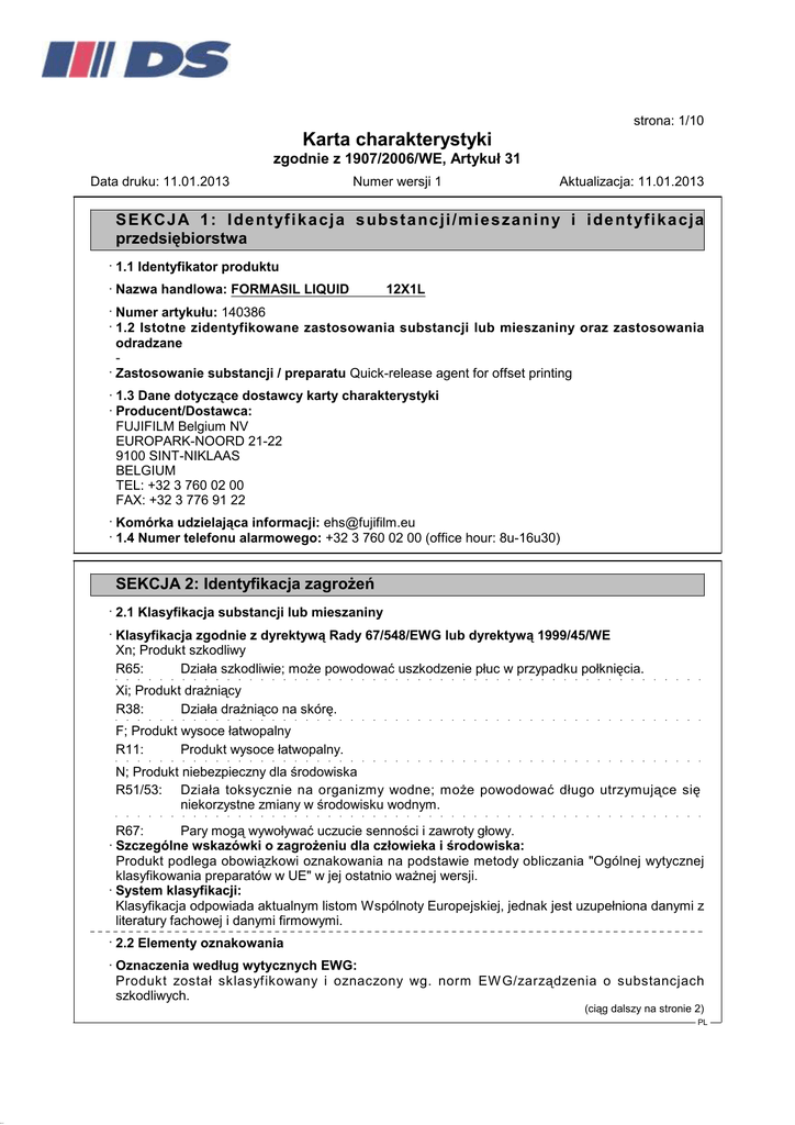 35.0.31 strona: 1/10 Karta charakterystyki zgodnie z 1907/2006/WE, Artykuł 31 Data druku: 11.01.2013 Numer wersji 1 Aktualizacja: 11.01.2013 S E K CJ A 1 : I de nt yf i k a c j a s ub s t a nc ji / m i e s z a ni n y i i de nt yfi k a c j a przedsiębiorstwa · 1.1 Identyfikator produktu · Nazwa handlowa: FORMASIL LIQUID 12X1L · Numer artykułu: 140386 · 1.2 Istotne zidentyfikowane zastosowania substancji lub mieszaniny oraz zastosowania odradzane · Zastosowanie substancji / preparatu Quick-release agent for offset printing · 1.3 Dane dotyczące dostawcy karty charakterystyki · Producent/Dostawca: FUJIFILM Belgium NV EUROPARK-NOORD 21-22 9100 SINT-NIKLAAS BELGIUM TEL: +32 3 760 02 00 FAX: +32 3 776 91 22 · Komórka udzielająca informacji: [email protected] · 1.4 Numer telefonu alarmowego: +32 3 760 02 00 (office hour: 8u-16u30) SEKCJA 2: Identyfikacja zagroŜeń · 2.1 Klasyfikacja substancji lub mieszaniny · Klasyfikacja zgodnie z dyrektywą Rady 67/548/EWG lub dyrektywą 1999/45/WE Xn; Produkt szkodliwy R65: Działa szkodliwie; moŜe powodować uszkodzenie płuc w przypadku połknięcia. Xi; Produkt draŜniący R38: Działa draŜniąco na skórę. F; Produkt wysoce łatwopalny R11: Produkt wysoce łatwopalny. N; Produkt niebezpieczny dla środowiska R51/53: Działa toksycznie na organizmy wodne; moŜe powodować długo utrzymujące się niekorzystne zmiany w środowisku wodnym. R67: Pary mogą wywoływać uczucie senności i zawroty głowy. · Szczególne wskazówki o zagroŜeniu dla człowieka i środowiska: Produkt podlega obowiązkowi oznakowania na podstawie metody obliczania "Ogólnej wytycznej klasyfikowania preparatów w UE" w jej ostatnio waŜnej wersji. · System klasyfikacji: Klasyfikacja odpowiada aktualnym listom Wspólnoty Europejskiej, jednak jest uzupełniona danymi z literatury fachowej i danymi firmowymi. · 2.2 Elementy oznakowania · Oznaczenia według wytycznych EWG: Produkt został sklasyfikowany i oznaczony wg. norm EW G/zarządzenia o substancjach szkodliwych. (ciąg dalszy na stronie 2) PL 35.0.31 strona: 2/10 Karta charakterystyki zgodnie z 1907/2006/WE, Artykuł 31 Data druku: 11.01.2013 Numer wersji 1 Nazwa handlowa: FORMASIL LIQUID Aktualizacja: 11.01.2013 12X1L (ciąg dalszy od strony 1) · Litera w oznaczeniu i określenie niebezpieczeństwa produktu: Xn Produkt szkodliwy F Produkt wysoce łatwopalny N Produkt niebezpieczny dla środowiska · Składniki określające niebezpieczeństwo do etykietowania: Mixture of hydrocarbons, free of aromates · Zestawy R: 11 Produkt wysoce łatwopalny. 38 Działa draŜniąco na skórę. 51/53 Działa toksycznie na organizmy wodne; moŜe powodować długo utrzymujące się niekorzystne zmiany w środowisku wodnym. 65 Działa szkodliwie; moŜe powodować uszkodzenie płuc w przypadku połknięcia. 67 Pary mogą wywoływać uczucie senności i zawroty głowy. · Zestawy S: 9 Przechowywać pojemnik w miejscu dobrze wentylowanym. 16 Nie przechowywać w pobliŜu źródeł zapłonu - nie palić tytoniu. 23 Nie wdychać gazu. 24 Unikać zanieczyszczenia skóry. 33 Zastosować środki ostroŜności zapobiegające wyładowaniom elektrostatycznym. 43 Do ugaszenia stosować piasek, dwutlenek węgla lub proszek gaśniczy, nie stosować wody 57 UŜywać odpowiednich pojemników zapobiegających skaŜeniu ś rodowiska. 61 Unikać zrzutów do ś rodowiska. Postępować zgodnie z instrukcją lub kartą charakterystyki. 62 W razie połknięcia nie wywoływać wymiotów, niezwłocznie zasięgnąć porady lekarza i pokazać opakowanie lub etykietę. · 2.3 Inne zagroŜenia · Wyniki oceny właściwości PBT i vPvB · PBT: Nie nadający się do zastosowania. · vPvB: Nie nadający się do zastosowania. SEKCJA 3: Skład/informacja o składnikach · 3.2 Mieszaniny · Opis: Mieszanka z niŜej wymienionych składników z bezpiecznymi domieszkami. · Składniki niebezpieczne: Numer WE: 927-510-4 hydrocarbons, C7, n-alkanes, iso-alkanes, cyclish Reg.nr.: 01-2119475515-33 Xn R65; Xi R38; F R11; N R51/53 R67 Flam. Liq. 1, H224; Asp. Tox. 1, H304; Aquatic Chronic 2, H411; Skin Irrit. 2, H315; STOT SE 3, H336 25-60% (ciąg dalszy na stronie 3) PL 35.0.31 strona: 3/10 Karta charakterystyki zgodnie z 1907/2006/WE, Artykuł 31 Data druku: 11.01.2013 Nazwa handlowa: FORMASIL LIQUID Numer wersji 1 Aktualizacja: 11.01.2013 12X1L (ciąg dalszy od strony 2) Numer WE: 931-254-9 hydrocarbons,C6, isoalkanes, < 5% n-hexane 25-40% Reg.nr.: 01-2119484651-34 Xn R65; Xi R38; F R11; N R51/53 R67 Flam. Liq. 1, H224; Asp. Tox. 1, H304; Aquatic Skin Irrit. 2, H315; STOT SE 3, Chronic 2, H411; H336 1-<2,5% CAS: 110-54-3 n-hexane EINECS: 203-777-6 Xn R48/20-62-65; Xi R38; F R11; N R51/53 R67 Flam. Liq. 1, H224; Repr. 2, H361; STOT RE 2, Aquatic Chronic 2, H411; H373; Asp. Tox. 1, H304; Skin Irrit. 2, H315; STOT SE 3, H336 CAS: 110-82-7 cykloheksan 0,3-<1% EINECS: 203-806-2 Xn R65; Xi R38; F R11; N R50/53 R67 Flam. Liq. 2, H225; Asp. Tox. 1, H304; Aquatic Skin Irrit. 2, Acute 1, H400; Aquatic Chronic 1, H410; H315; STOT SE 3, H336 CAS: 103819-01-8 Fat alchol alcoxylate polymer 0,1-<0,3% Xi R38; N R50 Aquatic Acute 1, H400; Skin Irrit. 2, H315 · Wskazówki dodatkowe: Pełna treść przytoczonych wskazówek dotyczących zagroŜeń znajduje się w rozdziale 16. SEKCJA 4: Środki pierwszej pomocy · 4.1 Opis środków pierwszej pomocy · Po wdychaniu: Dostarczyć świeŜe powietrze, w razie dolegliwości wezwać lekarza. · Po styczności ze skórą: Natychmiast zmyć wodą i mydłem i dobrze spłukać. · Po styczności z okiem: Płukać oczy z otwartą powieką przez kilka minut pod bieŜącą wodą. · Po przełknięciu: Nie powodować wymiotów i sprowadzić lekarza. · 4.2 NajwaŜniejsze ostre i opóźnione objawy oraz skutki naraŜenia Brak dostępnych dalszych istotnych danych · 4.3 Wskazania dotyczące wszelkiej natychmiastowej pomocy lekarskiej i szczególnego postępowania z poszkodowanym Brak dostępnych dalszych istotnych danych SEKCJA 5: Postępowanie