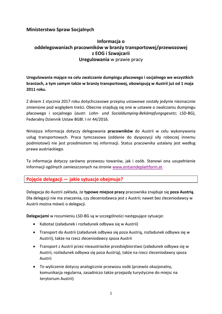 Ministerstwo Spraw Socjalnych Informacja o oddelegowaniach pracowników w branży transportowej/przewozowej z EOG i Szwajcarii Uregulowania w prawie pracy Uregulowania mające na celu zwalczanie dumpingu płacowego i socjalnego we wszystkich branżach, a tym samym także w branży transportowej, obowiązują w Austrii już od 1 maja 2011 roku. Z dniem 1 stycznia 2017 roku dotychczasowe przepisy ustawowe zostały jedynie nieznacznie zmienione pod względem treści. Obecnie znajdują się one w ustawie o zwalczaniu dumpingu płacowego i socjalnego (austr. Lohn- und Sozialdumping-Bekämpfungsgesetz; LSD-BG), Federalny Dziennik Ustaw BGBl. I nr 44/2016. Niniejsza informacja dotyczy delegowania pracowników do Austrii w celu wykonywania usług transportowych. Praca tymczasowa (oddanie do dyspozycji siły roboczej innemu podmiotowi) nie jest przedmiotem tej informacji. Status pracownika ustalany jest według prawa austriackiego. Ta informacja dotyczy zarówno przewozu towarów, jak i osób. Stanowi ona uzupełnienie informacji ogólnych zamieszczonych na stronie www.entsendeplattform.at. Pojęcie delegacji — jakie sytuacje obejmuje? Delegacja do Austrii zakłada, że typowe miejsce pracy pracownika znajduje się poza Austrią. Dla delegacji nie ma znaczenia, czy zleceniodawca jest z Austrii; nawet bez zleceniodawcy w Austrii można mówić o delegacji. Delegacjami w rozumieniu LSD-BG są w szczególności następujące sytuacje: • Kabotaż (załadunek i rozładunek odbywa się w Austrii) • Transport do Austrii (załadunek odbywa się poza Austrią, rozładunek odbywa się w Austrii), także na rzecz zleceniodawcy spoza Austrii • Transport z Austrii przez nieaustriackie przedsiębiorstwo (załadunek odbywa się w Austrii, rozładunek odbywa się poza Austrią), także na rzecz zleceniodawcy spoza Austrii • To wyliczenie dotyczy analogicznie przewozu osób (przewóz okazjonalny, komunikacja regularna, zasadniczo także przejazdy turystyczne do miejsc na terytorium Austrii) 1 Także przejazdy nieregularne i jednorazowe są delegacjami. Przykładowe delegacje: • Przywożenie narciarzy do Austrii. • Wycieczka turystyczna rozpoczyna się w kraju A, prowadzi do Austrii i kończy się z powrotem w kraju A (wycieczka objazdowa po Austrii). Delegacjami nie są w rozumieniu LSD-BG w szczególności następujące sytuacje: • Tranzyt w przewozie towarów i przewozie osób (w Austrii nie odbywa się załadunek ani rozładunek towarów i nie wsiadają ani nie wysiadają żadni pasażerowie; ponadto celem jazdy nie jest dowiezienie towarów lub osób do Austrii; przejazd przez Austrię jest tylko konieczny po to, aby dojechać do celu). • Sprzedawca/wynajmujący/wytwórca/przetwórca/właściciel sam dostarcza poprzez swoich pracowników własnymi (wynajętymi/leasingowanymi) pojazdami sprzedane/wynajmowane/wytworzone/przeznaczone do przetworzenia towary do Austrii, przy czym przewóz towarów pełni tylko funkcję pomocniczą w ramach działalności całego przedsiębiorstwa. Dopuszczalna masa całkowita pojazdu nie ma znaczenia. • Nabywca/najemca/przetwórca/właściciel sam odbiera poprzez swoich pracowników własnymi (wynajętymi/leasingowanymi) pojazdami nabyte/wynajęte/przetworzone/przeznaczone do przetworzenia towary z Austrii, przy czym przewóz towarów pełni tylko funkcję pomocniczą w ramach działalności całego przedsiębiorstwa. Dopuszczalna masa całkowita pojazdu nie ma znaczenia. • W trakcie transportu między zakładami jednego przedsiębiorstwa są dostarczane (przewożeni) do Austrii lub odbierane (odbierani) z Austrii własne towary (właśni pracownicy) przez własnych pracowników, przy czym przewóz towarów (osób) pełni tylko funkcję pomocniczą w ramach działalności całego przedsiębiorstwa. Dopuszczalna masa całkowita pojazdu nie ma znaczenia. • Przejazdy turystyczne (przewóz osób) do miejsc na terytorium Austrii, o ile o inne miejsca docelowe przejazdu znajdują się poza Austrią i poza krajem, w którym przejazd się rozpoczyna oraz o w Austrii nie wsiadają i nie kończą swojej podróży żadne osoby. Przykład sytuacji niebędącej delegacją: Wycieczka turystyczna rozpoczyna się w kraju A, prowadzi przez Austrię i kończy się kraju B. Jakie powstają obowiązki? • Przestrzeganie płacy minimalnej wynikającej z układu zbiorowego 2 • Zgłoszenie delegacji (formularz ZKO 3) • Posiadanie dokumentów — zazwyczaj w pojeździe: o o o o Zgłoszenie Dokumenty poświadczające zgłoszenie do ubezpieczenia społecznego Dokumentacja płacowa Pozwolenie na pracę w przypadku pracowników będących obywatelami innego państwa Przestrzeganie płacy minimalnej wynikającej z układu zbiorowego: • W branży przewozu towarów (czyli przy przewozie towarów pojazdami) pracownicy podlegają układowi zbiorowemu dla sektora przewozu towarów. Pracowników przedsiębiorstw, które przewożą towary wyłącznie pojazdami o dopuszczalnej masie całkowitej nieprzekraczającej 3500 kg, obowiązuje układ zbiorowy dla drobnej działalności transportowej. • W branży przewozu osób z jednej strony obowiązuje układ zbiorowy dla prywatnych przewoźników autobusowych. Jeśli chodzi o przedsiębiorstwo taksówkowe, pracownicy podlegają układowi zbiorowemu dla sektora przewozu osób samochodami osobowymi. Przedsiębiorstwa, które nie należą do branży przewozu osób lub towarów, lecz prowadzą także transport jako część swojej działalności gospodarczej w innej branży, z reguły podlegają układowi zbiorowemu obowiązującemu dla danej branży. Należy jednak mieć na uwadze, że pewne przejazdy wykonywane w ramach działalności gospodarczej nie są delegacjami (patrz punkt „Pojęcie delegacji”). Wszystkie układy zbiorowe są zamieszczone na stronie www.kollektivvertrag.at. Płaca minimalna wynikająca z układu zbiorowego obowiązuje dla całego czasu pracy. Czas pracy kierowcy w przewozie towarów i osób obejmuje czasy kierowan