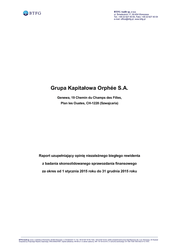 BTFG Audit sp. z o.o. ul. Śniadeckich 17, 00-654 Warszawa Tel.: +48 22 627 40 05, Faks: +48 22 627 40 04 e-mail: [email protected], www.btfg.pl Grupa Kapitałowa Orphée S.A. Genewa, 19 Chemin du Champs des Filles, Plan les Ouates, CH-1228 (Szwajcaria) Raport uzupełniający opinię niezależnego biegłego rewidenta z badania skonsolidowanego sprawozdania finansowego za okres od 1 stycznia 2015 roku do 31 grudnia 2015 roku BTFG Audit sp. z o.o. z siedzibą w Warszawie, 00-654 Warszawa, ul. Śniadeckich 17, Tel: +48 22 627 40 05, Faks: +48 22 627 40 04, spółka zarejestrowana przez Sąd Rejonowy dla m.st. Warszawy, XII Wydział Gospodarczy Krajowego Rejestru Sądowego, KRS:0000247697, kapitał zakładowy: 99 000 zł– w całości opłacony, NIP: 701 00 02 814, nr rachunku bankowego: 04 1050 1038 1000 0023 0112 1675. Raport uzupełniający opinię niezależnego biegłego rewidenta z badania skonsolidowanego sprawozdania finansowego Grupy Kapitałowej Orphée S.A. za okres od 1 stycznia 2015 roku do 31 grudnia 2015 roku SPIS TREŚCI I. CZĘŚĆ OGÓLNA RAPORTU ........................................................................................................ 3 III. CZĘŚĆ SZCZEGÓŁOWA RAPORTU ......................................................................................... 16 II. CZĘŚĆ ANALITYCZNA RAPORTU............................................................................................... 9 2 Raport uzupełniający opinię niezależnego biegłego rewidenta z badania skonsolidowanego sprawozdania finansowego Grupy Kapitałowej Orphée S.A. za okres od 1 stycznia 2015 roku do 31 grudnia 2015 roku I. CZĘŚĆ OGÓLNA RAPORTU 1. Dane identyfikujące Jednostkę Dominującą Nazwa i forma prawna W badanym okresie jednostka dominująca w Grupie Kapitałowej Orphée S.A. (dalej: „Jednostka Dominująca”, „Spółka”) działała pod firmą Orphée S.A. Siedziba Jednostki Dominującej Siedziba Jednostki Dominującej mieści się w Plan les Ouates, 19 Chemin du Champs des Filles, CH1228, kanton Genewa (Szwajcaria). Przedmiot działalności Jednostki Dominującej Orphée S.A. jest spółką akcyjną podlegającą przepisom prawa szwajcarskiego, w tym szwajcarskiego Kodeksu Zobowiązań (Code des Obligations, CO). Przedmiotem działalności Spółki, zgodnie z jej Statutem, jest rozwój i sprzedaż odczynników, testów i aparatury do diagnostyki in vitro. W badanym okresie spółka Orphée S.A. oraz Grupa Kapitałowa Orphée S.A. (dalej: „Grupa Kapitałowa”) działały głównie na rynku diagnostyki in vitro (ang. in vitro diagnostics - IVD), w sektorze hematologii oraz w segmencie biochemicznym. Dzięki inwestycji w jednostkę współkontrolowaną, włoską spółkę Diesse Diagnostica Senese S.p.A. (dalej: „Diesse”), obszar działalności Grupy Kapitałowej Orphée S.A. rozszerzył się o immunologię, mikrobiologię i ESR (badanie popularnego wskaźnika OB). Podstawa prawna działalności Jednostka Dominująca Orphée S.A. działa na podstawie: Statutu Spółki, Szwajcarskiego Kodeksu Zobowiązań. Spółka została zawiązana na czas nieoznaczony. Rejestracja Jednostki Dominującej Spółka została wpisana do rejestru handlowego Genewy dnia 7 czerwca 2002 roku - nr ref. 05882/2002.Nr identyfikacyjny Spółki to (IDE/UID) CHE-109.605.227. Rejestracja w Urzędzie Skarbowym i kod klasyfikacji działalności Spółka posiada numer identyfikacji podatkowej NIP 570927 oraz kod zgodnie z klasyfikacją działalności DUNS Nr 481882434. 3 Raport uzupełniający opinię niezależnego biegłego rewidenta z badania skonsolidowanego sprawozdania finansowego Grupy Kapitałowej Orphée S.A. za okres od 1 stycznia 2015 roku do 31 grudnia 2015 roku Informacje o kapitale podstawowym i własnym Grupy Kapitałowej Kapitał własny Grupy na dzień 31 grudnia 2015 roku składał się (dane w tys. CHF) z następujących pozycji: Kapitał podstawowy 3 861 tys. CHF, Akcje własne -8 809 tys. CHF, Kapitał zapasowy 46 619 tys. CHF, Zyski zatrzymane -10 409 tys. CHF, wynik finansowy netto roku obrachunkowego (strata) -7 992 tys. CHF, różnice kursowe z przeliczenia jednostek zagranicznych -1 686 tys. CHF, udziały niekontrolujące 0 tys. CHF. Łączny skonsolidowany kapitał własny Grupy Kapitałowej wynosi 21 854 tys. CHF. Kapitał podstawowy Grupy, równy kapitałowi podstawowy Jednostki Dominującej na dzień 31 grudnia 2015 roku wynosił 3 861 tys. CHF i był podzielony na 38 608 500 akcji o wartości nominalnej 0,10 CHF każda. Na dzień 31 grudnia 2014 roku kapitał podstawowy podmiotu dominującego (Grupy) wynosił 3 861 tys. CHF i był podzielony na 38 608 500 akcji o wartości nominalnej 0,10 CHF każda. Do dnia sporządzenia niniejszego raportu nie miały miejsca zmiany w wysokości kapitału podstawowego Spółki / Grupy Kapitałowej. Przedstawione powyżej informacje dotyczące wysokości kapitału podstawowego Spółki są zgodne z odpisem z rejestru handlowego Genewy dla Spółki oraz ze Statutem Spółki. Skład akcjonariatu Jednostki Dominującej na dzień bilansowy 31 grudnia 2015 roku oraz na dzień wydania opinii niezależnego biegłego rewidenta z badania skonsolidowanego sprawozdania finansowego Spółki za okres od 1 stycznia 2015 roku do 31 grudnia 2015 roku i sporządzenia niniejszego raportu, przedstawia się następująco: Na dzień 31 grudnia 2015 roku oraz na dzień wydania niniejszego raportu stan akcjonariatu przedstawia się następująco: Ilość akcji TOTAL FIZ bezpośrednio oraz pośrednio, poprzez podmiot zależny TTL 1 Sp. z o.o. PZ Cormay S.A. Orphee S.A. (akcje własne) Quercus TFI S.A. (Fundusze Inwestycyjne: QUERCUS) Pozostali Razem Żródło: Orphée S.A. Ilość głosów Wartość nominalna jednej akcji Udział w ogólnej liczbie głosów na WZA Udział w kapitale podstawowym 12 564 314 12 564 314 0,10 32,54% 32,54% 3 859 118 3 859 118 0,10 10,00% 10,00% 8 879 956 3 011 102 10 294 010 38 608 500 8 879 956 3 011 102 10 294 010 38 608 50