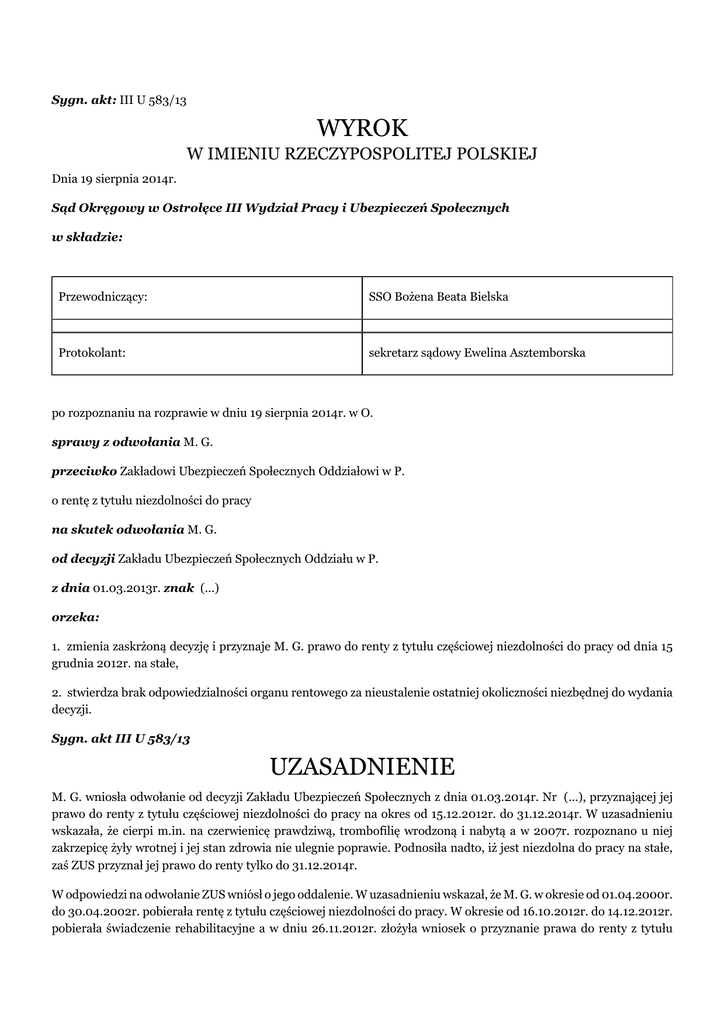 Sygn. akt: III U 583/13 WYROK W IMIENIU RZECZYPOSPOLITEJ POLSKIEJ Dnia 19 sierpnia 2014r. Sąd Okręgowy w Ostrołęce III Wydział Pracy i Ubezpieczeń Społecznych w składzie: Przewodniczący: SSO Bożena Beata Bielska Protokolant: sekretarz sądowy Ewelina Asztemborska po rozpoznaniu na rozprawie w dniu 19 sierpnia 2014r. w O. sprawy z odwołania M. G. przeciwko Zakładowi Ubezpieczeń Społecznych Oddziałowi w P. o rentę z tytułu niezdolności do pracy na skutek odwołania M. G. od decyzji Zakładu Ubezpieczeń Społecznych Oddziału w P. z dnia 01.03.2013r. znak (...) orzeka: 1. zmienia zaskrżoną decyzję i przyznaje M. G. prawo do renty z tytułu częściowej niezdolności do pracy od dnia 15 grudnia 2012r. na stałe, 2. stwierdza brak odpowiedzialności organu rentowego za nieustalenie ostatniej okoliczności niezbędnej do wydania decyzji. Sygn. akt III U 583/13 UZASADNIENIE M. G. wniosła odwołanie od decyzji Zakładu Ubezpieczeń Społecznych z dnia 01.03.2014r. Nr (...), przyznającej jej prawo do renty z tytułu częściowej niezdolności do pracy na okres od 15.12.2012r. do 31.12.2014r. W uzasadnieniu wskazała, że cierpi m.in. na czerwienicę prawdziwą, trombofilię wrodzoną i nabytą a w 2007r. rozpoznano u niej zakrzepicę żyły wrotnej i jej stan zdrowia nie ulegnie poprawie. Podnosiła nadto, iż jest niezdolna do pracy na stałe, zaś ZUS przyznał jej prawo do renty tylko do 31.12.2014r. W odpowiedzi na odwołanie ZUS wniósł o jego oddalenie. W uzasadnieniu wskazał, że M. G. w okresie od 01.04.2000r. do 30.04.2002r. pobierała rentę z tytułu częściowej niezdolności do pracy. W okresie od 16.10.2012r. do 14.12.2012r. pobierała świadczenie rehabilitacyjne a w dniu 26.11.2012r. złożyła wniosek o przyznanie prawa do renty z tytułu niezdolności do pracy. W toku jego rozpoznawania zarówno lekarz orzecznik ZUS jak i Komisja Lekarska ZUS ustalili, że M. G. jest częściowo niezdolna do pracy do 31.12.2014r. a niezdolność powstała w styczniu 2012r. W konsekwencji zaskarżoną decyzją z dnia 01.03.2013r. przyznano jej prawo do renty z tytułu częściowej niezdolności do pracy na okres od 15.12.2012r., tj. od zaprzestania pobierania świadczenia rehabilitacyjnego, do 31.12.2014r. Pełnomocnik odwołującej ostatecznie oświadczył, że domaga się przyznania M. G. prawa o renty z tytułu częściowej niezdolności do pracy na stałe. Sąd ustalił i zważył, co następuje: Z akt ZUS wynika, że M. G. w okresie od 01.04.2000r. do 30.04.2002r. pobierała rentę z tytułu częściowej niezdolności do pracy. W okresie od 16.10.2012r. do 14.12.2012r. pobierała świadczenie rehabilitacyjne a w dniu 26.11.2012r. złożyła wniosek o przyznanie prawa do renty z tytułu niezdolności do pracy. W toku jego rozpoznawania zarówno lekarz orzecznik ZUS jak i Komisja Lekarska ZUS ustalili, że M. G. jest częściowo niezdolna do pracy do 31.12.2014r. a niezdolność powstała w styczniu 2012r. W konsekwencji zaskarżoną decyzją z dnia 01.03.2013r. przyznano jej prawo do renty z tytułu niezdolności do pracy na okres od 15.12.2012r., tj. od zaprzestania pobierania świadczenia rehabilitacyjnego, do 31.12.2014r. M. G. w niniejszym postepowaniu domagała się przyznania prawa o renty z tytułu częściowej niezdolności do pracy na stałe. W ocenie Sądu odwołanie od decyzji ZUS z dnia 01.03.2014r. jest zasadne. Zgodnie z art. 57 ust. 1 ustawy z dnia 17 grudnia 1998 r. o emeryturach i rentach z Funduszu Ubezpieczeń Społecznych (Dz.U. Nr 162, poz. 1118 ze zm.) renta z tytułu niezdolności do pracy przysługuje ubezpieczonej, która spełnia łącznie następujące przesłanki: 1. jest niezdolna do pracy, 2. ma wymagany okres składkowy i nieskładkowy, 3. niezdolność do pracy powstała we wskazanych w ustawie okresach składkowych lub nieskładkowych albo nie później niż w ciągu 18 miesięcy od ustania tych okresów. Definicję osoby niezdolnej do pracy zawiera art. 12 ust. 1-3 w/w ustawy, który stwierdza, że jest nią osoba, która całkowicie lub częściowo utraciła zdolność do pracy zarobkowej z powodu naruszenia sprawności organizmu i nie rokuje odzyskania zdolności do pracy po przekwalifikowaniu. Całkowicie niezdolną do pracy jest osoba, która utraciła zdolność do wykonywania jakiejkolwiek pracy, natomiast częściowo niezdolną do pracy jest osoba, która w znacznym stopniu utraciła zdolność do pracy zgodnej z poziomem posiadanych kwalifikacji. Ponieważ zaskarżoną decyzją uznano już odwołującą za częściowo niezdolną do pracy, w świetle w/w przepisów skuteczność odwołania M. G. była uzależniona od ustalenia, czy jest ona częściowo niezdolna do pracy na stałe, czy okresowo. Na okoliczność istnienia niezdolności do pracy odwołującej Sąd dopuścił w sprawie dowód z opinii biegłych lekarzy z zakresu neurologii i chirurgii naczyniowej. W opinii z dnia 17.06.2013r., sporządzonej tylko przez biegłą z zakresu neurologii, T. P., biegła rozpoznała u odwołującą: czerwienicę prawdziwą leczoną H., przebytą zakrzepicę żyły wrotnej w 2007r., zakrzepicę żyły wrotnej, krezkowej górnej i dolnej pnia trzewnego w styczniu 2012r., przewlekłe leczenie przeciwzakrzepowe, torbiel jajnika prawego leczoną operacyjnie, trombofilię wrodzoną i nabytą, choroby mieloproliferacyjne w trakcie diagnostyki, żylaki kończyn dolnych i zawroty głowy w wywiadzie. Biegli stwierdziła, że w/w schorzenia powodują u odwołującej całkowitą niezdolność do pracy od stycznia 2012r. do stycznia 2014r. W uzasadnieniu biegła wskazała, że odwołująca choruje od kilku lat, leczyła się szpitalnie, ambulatoryjnie, przechodziła zabiegi operacyjne związane z zasadniczą chorobą. Dopiero w 2012r. postawiono rozpoznanie zasadniczego schorzenia. W początkowym okresie występowały powikłania czerwienicy i z tego powodu była operowana. Rozpoznanie schorzenia spowodowało włączenie przewlekłego leczenia prze