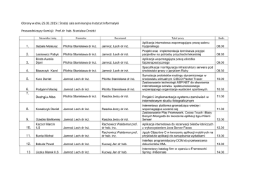Obrony w dniu 25.03.2015 ( Środa) sala seminaryjna Instytut Informatyki Przewodniczący Komisji: Prof.dr hab. Stanisław Drożdż Nazwisko i imię Promotor Recenzent Tytuł pracy Godz. 1. Gębala Mateusz Plichta Stanisława dr inż. Jamroż. Lech dr inż. Aplikacja internetowa wspomagająca pracę salonu fryzjerskiego 08.00 2. Laskowicz Patryk Plichta Stanisława dr inż. Jamroż. Lech dr inż. Projekt oraz implementacja terminarza przyjęć pacjentów na potrzeby przychodni lekarskiej 08.30 3. Binda Aurelia Djoni Plichta Stanisława dr inż. Jamroż. Lech dr inż. Aplikacja wspomagająca pracę ośrodka fizjoterapeutycznego 09.00 4. Błaszczyk Karol Plichta Stanisława dr inż. Jamroż. Lech dr inż. Specyfikacja i konfiguracja infrastruktury serwera pod środowisko pracy z językiem Ruby 09.30 5. Kura Daniel Jamroż Lech dr inż. Plichta Stanisława dr inż. 6. 7. Podgórni Maciej Jamroż Lech dr inż. Plichta Stanisława dr inż. Dezhgiu Alba Plichta Stanisława dr inż. Raszka Jerzy dr inż. 8. Kowalczyk Daniel Jamroż Lech dr inż. Raszka Jerzy dr inż. 9. Oziębło Bartłomiej Jamroż Lech dr inż. Raszka Jerzy dr inż. Internetowa platforma gromadząca wiedzę i wspomagająca uczenie się Zastosowanie Play Framework, Cocoa Touch i Bazy Danych Mongodb do tworzenia aplikacji typu KlientSerwer 10. Kaczor Marcin II,S Jamroż Lech dr inż. Rachowicz Waldemar prof. dr hab. inz. Aplikacja internetowa do rezerwacji biletów lotniczych z wykorzystaniem Java Server Faces 12.30 11. Burda Michał Jamroż Lech dr inż. Rachowicz Waldemar prof. dr hab. inz. Język Objective-C w tworzeniu aplikacji mobilnych na przykładzie aplikacji do zarządzania wydatkami 13.00 12. Babula Paweł Jamroż Lech dr inż. Kucwaj Jan dr hab. Interfejs programistyczny DOM do przetwarzania dokumentów XML 13.30 13 Liszka Marek II,S Jamroż Lech dr inż. Kucwaj Jan dr hab. Internetowy katalog firm w oparciu o Frameworki Spring i Hibernate 14.00 Symulacja protokołów routingu dynamicznego w środowisku wirtualnym CISCO Packet Tracer Zastosowanie technologii ASP.NET do stworzenia internetowego serwisu społecznościowego wspierającego organizacje wydarzeń sportowych. Projekt i implementacja systemu zamówień w internetowym studiu fotograficznym 10.00 10.30 11.00 11.30 12.00
