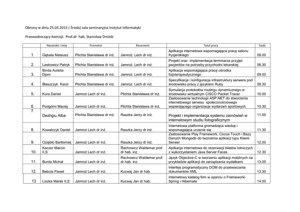 Obrony w dniu 25.03.2015 ( Środa) sala seminaryjna Instytut