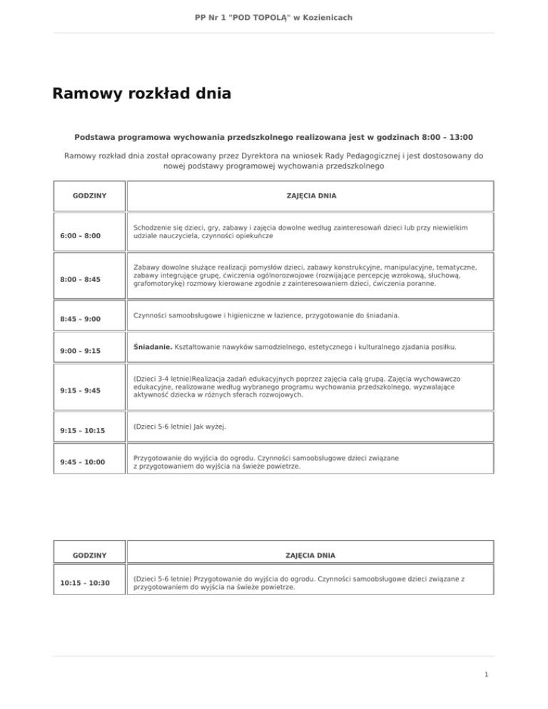 PP Nr 1 "POD TOPOLĄ" w Kozienicach Ramowy rozkład dnia Podstawa programowa wychowania przedszkolnego realizowana jest w godzinach 8:00 – 13:00 Ramowy rozkład dnia został opracowany przez Dyrektora na wniosek Rady Pedagogicznej i jest dostosowany do nowej podstawy programowej wychowania przedszkolnego GODZINY 6:00 – 8:00 8:00 – 8:45 8:45 – 9:00 9:00 – 9:15 9:15 – 9:45 9:15 – 10:15 9:45 – 10:00 GODZINY 10:15 – 10:30 ZAJĘCIA DNIA Schodzenie się dzieci, gry, zabawy i zajęcia dowolne według zainteresowań dzieci lub przy niewielkim udziale nauczyciela, czynności opiekuńcze Zabawy dowolne służące realizacji pomysłów dzieci, zabawy konstrukcyjne, manipulacyjne, tematyczne, zabawy integrujące grupę, ćwiczenia ogólnorozwojowe (rozwijające percepcję wzrokową, słuchową, grafomotorykę) rozmowy kierowane zgodnie z zainteresowaniem dzieci, ćwiczenia poranne. Czynności samoobsługowe i higieniczne w łazience, przygotowanie do śniadania. Śniadanie. Kształtowanie nawyków samodzielnego, estetycznego i kulturalnego zjadania posiłku. (Dzieci 3-4 letnie)Realizacja zadań edukacyjnych poprzez zajęcia całą grupą. Zajęcia wychowawczo edukacyjne, realizowane według wybranego programu wychowania przedszkolnego, wyzwalające aktywność dziecka w różnych sferach rozwojowych. (Dzieci 5-6 letnie) Jak wyżej. Przygotowanie do wyjścia do ogrodu. Czynności samoobsługowe dzieci związane z przygotowaniem do wyjścia na świeże powietrze. ZAJĘCIA DNIA (Dzieci 5-6 letnie) Przygotowanie do wyjścia do ogrodu. Czynności samoobsługowe dzieci związane z przygotowaniem do wyjścia na świeże powietrze. 1 PP Nr 1 "POD TOPOLĄ" w Kozienicach 10:30 – 11:45 Zabawy w ogrodzie przedszkolnym. Gry i zabawy ruchowe na powietrzu, w tym zajęcia sportowe, obserwacje przyrodnicze, prace porządkowo – ogrodnicze, badawcze, spacery i wycieczki. (w przypadku nieodpowiedniej pory – gry i zabawy ruchowe w salach). 11:45 – 12:00 Wyrabianie nawyków i czynności higienicznych, kulturalnych, związanych z samoobsługą dziecka i przygotowaniem do obiadu. 12:00 – 12:30 Obiad. Kształtowanie nawyków samodzielnego, estetycznego i kulturalnego zjadania posiłku. 12:30 – 13:00 Odpoczynek, leżakowanie- dzieci z grupy I i II. Poobiedni relaks, słuchanie literatury dziecięcej czytanej przez nauczyciela lub z nagrań. 13 :00 – 14:00 W d.c. odpoczynek, leżakowanie - dzieci z grupy I i II. Zabawy relaksacyjne, terapia bajką, muzykoterapia. Indywidualna realizacja innych zadań edukacyjnych: dodatkowe działania edukacyjne dla dzieci z deficytami rozwojowymi i dzieckiem zdolnym – dzieci starsze. Zabawy w sali lub w ogrodzie – dzieci z grup; III, IV i V. Zabawy dowolne. Dydaktyczne, organizowane w sali lub ogrodzie, udział w zajęciach dodatkowych. 14:00 – 14:15 Przygotowanie się do podwieczorku. Wyrabianie nawyków i czynności higienicznych, kulturalnych, związanych z samoobsługą dziecka i przygotowaniem do posiłku. 14:15 – 14:30 Podwieczorek. Kształtowanie nawyków i czynności higienicznych związanych z samoobsługą dziecka, przygotowaniem do posiłku i kulturalnym zachowaniem przy stole. 14:30 -16:30 Zabawy w kącikach zainteresowań lub w ogrodzie przedszkolnym. Zabawy ruchowe, edukacyjne i wychowawcze organizowane przez nauczyciela oraz podejmowane z własnej inicjatywy dzieci, obserwacja pedagogiczna, praca indywidualna, kontakty okolicznościowe. 2
