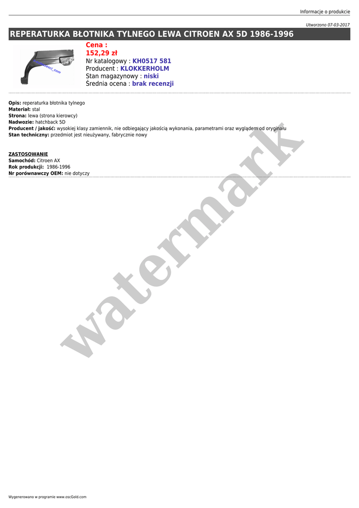 Informacje o produkcie Utworzono 07-03-2017 REPERATURKA BŁOTNIKA TYLNEGO LEWA CITROEN AX 5D 1986-1996 Cena : 152,29 zł Nr katalogowy : KH0517 581 Producent : KLOKKERHOLM Stan magazynowy : niski Średnia ocena : brak recenzji w at ZASTOSOWANIE Samochód: Citroen AX Rok produkcji: 1986-1996 Nr porównawczy OEM: nie dotyczy er m ar k Opis: reperaturka błotnika tylnego Materiał: stal Strona: lewa (strona kierowcy) Nadwozie: hatchback 5D Producent / jakość: wysokiej klasy zamiennik, nie odbiegający jakością wykonania, parametrami oraz wyglądem od oryginału Stan techniczny: przedmiot jest nieużywany, fabrycznie nowy Wygenerowano w programie www.oscGold.com