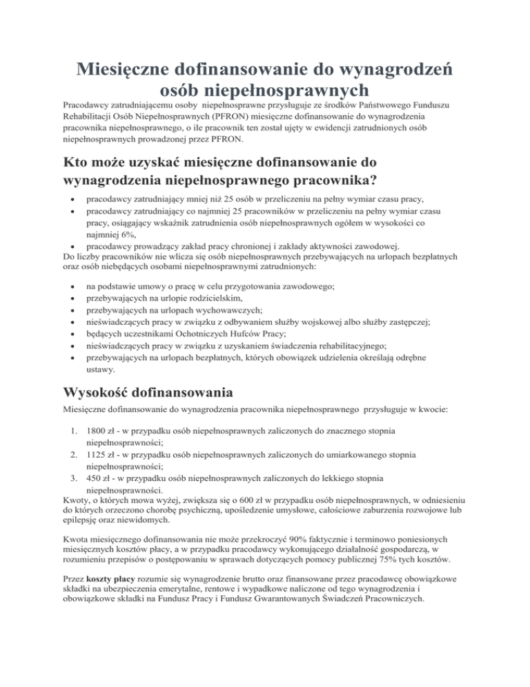 Miesięczne dofinansowanie do wynagrodzeń osób niepełnosprawnych Pracodawcy zatrudniającemu osoby niepełnosprawne przysługuje ze środków Państwowego Funduszu Rehabilitacji Osób Niepełnosprawnych (PFRON) miesięczne dofinansowanie do wynagrodzenia pracownika niepełnosprawnego, o ile pracownik ten został ujęty w ewidencji zatrudnionych osób niepełnosprawnych prowadzonej przez PFRON. Kto może uzyskać miesięczne dofinansowanie do wynagrodzenia niepełnosprawnego pracownika? pracodawcy zatrudniający mniej niż 25 osób w przeliczeniu na pełny wymiar czasu pracy, pracodawcy zatrudniający co najmniej 25 pracowników w przeliczeniu na pełny wymiar czasu pracy, osiągający wskaźnik zatrudnienia osób niepełnosprawnych ogółem w wysokości co najmniej 6%, pracodawcy prowadzący zakład pracy chronionej i zakłady aktywności zawodowej. Do liczby pracowników nie wlicza się osób niepełnosprawnych przebywających na urlopach bezpłatnych oraz osób niebędących osobami niepełnosprawnymi zatrudnionych: na podstawie umowy o pracę w celu przygotowania zawodowego; przebywających na urlopie rodzicielskim, przebywających na urlopach wychowawczych; nieświadczących pracy w związku z odbywaniem służby wojskowej albo służby zastępczej; będących uczestnikami Ochotniczych Hufców Pracy; nieświadczących pracy w związku z uzyskaniem świadczenia rehabilitacyjnego; przebywających na urlopach bezpłatnych, których obowiązek udzielenia określają odrębne ustawy. Wysokość dofinansowania Miesięczne dofinansowanie do wynagrodzenia pracownika niepełnosprawnego przysługuje w kwocie: 1. 1800 zł - w przypadku osób niepełnosprawnych zaliczonych do znacznego stopnia niepełnosprawności; 2. 1125 zł - w przypadku osób niepełnosprawnych zaliczonych do umiarkowanego stopnia niepełnosprawności; 3. 450 zł - w przypadku osób niepełnosprawnych zaliczonych do lekkiego stopnia niepełnosprawności. Kwoty, o których mowa wyżej, zwiększa się o 600 zł w przypadku osób niepełnosprawnych, w odniesieniu do których orzeczono chorobę psychiczną, upośledzenie umysłowe, całościowe zaburzenia rozwojowe lub epilepsję oraz niewidomych. Kwota miesięcznego dofinansowania nie może przekroczyć 90% faktycznie i terminowo poniesionych miesięcznych kosztów płacy, a w przypadku pracodawcy wykonującego działalność gospodarczą, w rozumieniu przepisów o postępowaniu w sprawach dotyczących pomocy publicznej 75% tych kosztów. Przez koszty płacy rozumie się wynagrodzenie brutto oraz finansowane przez pracodawcę obowiązkowe składki na ubezpieczenia emerytalne, rentowe i wypadkowe naliczone od tego wynagrodzenia i obowiązkowe składki na Fundusz Pracy i Fundusz Gwarantowanych Świadczeń Pracowniczych. Miesięczne dofinansowanie nie przysługuje pracodawcy: posiadającemu zaległości w zobowiązaniach wobec PFRON przekraczające ogółem kwotę 100 zł, zatrudniającemu co najmniej 25 pracowników w przeliczeniu na pełny wymiar czasu pracy i nieosiągającemu wskaźnika zatrudnienia osób niepełnosprawnych w wysokości co najmniej 6%, na pracowników zaliczonych do umiarkowanego lub lekkiego stopnia niepełnosprawności, którzy mają ustalone prawo do emerytury; jeżeli wynagrodzenie pracownika niepełnosprawnego nie zostało przekazane na jego rachunek bankowy lub rachunek w spółdzielczej kasie oszczędnościowo-kredytowej albo na adres zamieszkania tego pracownika, za pośrednictwem osób prawnych prowadzących działalność w zakresie doręczania kwot pieniężnych; jeżeli miesięczne koszty płacy zostały poniesione przez pracodawcę z uchybieniem terminów, wynikających z odrębnych przepisów, przekraczającym 14 dni; jeżeli środki na wynagrodzenie pochodzą ze środków publicznych. Jak ubiegać się o pomoc? Podmiotem udzielającym pomocy jest Państwowy Fundusz Rehabilitacji Osób Niepełnosprawnych (PFRON). Adres: Al. Jana Pawła II 13, 00-828 Warszawa Tel. (022) 50 55 500 INFOLINIA: (0) 800 533 335 Strona internetowa: www.pfron.org.pl