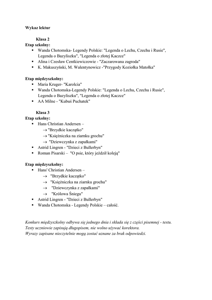 Wykaz lektur Klasa 2 Etap szkolny: Wanda Chotomska- Legendy Polskie: "Legenda o Lechu, Czechu i Rusie", Legenda o Bazyliszku", "Legenda o złotej Kaczce" Alina i Czesław Centkiewiczowie - "Zaczarowana zagroda" K. Makuszyński, M. Walentynowicz -"Przygody Koziołka Matołka" Etap międzyszkolny: Maria Kruger- "Karolcia" Wanda Chotomska-Legendy Polskie: "Legenda o Lechu, Czechu i Rusie", Legenda o Bazyliszku", "Legenda o złotej Kaczce" AA Milne - "Kubuś Puchatek" Klasa 3 Etap szkolny: Hans Christian Andersen – "Brzydkie kaczątko" "Księżniczka na ziarnku grochu" "Dziewczynka z zapałkami" Astrid Lingren - "Dzieci z Bullerbyn" Roman Pisarski – "O psie, który jeździł koleją" Etap międzyszkolny: Hans' Christian Andersen – "Brzydkie kaczątko" "Księżniczka na ziarnku grochu" "Dziewczynka z zapałkami" "Królowa Śniegu" Astrid Lingren - "Dzieci z Bullerbyn" Wanda Chotomska - Legendy Polskie – całość. Konkurs międzyszkolny odbywa się jednego dnia i składa się z części pisemnej - testu. Testy uczniowie zapisują długopisem, nie wolno używać korektora. Wyrazy zapisane nieczytelnie mogą zostać uznane za brak odpowiedzi.