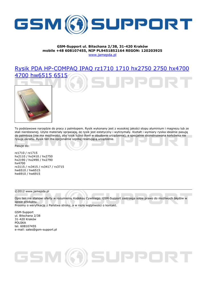 GSM-Support ul. Bitschana 2/38, 31-420 Kraków mobile +48 608107455, NIP PL9451852164 REGON: 120203925 www.jamepda.pl Rysik PDA HP-COMPAQ IPAQ rz1710 1710 hx2750 2750 hx4700 4700 hw6515 6515 To podstawowe narzędzie do pracy z palmtopem. Rysik wykonany jest z wysokiej jakości stopu aluminium i magnezu lub ze stali nierdzewnej. Użyte materiały sprawiają, że rysik jest estetyczny i wytrzymały. Kształt i wymiary rysika idealnie pasują do palmtopa (nie ma możliwości, aby rysik luźno tkwił w obudowie urządzenia), a specjalnie skonstruowana końcówka nie rysuje ekranu. Rysik ten ma opcjonalnie szpilkę resetującą urządzenie. Pasuje do: rz1710 / rz1715 hx2110 / hx2410 / hx2750 hx2190 / hx2490 / hx2790 hx4700 rx3115 / rx3415 / rx3417 / rx3715 hw6510 / hw6515 hw6910 / hw6915 ©2012 www.jamepda.pl Opis ten nie stanowi oferty w rozumieniu Kodeksu Cywilnego. GSM-Support zastrzega sobie prawo do możliwych błędów w opisie produktu. Prosimy o weryfikację z Państwa strony, a w razie wątpliwości o kontakt. GSM-Support ul. Bitschana 2/38 31-420 Kraków POLSKA tel. 608107455 e-mail: [email protected] Powered by TCPDF (www.tcpdf.org)