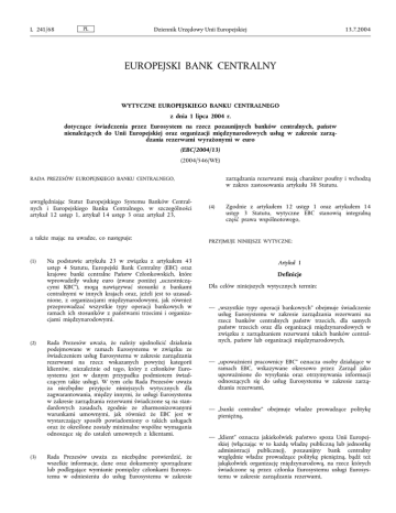 L 241/68 PL Dziennik Urzędowy Unii Europejskiej 13.7.2004 EUROPEJSKI BANK CENTRALNY WYTYCZNE EUROPEJSKIEGO BANKU CENTRALNEGO z dnia 1 lipca 2004 r. dotyczące świadczenia przez Eurosystem na rzecz pozaunijnych banków centralnych, państw nienależących do Unii Europejskiej oraz organizacji międzynarodowych usług w zakresie zarządzania rezerwami wyrażonymi w euro (EBC/2004/13) (2004/546/WE) zarządzania rezerwami mają charakter poufny i wchodzą w zakres zastosowania artykułu 38 Statutu. RADA PREZESÓW EUROPEJSKIEGO BANKU CENTRALNEGO, uwzględniając Statut Europejskiego Systemu Banków Centralnych i Europejskiego Banku Centralnego, w szczególności artykuł 12 ustęp 1, artykuł 14 ustęp 3 oraz artykuł 23, a także mając na uwadze, co następuje: (1) (2) (3) Na podstawie artykułu 23 w związku z artykułem 43 ustęp 4 Statutu, Europejski Bank Centralny (EBC) oraz krajowe banki centralne Państw Członkowskich, które wprowadziły walutę euro (zwane poniżej „uczestniczącymi KBC”), mogą nawiązywać stosunki z bankami centralnymi w innych krajach oraz, jeżeli jest to uzasadnione, z organizacjami międzynarodowymi, jak również przeprowadzać wszystkie typy operacji bankowych w ramach ich stosunków z państwami trzecimi i organizacjami międzynarodowymi. Rada Prezesów uważa, że należy ujednolicić działania podejmowane w ramach Eurosystemu w związku ze świadczeniem usług Eurosystemu w zakresie zarządzania rezerwami na rzecz wskazanych powyżej kategorii klientów, niezależnie od tego, który z członków Eurosystemu jest w danym przypadku podmiotem świadczącym takie usługi. W tym celu Rada Prezesów uważa za niezbędne przyjęcie niniejszych wytycznych dla zagwarantowania, między innymi, że usługi Eurosystemu w zakresie zarządzania rezerwami świadczone są na standardowych zasadach, zgodnie ze zharmonizowanymi warunkami umownymi, jak również że EBC jest w wystarczający sposób powiadomiony o takich usługach oraz że określone zostały minimalne wspólne wymagania odnoszące się do ustaleń umownych z klientami. Rada Prezesów uważa za niezbędne potwierdzić, że wszelkie informacje, dane oraz dokumenty sporządzane lub podlegające wymianie pomiędzy członkami Eurosystemu w odniesieniu do usług Eurosystemu w zakresie (4) Zgodnie z artykułem 12 ustęp 1 oraz artykułem 14 ustęp 3 Statutu, wytyczne EBC stanowią integralną część prawa wspólnotowego, PRZYJMUJE NINIEJSZE WYTYCZNE: Artykuł 1 Definicje Dla celów niniejszych wytycznych termin: — „wszystkie typy operacji bankowych” obejmuje świadczenie usług Eurosystemu w zakresie zarządzania rezerwami na rzecz banków centralnych państw trzecich, dla samych państw trzecich oraz dla organizacji międzynarodowych w związku z zarządzaniem rezerwami takich banków centralnych, państw lub organizacji międzynarodowych, — „upoważnieni pracownicy EBC” oznacza osoby działające w ramach EBC, wskazywane okresowo przez Zarząd jako upoważnione do wysyłania oraz otrzymywania informacji odnoszących się do usług Eurosystemu w zakresie zarządzania rezerwami, — „banki centralne” obejmuje władze prowadzące politykę pieniężną, — „klient” oznacza jakiekolwiek państwo spoza Unii Europejskiej (włączając w to każdą władzę publiczną lub jednostkę administracji publicznej), pozaunijny bank centralny względnie władze prowadzące politykę pieniężną, bądź też jakąkolwiek organizację międzynarodową, na rzecz których świadczone są przez członka Eurosystemu usługi Eurosystemu w zakresie zarządzania rezerwami, 13.7.2004 PL Dziennik Urzędowy Unii Europejskiej — „usługi Eurosystemu w zakresie zarządzania rezerwami” oznacza usługi zarządzania rezerwami wyliczone w artykule 2, które mogą być świadczone przez członków Eurosystemu na rzecz klientów oraz które pozwalają klientom na kompleksowe zarządzanie ich rezerwami za pośrednictwem pojedynczego członka Eurosystemu, — „Usługodawca Eurosystemu” oznacza członka Eurosystemu, który podejmuje się świadczenia pełnego zestawu usług Eurosystemu w zakresie zarządzania rezerwami, — „Usługodawca Indywidualny” oznacza członka Eurosystemu, który nie podejmuje się świadczenia pełnego zestawu usług Eurosystemu w zakresie zarządzania rezerwami, — „organizacja międzynarodowa” oznacza organizację ustanowioną na podstawie lub w wykonaniu umowy międzynarodowej, z wyłączeniem instytucji lub organów Wspólnoty, — „rezerwy” oznacza kwalifikujące się aktywa klientów wyrażone w euro, to jest gotówkę oraz wszystkie papiery wartościowe kwalifikujące się jako „aktywa kategorii 1 (tier one assets)”, zgodnie z zestawieniem kwalifikujących się aktywów Eurosystemu, publikowanym i codziennie aktualizowanym na stronach internetowych EBC, z wyjątkiem papierów wartościowych klasyfikowanych jako „emitent grupy 3 (issuer group 3)”, jak też papierów wartościowych pozostałych grup emitentów, które klasyfikowane są jako „IV kategoria płynności (liquidity category IV)”. Dla celów niniejszych wytycznych, rezerwy nie obejmują ani aktywów przechowywanych wyłącznie w celu wykonywania obowiązków klienta ciążących na nim wobec jego byłych lub aktualnych pracowników z tytułu świadczeń emerytalnych lub innych podobnych świadczeń, ani też rachunków specjalnego przeznaczenia, otwartych przez klienta u członka Eurosystemu w związku z restrukturyzacją długu publicznego dokonywaną na podstawie odpowiednich porozumień międzynarodowych, — „państwa trzecie” oznacza państwa spoza Unii Europejskiej. Artykuł 2 Wyliczenie usług Eurosystemu w zakresie zarządzania rezerwami Usługi Eurosystemu w zakresie zarządzania rezerwami obejmują: 1) Przechowywanie rezerw na rachunkach powierniczych. 2) Usługi powiernicze: a) sporządzanie wyciągów z rachunków powierniczych na koniec miesiąca, z możliwością dostarczan