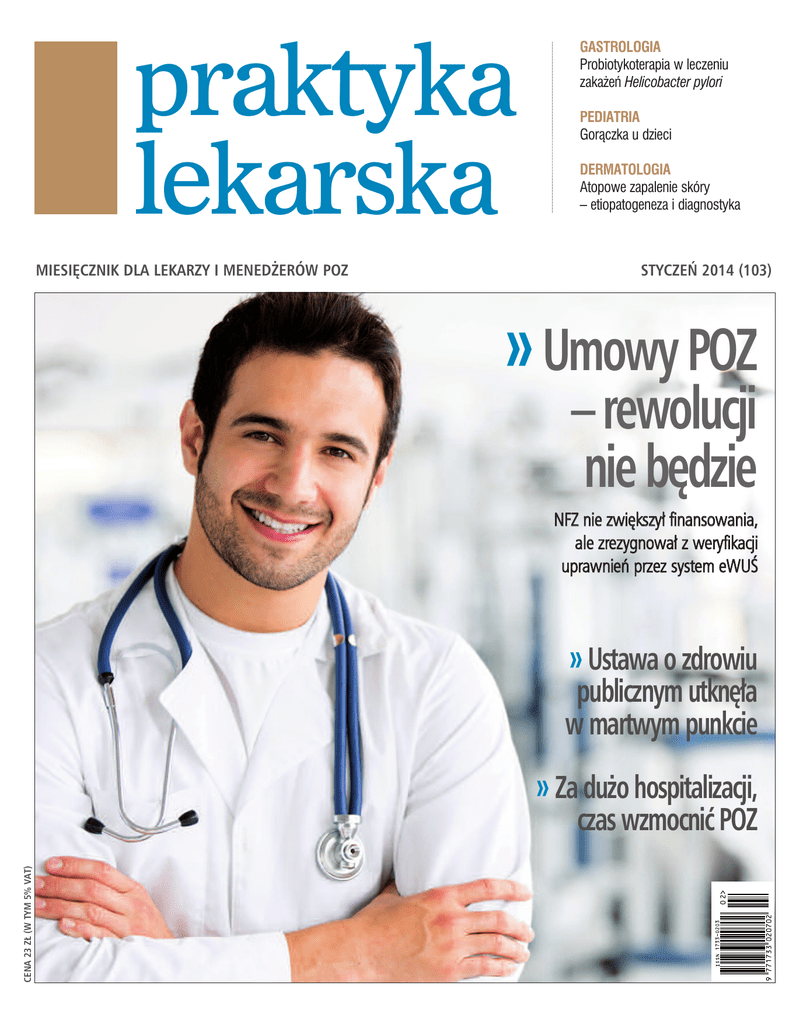 praktyka lekarska MIESIĘCZNIK DLA LEKARZY I MENEDŻERÓW POZ GASTROLOGIA Probiotykoterapia w leczeniu zakażeń Helicobacter pylori PEDIATRIA Gorączka u dzieci DERMATOLOGIA Atopowe zapalenie skóry – etiopatogeneza i diagnostyka STYCZEŃ 2014 (103) » Umowy POZ – rewolucji nie będzie NFZ nie zwiększył finansowania, ale zrezygnował z weryfikacji uprawnień przez system eWUŚ » Ustawa o zdrowiu publicznym utknęła w martwym punkcie » Za dużo hospitalizacji, CENA 23 ZŁ (W TYM 5% VAT) czas wzmocnić POZ OD REDAKCJI W NUMERZE KOMENTARZE 5 Historia przestała kołem się toczyć? lek. Joanna Zabielska-Cieciuch Znaj proporcjum, mocium panie lek. Małgorzata Stokowska-Wojda Życzenia na Nowy Rok dr n. med. Jacek Kozakiewicz AKTUALNOŚCI 6 Nowe – właściwie stare – władze okręgowych izb lekarskich W samorządzie bez dużych zmian: stanowiska prezesów objęły te same osoby, a większość nie miała rywali. Lekarze niechętnie kandydują, ale chętnie głosują. Zdaniem samorządowców, mimo małego zainteresowania najwyższym stanowiskiem, lekarze angażują się w życie izb. 7 Umowy POZ – rewolucji nie będzie NFZ nie zwiększył finansowania świadczeń, ale zrezygnował z weryfikacji uprawnień pacjenta przez system eWUŚ. 8 Rezydenci UE będą weryfikowani przez eWUŚ • E-zwolnienia już w 2015 roku | 9 Była prezes NFZ do końca broni systemu eWUŚ • Ustawa o zdrowiu publicznym utknęła w martwym punkcie • O rodzinnych – bez rodzinnych • Rodzinni w profilaktyce AIDS | 10 Niemcy: szybkie pozrozumienie w kwestii ochrony zdrowia • Anglicy nie chcą płacić za leczenie cudzoziemców | 11 Za dużo hospitalizacji, czas wzmocnić POZ • NIL instruuje, jak wystawiać paragony | 12 Europejska Legitymacja Zawodowa za 2 lata • NFZ pozywa ministra zdrowia • NFZ zapłaci mniej za cytologię • SONDA: Część świadczeniodawców podpisuje indywidualnie umowy z płatnikiem, kiedy organizacje jeszcze protestują i żądają zmian w ich zapisach. Czy jest to nielojalne wobec środowiska? | 13 NIK: Fundusz ma problemy z oszacowaniem świadczeń • E-rozwiązania dla medycyny nie spełniają kryteriów • Pacjenci domagają się zwrotu kosztów Rozmowa numeru 23 O roli lekarza rodzinnego w opiece nad pacjentami w starszym wieku rozmawiamy z prof. dr. hab. n. med. Zbigniewem Gaciongiem. Prawo 24 Dodatek probiotyku do terapii eradykacyjnej może nie tylko zmniejszać częstość występowania i nasilenie działań ubocznych leczenia, ale także zwiększać odsetek eradykacji. Probiotyki mogą więc wspomagać leczenie i zwiększać jego efektywność. dr n. med. Ewa Łoś-Rycharska, Katedra i Klinika Pediatrii, Alergologii i Gastroenterologii Szpitala Uniwersyteckiego w Bydgoszczy, Kierownik: prof. dr hab. n. med. Mieczysława Czerwionka-Szaflarska Błędy medyczne w orzecznictwie polskim i europejskim Świadomosć pacjentów wzrasta, znają swoje prawa i coraz cześciej dochodzi do tego, że pozywają lekarzy. Wyroki sądowe bardzo często okazują się dla lekarzy niekorzystne. Jest to zjawisko obserwowane nie tylko w Polsce, ale również w innych państawach Europy. MEDYCYNA PRAKTYCZNA Gastrologia 15 Probiotykoterapia w leczeniu zakażeń Helicobacter pylori Brakuje informacji o tym, jak pomagać naszym seniorom Praca za granicą 25 RPA – tylko dla najlepszych Przed podjęciem decyzji o wyjechaniu do pracy do RPA warto wcześniej spędzić kilka tygodni w tym kraju i upewnić się, że jesteśmy w stanie się tam zaaklimatyzować. Pediatria 17 Gorączka u dzieci Wśród leków przeciwgorączkowych stosowanych już u niemowląt podstawowe znaczenie odgrywają ibuprofen oraz paracetamol, działające na ośrodek termoregulacji. dr n. med. Bogumił Kiss, specjalista chorób dzieci, specjalista medycyny rodzinnej, NZOZ „Na Swobodnej” w Białymstoku Dermatologia 20 Atopowe zapalenie skóry – etiopatogeneza i diagnostyka W ostatnich latach obserwuje się coraz częstsze zachorowania na AZS, zwłaszcza w państwach uprzemysłowionych i rejonach wielkomiejskich. Patogeneza AZS nie jest w pełni wyjaśniona. lek. med. Marta Jeziorska, lek. med. Katarzyna Kisiel, lek. med. Magdalena Olechowska, lek. med. Magdalena Wołoszko, Oddział Dermatologii Dziecięcej MSS w Warszawie, Kierownik Oddziału: lek. med. Lidia Ruszkowska FOTOKRONIKA 27 Dyplomy po królewsku • Nagrody Szenajcha rozdane • Warto stawiać na rozwój zawodowy i empatię Sylwetka 26 Każdy skok jest inny Doktor Janusz Niewęgłowski nie lubi mówić za dużo o swojej pasji do spadochroniarstwa – powtarza, że tylko ten, kto choć raz to przeżył, może zrozumieć piękno tego sportu. Praktyka Lekarska styczeń 2014 3 KOMENTARZE KALENDARZ WYDARZEŃ OD REDAKCJI STYCZEŃ Nie przyzwyczajajmy się do niedobrego 10.01.2014, Warszawa, Kurs na preparatach nieutrwalonych: Biodro dziecięce – współczesne techniki operacyjne, cemed.pl 10-11.01.2014, Białowieża, Konferencja: Reumatologia w codziennej praktyce lekarza specjalisty, www.imed.pl 11.01.2014, Warszawa, Konferencja: Ortopedia dziecięca w pigułce, www.cemed.pl 22.01.2014, Warszawa, Konferencja: Pacjent polski, pacjent europejski – w wybranych zagadnieniach, www.termedia.pl 25.01.2014, Kielce, Konferencja: Rzeczowo o podatkach, prawie i finansach w prywatnej praktyce lekarskiej, www.konferencja.biurex.pl 27.01.2014, Kraków, Seminarium: Wybrane stany zagrożenia życia w opiece przedszpitalnej, www.mp.pl 28.01.2014, Kraków, Seminarium: Wykonanie i interpretacja monitorowania oraz zapisu EKG, www.mp.pl 31.01.2014, Kraków, VII Ogólnopolska Konferencja Kontrowersje w Pediatrii, www.symposion.pl LUTY Katarzyna Chrzanowska redaktor prowadząca Nadejście nowego roku związane jest z wiarą, że będzie lepiej. Tymczasem okazuje się, że w polskiej ochronie zdrowia będzie właściwie tak samo. Ta stałość boli, zwłaszcza jeśli chodzi o finansowanie świadczeń. Schyłek roku 2013 zapowiadał rewolucje, ale resort zdrowia załagodził