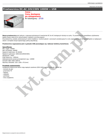 Informacje o produkcie Utworzono 07-03-2017 Przetwornica DC-AC 24V/230V 1000W + USB Cena : Ceny dostępne po zalogowaniu Nr katalogowy : 2715 m .p l Nasza przetwornica jest jednym z najnowocześniejszych inwerterów DC do AC dostępnych dzisiaj na rynku. Ta przetwornica, prawidłowo użytkowana będzie służyć wiele lat w samochodach, łodziach czy przyczepach. W przetwornicy zostało zastosowanych wiele środków w kontroli jakości i procesach produkcyjnych w celu zapewnienia, że ten wyrób będzie w najlepszym stanie i że będzie służył zapewniając pełną satysfakcję. Przetwornica wyposażona jest w gniazdo USB pozwalające np. ładować telefony komórkowe. Specyfikacja: Moc ciągła: 1000W Moc szczytowa: 2000W Napięcie wejściowe: 20-30VDC Napięcie wyjściowe: 100/110/120VAC50Hz Wydajność: >90% Prąd statyczny: <400mA Zabezpieczenie przed przeciążeniem wyj.: 1200W Gniazdo USB: 5VDC 500mA Wymiary (DxSxW): 310 x 200 x 70 [mm] lv t. co Przykłady zastosowania: Urządzenia elektryczne które mają napięcie zasilania 220V-240V i pobór mocy do 1000W np: - konsole do gier - przenośne TV - laptopy - netbooki - palmtopy - inne urządzenia Wygenerowano w programie www.oscGold.com