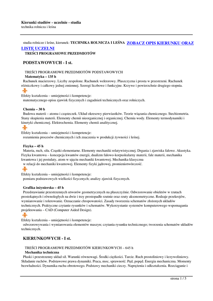 Kierunki studiów - uczelnie - studia technika rolnicza i leśna studia rolnicze i leśne, kierunek: TECHNIKA ROLNICZA I LEŚNA LISTĘ UCZELNI ZOBACZ OPIS KIERUNKU ORAZ TREŚCI PROGRAMOWE PRZEDMIOTÓW PODSTAWOWYCH - I st. TREŚCI PROGRAMOWE PRZEDMIOTÓW PODSTAWOWYCH Matematyka – 135 h Rachunek macierzowy. Liczby zespolone. Rachunek wektorowy. Płaszczyzna i prosta w przestrzeni. Rachunek różniczkowy i całkowy jednej zmiennej. Szeregi liczbowe i funkcyjne. Krzywe i powierzchnie drugiego stopnia. Efekty kształcenia – umiejętności i kompetencje: matematycznego opisu zjawisk fizycznych i zagadnień technicznych oraz rolniczych. Chemia – 30 h Budowa materii – atomu i cząsteczek. Układ okresowy pierwiastków. Teorie wiązania chemicznego. Stechiometria. Stany skupienia materii. Elementy chemii nieorganicznej i organicznej. Chemia wody. Elementy termodynamiki i kinetyki chemicznej. Elektrochemia. Elementy chemii analitycznej. Efekty kształcenia – umiejętności i kompetencje: rozumienia procesów chemicznych i ich znaczenia w produkcji żywności i leśnej. Fizyka – 45 h Materia, ruch, siła. Cząstki elementarne. Elementy mechaniki relatywistycznej. Drgania i zjawiska falowe. Akustyka. Fizyka kwantowa – koncepcja kwantów energii, dualizm falowo-korpuskularny materii, fale materii, mechanika kwantowa i jej postulaty, atom w ujęciu mechaniki kwantowej. Mechanika klasyczna w relacji do mechaniki kwantowej. Elementy fizyki jądrowej, promieniotwórczość. Efekty kształcenia – umiejętności i kompetencje: pomiaru podstawowych wielkości fizycznych; analizy zjawisk fizycznych. Grafika inżynierska – 45 h Przedstawianie przestrzennych utworów geometrycznych na płaszczyźnie. Odwzorowanie obiektów w rzutach prostokątnych i równoległych na dwie i trzy prostopadłe rzutnie oraz rzuty aksonometryczne. Rodzaje przekrojów, wymiarowanie i tolerowanie. Oznaczanie chropowatości. Zasady tworzenia schematów złożonych układów technicznych. Praktyczne czytanie rysunków i schematów. Wykorzystanie systemów komputerowego wspomagania projektowania – CAD (Computer Aided Design). Efekty kształcenia – umiejętności i kompetencje: odwzorowywania i wymiarowania elementów maszyn; czytania rysunku technicznego; tworzenia schematów układów technicznych. KIERUNKOWYCH - I st. TREŚCI PROGRAMOWE PRZEDMIOTÓW KIERUNKOWYCH – 645 h Mechanika techniczna Płaski i przestrzenny układ sił. Warunki równowagi. Środki ciężkości. Tarcie. Ruch prostoliniowy i krzywoliniowy. Składanie ruchów. Podstawowe prawa dynamiki. Praca, moc, sprawność. Pęd, popęd. Energia mechaniczna. Momenty bezwładności. Dynamika ruchu obrotowego. Podstawy mechaniki cieczy. Naprężenia i odkształcenia. Rozciąganie i strona 1 / 5 Kierunki studiów - uczelnie - studia technika rolnicza i leśna ściskanie. Ścinanie. Momenty statyczne bezwładności figur płaskich. Skręcanie. Zginanie. Wyboczenie. Hipotezy wytężeniowe. Efekty kształcenia – umiejętności i kompetencje: rozwiązywania podstawowych problemów technicznych w oparciu o prawa mechaniki i analizę wytrzymałościową. Konstrukcja maszyn Struktura mechanizmów. Metody wyznaczania trajektorii ruchu, prędkości, przyspieszeń i sił. Bilans energetyczny maszyny. Wyrównoważenie mas. Tolerancje i pasowania. Chropowatość i falistość powierzchni. Połączenia. Elementy sprężyste. Łożyskowanie. Osie, wały, sprzęgła i hamulce. Przekładnie mechaniczne. Obliczenia wytrzymałościowe części maszyn. Efekty kształcenia – umiejętności i kompetencje: projektowania i wykonywania obliczeń wytrzymałościowych części maszyn. Nauka o materiałach Struktura i własności materiałów technicznych i biologicznych. Stale, staliwa, żeliwa. Tworzywa sztuczne. Ceramika i kompozyty. Drewno i inne materiały naturalne. Materiały do produkcji rolniczej. Metody badania materiałów o różnej strukturze. Efekty kształcenia – umiejętności i kompetencje: stosowania materiałów w technice rolniczej i leśnej. Elektrotechnika i elektronika Pole elektryczne i magnetyczne. Obwody prądu stałego oraz przemiennego jedno- i trójfazowego. Obliczenia obwodów elektrycznych. Pomiary podstawowych wielkości elektrycznych. Maszyny elektryczne. Napęd elektryczny. Instalacje elektryczne. Ochrona przeciwporażeniowa. Wytwarzanie, przesyłanie i użytkowanie energii elektrycznej. Układy elektroniczne i ich elementy. Energoelektronika. Efekty kształcenia – umiejętności i kompetencje: eksploatacji urządzeń elektrycznych i elektronicznych. Automatyka Pojęcia podstawowe i klasyfikacja układów automatyki. Modele matematyczne elementów i układów automatyki. Struktura układów regulacji. Stabilność. Ocena przebiegów przejściowych. Układy z regulatorami mikroprocesorowymi i sterownikami stosowane w rolnictwie i przemyśle spożywczym. Wybrane układy nieliniowe. Efekty kształcenia – umiejętności i kompetencje: eksploatacji systemów automatyki w rolnictwie i przemyśle spożywczym. Technika cieplna i gospodarka energetyczna Zasady termodynamiki. Przemiany odwracalne gazów. Para wodna. Wymiana ciepła. Suszenie płodów rolnych. Wymienniki. Obiegi termiczne chłodziarek. Pompy ciepła. Termodynamika procesu spalania. Pierwotne i wtórne nośniki energii. Systemy dystrybucji nośników i mediów energetycznych. Bilansowanie potrzeb energetycznych obiektów – audyt energetyczny. Odnawialne źródła energii. Energetyczne systemy hybrydowe. Efekty kształcenia – umiejętności i kompetencje: modelowania matematycznego wymiany ciepła i masy w procesach technologicznych; bilansowania źródeł energii; racjonalizacji użytkowania energii. strona 2 / 5 Kierunki studiów - uczelnie - studia technika rolnicza i leśna Produkcja rolnicza i leśna Podstawy produktywności roślin. Zadania uprawy roli i nawożenia – nowe kierunki w uprawie. Polowa produkcja roślinna. Pielęgnowanie i zbiór roślin uprawnych. Znaczenie go