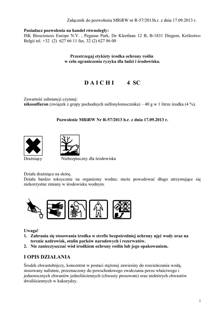 Załącznik do pozwolenia MRiRW nr R-57/2013h.r. z dnia 17.09.2013 r. Posiadacz pozwolenia na handel równoległy: ISK Biosciences Europe N.V. , Pegasus Park, De Kleetlaan 12 B, B-1831 Diegem, Królestwo Belgii tel. +32 (2) 627 66 11 fax. 32 (2) 627 86 00 Przestrzegaj etykiety środka ochrony roślin w celu ograniczenia ryzyka dla ludzi i środowiska. DAICHI 4 SC Zawartość substancji czynnej: nikosulfuron (związek z grupy pochodnych sulfonylomocznika) – 40 g w 1 litrze środka (4 %). Pozwolenie MRiRW Nr R-57/2013 h.r. z dnia 17.09.2013 r. Drażniący Niebezpieczny dla środowiska Działa drażniąco na skórę. Działa bardzo toksycznie na organizmy wodne; może powodować długo utrzymujące się niekorzystne zmiany w środowisku wodnym. Uwaga! 1. Zabrania się stosowania środka w strefie bezpośredniej ochrony ujęć wody oraz na terenie uzdrowisk, otulin parków narodowych i rezerwatów. 2. Nie zanieczyszczać wód środkiem ochrony roślin lub jego opakowaniem. I OPIS DZIAŁANIA Środek chwastobójczy, koncentrat w postaci stężonej zawiesiny do rozcieńczania wodą, stosowany nalistnie, przeznaczony do powschodowego zwalczania perzu właściwego i jednorocznych chwastów jednoliściennych (chwasty prosowate) oraz niektórych chwastów dwuliściennych w kukurydzy. 1 Daichi 4 SC jest selektywnym herbicydem o działaniu systemicznym. Pobierany jest głównie poprzez liście i szybko przemieszczany w roślinie, hamując jej wzrost i rozwój. Wzrost chwastów zostaje zahamowany wkrótce po zastosowaniu środka, po czym następuje stopniowe przebarwianie się roślin. Chwasty zamierają całkowicie po 20-25 dniach od zabiegu. Środek działa najskuteczniej na młode, intensywnie rosnące chwasty. Ciepła i wilgotna pogoda przyspiesza działanie środka, chłodna i sucha może je opóźnić. Chwasty wrażliwe np.: jednoroczne jednoliścienne: chwastnica jednostronna, jednoliścienne wieloletnie: perz właściwy, dwuliścienne jednoroczne: fiołek polny, gorczyca polna, gwiazdnica pospolita, jasnota purpurowa, przytulia czepna, rdest powojowaty, szarłat szorstki, tasznik pospolity, tobołki polne, żółtlica drobnokwiatowa, Chwasty średnio wrażliwe np.: bodziszek drobny, komosa biała. Chwasty odporne np.: odporne są chwasty średnio wrażliwe w późniejszych fazach rozwojowych, (powyżej 6 liści), skrzyp polny. II ZAKRES STOSOWANIA, TERMINY I DAWKI KUKURYDZA Zabieg wykonać wcześnie po wschodach w fazie 2-7 liści kukurydzy. Zwalczanie perzu właściwego Zabieg wykonać, gdy większość roślin osiągnęła wysokość 15-20 cm (perz ma wtedy 5-7 liści). Zalecana dawka: 1-1,5 l/ha. Wyższą z zalecanych dawek stosować w przypadku bardzo silnego zachwaszczenia perzem. Zwalczanie chwastnicy jednostronnej i innych chwastów prosowatych. Zabieg wykonać gdy chwasty są w fazie 3 liści do końca fazy krzewienia. Zalecana dawka: 1 l/ha. Zwalczanie chwastów dwuliściennych Zabieg wykonać, gdy większość chwastów (ponad 50%) znajduje się w fazie 2-4 liści. Zalecana dawka: 1 l/ha (chwasty jednoroczne). Zalecana ilość wody: 200-300 l/ha. Zalecane opryskiwanie: średniokropliste. UWAGA W warunkach niekorzystnych dla wzrostu i rozwoju kukurydzy po zastosowaniu środka mogą wystąpić przemijające zniekształcenia liści, przebarwienia oraz wstrzymanie wzrostu roślin. Szczególnie silnie mogą reagować odmiany: Contessa, Fart, Frida, Koka, Melina, Mieszko, Mona i Trophee. NASTĘPSTWO ROŚLIN W przypadku wcześniejszej likwidacji plantacji można siać bez ograniczeń kukurydzę jako roślinę następczą lub: − zboża - po 3 miesiącach - na glebach kwaśnych) po 9 miesiącach - na glebach obojętnych i zasadowych, − strączkowe - po 9 miesiącach − lucernę - po 12 miesiącach. Wiosną następnego roku można uprawiać wszystkie rośliny. 2 III OKRES KARENCJI okres od dnia ostatniego zabiegu do dnia zbioru roślin przeznaczonych do konsumpcji NIE DOTYCZY IV OKRES PREWENCJI DLA LUDZI, ZWIERZĄT, PSZCZÓŁ okres zapobiegający zatruciu NIE DOTYCZY V PRZECIWWSKAZANIA 1. Środka nie stosować: − w kukurydzy cukrowej, pękającej i w uprawie materiałów hodowlanych − w fazie rozwojowej kukurydzy powyżej 7 liści − na odmianę kukurydzy Koka 2. Zabiegu nie wykonywać: − bezpośrednio po okresie długotrwałych chłodów na rośliny, których wzrost został zahamowany wskutek niskich temperatur; zabieg można wykonać po wznowieniu intensywnego wzrostu kukurydzy − w temperaturze powietrza poniżej 10oC i powyżej 25oC − na rośliny osłabione i uszkodzone przez przymrozki, suszę, szkodniki lub choroby − na rośliny mokre (rosa, deszcze) Podczas stosowania środka nie dopuścić do: − znoszenia cieczy użytkowej na sąsiednie rośliny uprawne − nakładania się cieczy użytkowej na stykach pasów zabiegowych i uwrociach. VI SPORZĄDZANIE CIECZY UŻYTKOWEJ Przed przystąpieniem do sporządzania cieczy użytkowej dokładnie ustalić potrzebną jej ilość. Zawartością opakowania przed użyciem wstrząsnąć. Odmierzoną ilość środka wlać do zbiornika opryskiwacza napełnionego częściowo wodą z włączonym mieszadłem i uzupełnić wodą do potrzebnej ilości. Po wlaniu środka do zbiornika opryskiwacza nie wyposażonego w mieszadło hydrauliczne ciecz w zbiorniku mechanicznie wymieszać. Opróżnione opakowania przepłukać trzykrotnie wodą, a popłuczyny wlać do zbiornika opryskiwacza z cieczą użytkową. W przypadku przerw w opryskiwaniu przed ponownym przystąpieniem do pracy, dokładnie wymieszać ciecz użytkową w zbiorniku opryskiwacza. Po pracy aparaturę dokładnie wymyć. VII PRZECHOWYWANIE Nie przechowywać razem z żywnością, napojami i paszami dla zwierząt. Przechowywać pojemnik szczelnie zamknięty. Przechowywać z dala od źródeł ciepła. Przechowywać wyłącznie w oryginalnym opakowaniu w temperaturze nie przekraczającej zakresu 0-30oC. Chronić przed dziećmi. 3 VIII WARUNKI BEZPIECZNEGO STOSOWANIA ŚRODKA − − −