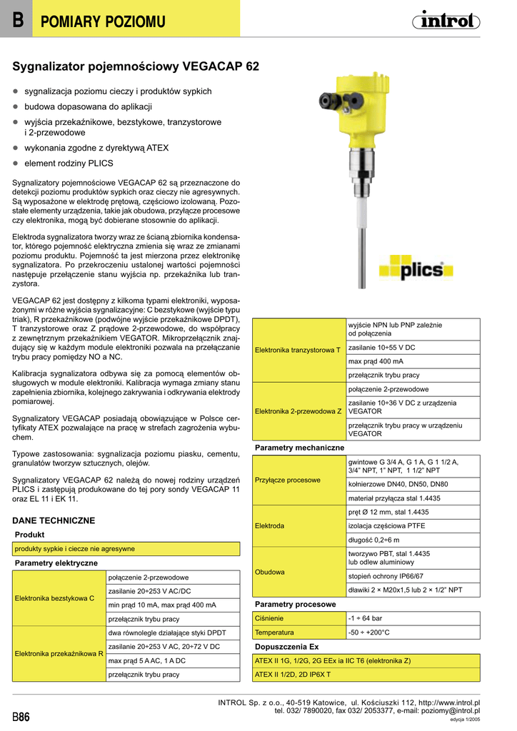 B POMIARY POZIOMU Sygnalizator pojemnościowy VEGACAP 62 ● sygnalizacja poziomu cieczy i produktów sypkich ● budowa dopasowana do aplikacji ● wyjścia przekaźnikowe, bezstykowe, tranzystorowe i 2-przewodowe ● wykonania zgodne z dyrektywą ATEX ● element rodziny PLICS Sygnalizatory pojemnościowe VEGACAP 62 są przeznaczone do detekcji poziomu produktów sypkich oraz cieczy nie agresywnych. Są wyposażone w elektrodę prętową, częściowo izolowaną. Pozostałe elementy urządzenia, takie jak obudowa, przyłącze procesowe czy elektronika, mogą być dobierane stosownie do aplikacji. Elektroda sygnalizatora tworzy wraz ze ścianą zbiornika kondensator, którego pojemność elektryczna zmienia się wraz ze zmianami poziomu produktu. Pojemność ta jest mierzona przez elektronikę sygnalizatora. Po przekroczeniu ustalonej wartości pojemności następuje przełączenie stanu wyjścia np. przekaźnika lub tranzystora. VEGACAP 62 jest dostępny z kilkoma typami elektroniki, wyposażonymi w różne wyjścia sygnalizacyjne: C bezstykowe (wyjście typu triak), R przekaźnikowe (podwójne wyjście przekaźnikowe DPDT), T tranzystorowe oraz Z prądowe 2-przewodowe, do współpracy z zewnętrznym przekaźnikiem VEGATOR. Mikroprzełącznik znajdujący się w każdym module elektroniki pozwala na przełączanie trybu pracy pomiędzy NO a NC. Kalibracja sygnalizatora odbywa się za pomocą elementów obsługowych w module elektroniki. Kalibracja wymaga zmiany stanu zapełnienia zbiornika, kolejnego zakrywania i odkrywania elektrody pomiarowej. wyjście NPN lub PNP zależnie od połączenia Elektronika tranzystorowa T max prąd 400 mA przełącznik trybu pracy połączenie 2-przewodowe zasilanie 10÷36 V DC z urządzenia Elektronika 2-przewodowa Z VEGATOR Sygnalizatory VEGACAP posiadają obowiązujące w Polsce certyfikaty ATEX pozwalające na pracę w strefach zagrożenia wybuchem. Typowe zastosowania: sygnalizacja poziomu piasku, cementu, granulatów tworzyw sztucznych, olejów. Sygnalizatory VEGACAP 62 należą do nowej rodziny urządzeń PLICS i zastępują produkowane do tej pory sondy VEGACAP 11 oraz EL 11 i EK 11. zasilanie 10÷55 V DC przełącznik trybu pracy w urządzeniu VEGATOR Parametry mechaniczne gwintowe G 3/4 A, G 1 A, G 1 1/2 A, 3/4” NPT, 1” NPT, 1 1/2” NPT Przyłącze procesowe kołnierzowe DN40, DN50, DN80 materiał przyłącza stal 1.4435 pręt Ø 12 mm, stal 1.4435 DANE TECHNICZNE Elektroda Produkt izolacja częściowa PTFE długość 0,2÷6 m produkty sypkie i ciecze nie agresywne tworzywo PBT, stal 1.4435 lub odlew aluminiowy Parametry elektryczne Obudowa połączenie 2-przewodowe stopień ochrony IP66/67 dławiki 2 × M20x1,5 lub 2 × 1/2” NPT zasilanie 20÷253 V AC/DC Elektronika bezstykowa C min prąd 10 mA, max prąd 400 mA Parametry procesowe przełącznik trybu pracy Ciśnienie -1 ÷ 64 bar dwa równolegle działające styki DPDT Temperatura -50 ÷ +200°C zasilanie 20÷253 V AC, 20÷72 V DC Dopuszczenia Ex max prąd 5 A AC, 1 A DC ATEX II 1G, 1/2G, 2G EEx ia IIC T6 (elektronika Z) przełącznik trybu pracy ATEX II 1/2D, 2D IP6X T Elektronika przekaźnikowa R B86 INTROL Sp. z o.o., 40-519 Katowice, ul. Ko ściusz ki 112, http://www.introl.pl tel. 032/ 7890020, fax 032/ 2053377, e-mail: [email protected] edycja 1/2005 POMIARY POZIOMU B WYMIARY Obudowa ze stali VEGACAP 62 z przyłączem gwintowym VEGACAP 62 z adapterem temperaturowym 100mm (3 15/16") G 3/4 A, G 1 A, G 11/2 A ø16mm (5/8") ø 40mm (1 37/64") L Obudowa aluminiowa 73mm (2 7/8") 22 2 1/4" 56 mm (2 1/4") Obudowa z tworzywa 12mm (15/32") SCHEMATY POŁĄCZEŃ Elektronika C z wyjściem bezstykowym Elektronika R z wyjściem przekaźnikowym 1 6 2 6 1 2 3 3 5 5 4 4 Elektronika T z wyjściem tranzystorowym Opisy do rysunków: 6 1 2 3 1. potencjometr do ustawiania punktu pracy 2. mikroprzełącznik wyboru zakresu pomiarowego 3. mikroprzełącznik wyboru trybu pracy 4. zacisk uziemienia 5. listwa zaciskowa 6. lampka kontrolna 5 4 INTROL Sp. z o.o., 40-519 Katowice, ul. Ko ściusz ki 112, http://www.introl.pl tel. 032/ 7890020, fax 032/ 2053377, e-mail: [email protected] edycja 1/2005