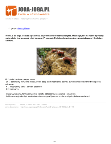 ścieżka do tekstu: / strona główna /kuchnia /przepisy / grupa: dania główne Kiełki, a do tego jeszcze z pszenicy, to prawdziwy wiosenny rarytas. Można je jeść na różne sposoby, najprościej jest posypać nimi kanapki. Proponuję Państwu jednak coś oryginalniejszego kotlety z kiełków. O płatki owsiane, pieprz, curry Sn zalewamy niewielką ilością wody, żeby płatki rozmiękły, solimy, ewentualnie dolewamy trochę sosu sojowego K wsypujemy kiełki i zarodki pszenne G rozmaryn Masę wyrabiamy, formujemy z niej kotlety, obtaczamy w sezamie i smażymy. Jeśli masa wyjdzie zbyt wodnista można dosypać jeszcze trochę suchych płatków owsianych. data wydruku: wtorek, 7 marca 2017 roku 12:36:45 adres dokumentu: http://www.joga-joga.pl//index.php?LANG=pl&page_ID=139&art_ID=176 1/1