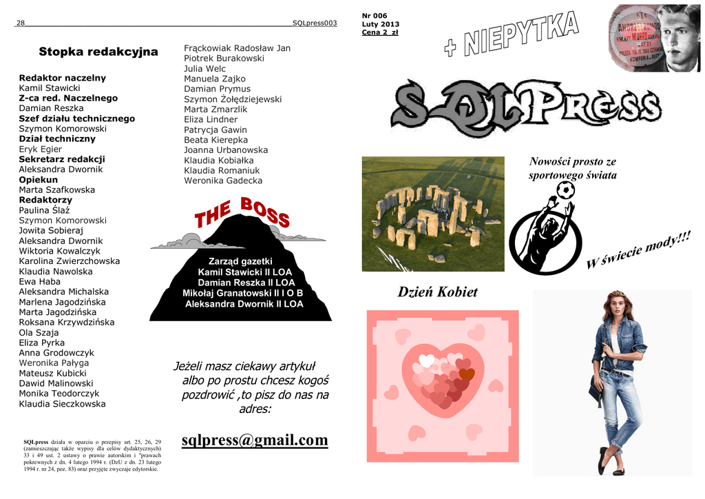 28_______________________________________________________________SQLpress003 Stopka redakcyjna Redaktor naczelny Kamil Stawicki Z-ca red. Naczelnego Damian Reszka Szef działu technicznego Szymon Komorowski Dział techniczny Eryk Egier Sekretarz redakcji Aleksandra Dwornik Opiekun Marta Szafkowska Redaktorzy Paulina Ślaź Szymon Komorowski Jowita Sobieraj Aleksandra Dwornik Wiktoria Kowalczyk Karolina Zwierzchowska Klaudia Nawolska Ewa Haba Aleksandra Michalska Marlena Jagodzińska Marta Jagodzińska Roksana Krzywdzińska Ola Szaja Eliza Pyrka Anna Grodowczyk Weronika Pałyga Mateusz Kubicki Dawid Malinowski Monika Teodorczyk Klaudia Sieczkowska SQLpress działa w oparciu o przepisy art. 25, 26, 29 (zamieszczając także wypisy dla celów dydaktycznych) 33 i 49 ust. 2 ustawy o prawie autorskim i "prawach pokrewnych z dn. 4 lutego 1994 r. (DzU z dn. 23 lutego 1994 r. nr 24, poz. 83) oraz przyjęte zwyczaje edytorskie. Nr 006 Luty 2013 Cena 2 zł Frąckowiak Radosław Jan Piotrek Burakowski Julia Welc Manuela Zajko Damian Prymus Szymon Żołędziejewski Marta Zmarzlik Eliza Lindner Patrycja Gawin Beata Kierepka Joanna Urbanowska Klaudia Kobiałka Klaudia Romaniuk Weronika Gadecka Zarząd gazetki Kamil Stawicki II LOA Damian Reszka II LOA Mikołaj Granatowski II l O B Aleksandra Dwornik II LOA Jeżeli masz ciekawy artykuł albo po prostu chcesz kogoś pozdrowić ,to pisz do nas na adres: [email protected] Nowości prosto ze sportowego świata M ist y W ik DzieńfKobiet ac ja! !! y!!! d o cie m e i w ś 2_______________________________________________________________SQLpress003 SQLpress003________________________________________________________________27 Spis treści Wstępniak Newsy z życia szkoły 3 4-5 Dopadła cię grypa? - Nie poddawaj się! 6 A teraz nauka 7 Czekolada lekarstwem na złe samopoczucie 8 Dieta na 5+ 9 Dżinsy - Trendy na wiosnę i lato 10 Warkocze znów modne 11 Dzień Kobiet!!! 12-13 Super Środek 14-15 Nasze Próby Epickie 16-17 Dj War w Barlinku 18 Mistyfikacja Stonehenge 19 Kącik Poetycki 20-21 Real Madryt vs. Manchester United 22 Arsenal Pokonany 23 Misz - Masz 24-25 Pozdrowienia 26 Betoniarnia Dżołków 27 Stopka Redakcyjna 28 W zoo zwiedzający pyta dozorcę: -Kiedy pan będzie karmił małpy? -A co, jest pan głodny? Blondynce dzwoni telefon w torebce. Grzebie, grzebie i po dłuższej chwili nie owocnych poszukiwań stwierdza: - No tak, pewnie zgubiłam. - Dlaczego Tupac umarł? - Wystarczy przeczytać jego ksywkę od tyłu. - Kiedy to jest, gdy ma się mieszane uczucia? - Gdy teściowa spada w przepaść twoim samochodem. - Jak zająć blondynkę na kilka godzin? - Powiedzieć, żeby znalazła patyk z jednym końcem. - Jaka jest definicja "wymiany opinii"? - Kiedy idziesz do szefa ze swoją opinią, a wychodzisz z opinią szefa. 26_______________________________________________________________SQLpress003 Pozdrawiam Anonim J.A. :) :* Julka, jesteś cudowna! <3 Pozdrowienia dla Marty Zmarzlik ( Cichy Wielbiciel) :) Pozdrowienia dla „ Małego Ł” - Miśku :* Pozdrowienia dla Chrystiana i Krystiana z 1 LOC <3! Pozdrowienia dla dredziar :P Pozdrowienia dla Starego od Simiego Pozdrowienia dla Patrysi Gawin <33 Pozdrowienia dla Asi ( kocham Cię) K.K. Pozdrowienia dla Mickiewicza z klasy I LOB (K.K. :*) <33 Pozdrowienia dla Claudii Kobiałki ( niech się cieszy, że ktoś ją pozdrawia) <3 Pozdrowienia dla Beaty Kierepki! ;DD Pozdrowienia dla Justyny Pozdrowienia dla Elizy Czubek <3 M.Z. J.W. Pani Marta S najlepsza jest!! Pozdrawiają Manuela i Julia Cieplutkie pozdrowienia dla supernowej Pani Profesor Wawrzyniak od ciekawskiej klasy 1 LOB :) Pozdrowienia dla Macieja 1 LOB Jesteś najlepszy! Manuela i Julia - jesteście piękne! <3 Eliza :) Boski! <3 ( Arciuszek!!) Pozdrowienia dla Kofeja. Kamrat :D SQLpress003________________________________________________________________3 Wstępniak Czytelniku, w imieniu całej redakcji witam Cię w lutowym wydaniu gazetki. Ferie zimowe pozwoliły nam odzyskać siły, zabawić się i spędzić więcej czasu z rodziną i przyjaciółmi. Luty jest także miesiącem zakochanych i pewnie duża część z was właśnie na tym się skupiła. W poprzednim numerze mogliście znaleźć ciekawostki i przydatne porady w temacie święta zakochanych, natomiast teraz panowie dzięki poradom naszych dziennikarzy uda wam się zaskoczyć swoje drugie połówki. Serdecznie zapraszam do zapoznania się ze wszystkimi artykułami i relacjami, jakie są przedstawione w tym numerze. Pozdrawiam Szymon Jan Komorowski [email protected] 4_______________________________________________________________SQLpress003 Mickiewicz wielkim poetą był… 25 stycznia klasa 2 LOA na łączonych lekcjach woku i j. polskiego podsumowała swoje zmagania z twórczością Adama Mickiewicza. Osobliwości naszego regionu!!! 22.01.2013 roku w Zespole Szkół Ponadgimnazjalnych nr. 1 w Dębnie odbyła się sesja popularnonaukowa. Brali w niej udział też uczniowie naszej szkoły. Mistrzostwa Powiatu w Piłkę Ręczną W piątek 15.02.2013r. w hali sportowej OSiR przy ulicy Piłsudzkiego 10 w Dębnie rozegrane zostały Mistrzostwa Powiatu Myśliborskiego w piłce ręcznej dziewcząt i chłopców szkół ponadgimnazjalnych. Drużyna chłopców mimo swej bardzo dobrej postawy nie powtórzyła sukcesu sprzed roku i nie obroniła tytułu Mistrza Powiatu. SQLpress003________________________________________________________________25 Zima 3 razy TAK dla owoców! Wspomnienie lata! Owoce i ich magiczne właściwości. Są takie pyszne i takie zdrowe!... GRUSZKA-wspomaga wzrost, występująca w niej ryboflawina jest niezbędna do wzrostu organizmu, a także poprawia kondycję włosów, skóry i paznokci. Maślanka: 2 gruszki, 2 łyżki miodu, 2 łyżki soku z cytryny, 200 ml maślanki. Przygotowanie: Obierz owoce ( pozbądź się gniazd nasiennych) i zmiksuj na gładka masę z resztą składników. Włóż do lodówki na 30 min. Smoothie: 400g gruszek, 1 pomarańcza, cukier wanilin