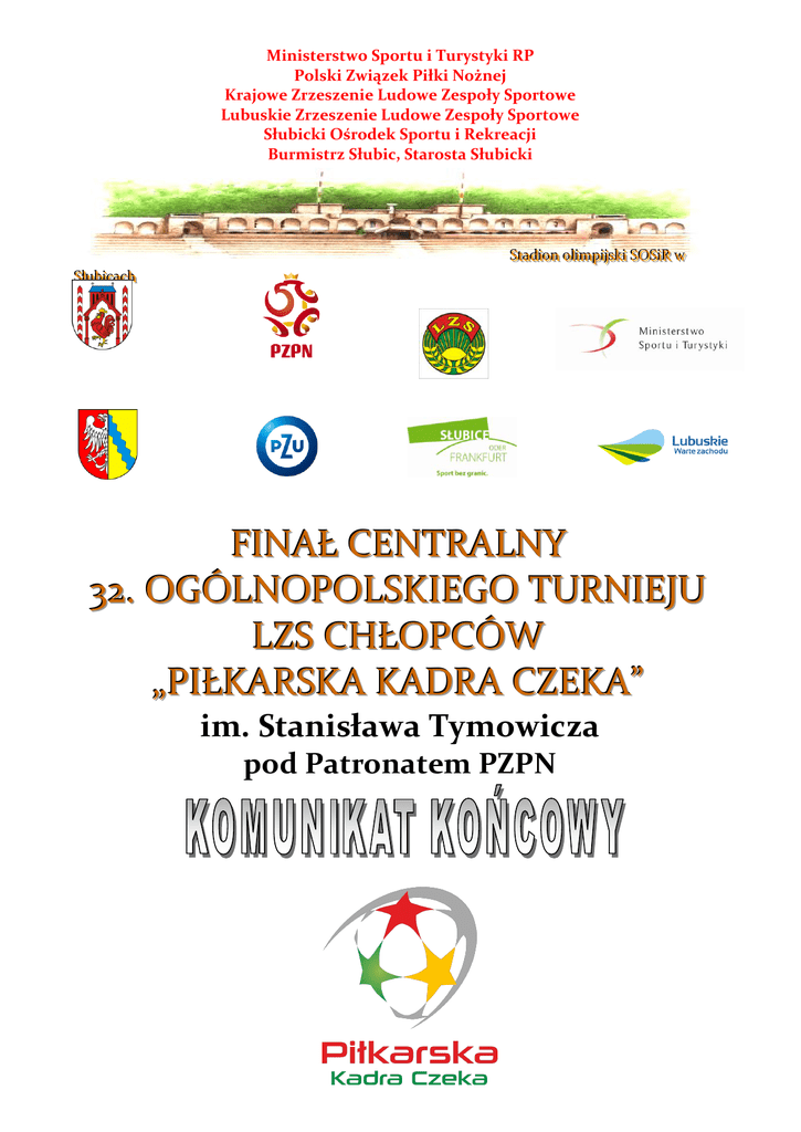 Ministerstwo Sportu i Turystyki RP Polski Związek Piłki Nożnej Krajowe Zrzeszenie Ludowe Zespoły Sportowe Lubuskie Zrzeszenie Ludowe Zespoły Sportowe Słubicki Ośrodek Sportu i Rekreacji Burmistrz Słubic, Starosta Słubicki SSttaaddiioonn oolliim mppiijjsskkii SSO OSSiiRR w w SSłłuubbiiccaacchh FINAŁ CENTRALNY 32. OGÓLNOPOLSKIEGO TURNIEJU LZS CHŁOPCÓW „PIŁKARSKA KADRA CZEKA” im. Stanisława Tymowicza pod Patronatem PZPN Szanowni Państwo ! Mam wielką satysfakcję i jest mi niezmiernie miło, że po raz kolejny Słubice znalazły swoje miejsce na mapie piłkarskiej Polski, będąc gospodarzem Finału Centralnego 32. Ogólnopolskiego Turnieju „Piłkarska Kadra Czeka”. Jest to powód do dumy i nagroda za wysiłek i trud działaczy sportowych, jak również dowód, że obiekty sportowe Słubickiego Ośrodka Sportu i Rekreacji cieszą się dużym uznaniem władz Krajowego Zrzeszenia LZS, a jego załoga potrafi realizować najbardziej ambitne zadania. Mieszkańcy Słubic mieli kolejną możliwość udziału w atrakcyjnej imprezie sportowej, a uczestnictwo w tych zawodach przyniosło zawodnikom wiele ciekawych wrażeń oraz mnóstwo sportowej satysfakcji. FINAŁ CENTRALNY 32. OGÓLNOPOLSKIEGO TURNIEJU LZS CHŁOPCÓW „PIŁKARSKA KADRA CZEKA” IM. STANISŁAWA TYMOWICZA POD PATRONATEM POLSKIEGO ZWIĄZKU PIŁKI NOŻNEJ AMBASADOR TURNIEJU RAFAŁ ZBIGNIEW KACZMARCZYK SŁUBICE 08-14.08.2016 r. W dniach 08-14.08.2016 odbył się Finał Centralny 32. Ogólnopolskiego Turnieju LZS Chłopców „Piłkarska Kadra Czeka im. Stanisława Tymowicza” pod Patronatem Polskiego Związku Piłki Nożnej. Organizatorami „Turnieju Centralnego” byli: Krajowe Zrzeszenia Ludowe Zespoły Sportowe Lubuskie Zrzeszenie LZS w Gorzowie WLKP Partnerami „Turnieju Centralnego” byli: Polski Związek Piłki Nożnej Marszałek Województwa Lubuskiego Wojewoda Lubuski Starosta Słubicki Burmistrz Słubic Słubicki Ośrodek Sportu i Rekreacji Sport Team Pro Servis Colloseum Marketing Sport MKS Polonia Słubice Finansowanie „Turnieju Centralnego”: Finał Centralny dofinansowano ze środków Ministerstwa Sportu i Turystyki RP Główne zamierzenia Turnieju: Wyłonienie najlepszego zespołu Finału w kategorii chłopców, Zapoznanie z historią i walorami turystycznymi Słubic i Frankfurtu nad Odrą, woj. Lubuskiego, „Euroregionu Pro Europa Viadrina”, Wymiana doświadczeń w pracy szkoleniowej z młodzieżą, Popularyzacja sportu w środowisku wiejskim. Finały przeprowadzono na obiektach Słubickiego Ośrodka Sportu i Rekreacji w Słubicach, w których udział wzięło 15 zespołów w kategorii chłopców, wyłonionych w drodze eliminacji wojewódzkich. Z przyczyn obiektywnych nie dojechał do Słubic zespół UKS Fala Świekatowo- woj. kujawsko-pomorskie. Turniej został rozegrany w dwóch rundach: eliminacyjnej- 4 grupy systemem „każdy z każdym” (skład grup rozlosowano na odprawie technicznej w dniu 08.08.2016) finałowej- (ćwierćfinały, półfinały, finały)- systemem pucharowym (zespoły, które zajęły I i II m-ca w grupach) GRUPA A 1/ LKS IZDEBKI 2/ LKS „NAPRZÓD” CZYŻOWICE 3/ KS „POLONIA” ŚRODA WLKP 4/ GOSRIT LUZINO woj. podkarpackie woj. śląskie woj. wielkopolskie woj. pomorskie GRUPA B 5/ MGLKS „MECHANIK” BOBOLICE 6/ WULKS „KORONA” WSCHOWA 7/ LKS „GRÓD” PODEGRODZIE 8/ GLKS NADARZYN woj. zach.-pomorskie woj. lubuskie woj. małopolskie woj. mazowieckie GRUPA C 9/ LKS „CERAMIKA” OPOCZNO 10/GIMNAZJUM W BAKAŁARZEWIE 11/ MLKS „ZNICZ” BIAŁA PISKA 12/ MGKS OŁAWA 1945 woj. łódzkie woj. podlaskie woj. warm.-mazurskie woj. dolnośląskie GRUPA D 13/ GIMNAZJUM NR CHĘCINY 14/ LZS przy ZS w HUCIE DĄBROWA 15/ PUBLICZNE GIMNAZJUM ŁAMBINOWICE woj. świętokrzyskie woj. lubelskie woj. opolskie W ceremonii otwarcia „Finału”, która odbyła się w dniu 9 sierpnia 2016 r. udział wzięli: Michał Dziubak- Dyrektor Biuro KZ LZS w Warszawie, Sławomir Kulczyński- Dyrektor Departamentu Infrastruktury Społecznej Urzędu Marszałkowskiego w Zielonej Górze, Jan Graliński- Prezes Lubuskiego Zrzeszenia LZS w Gorzowie WLKP, Ryszard Chustecki- Członek RG Krajowego Zrzeszenia LZS w Warszawie, Tomasz Ciszewicz- Burmistrz Słubic, Mariusz Olejniczak- Przewodniczący Rady Miejskiej w Słubicach, Jarosław Sadowski- Wiceprzewodniczący Rady Miejskiej w Słubicach, Tomasz Stupienko- Wicestarosta Słubicki, Zbigniew Sawicki- Prezes SOSiR Słubice, Piotr Klecha- Prezes Pomorskiego Zrzeszenia LZS, a także zespoły startujące w „Turnieju finałowym” oraz mieszkańcy Słubic. Wprowadzenia poszczególnych reprezentacji na trybunę stadionu i złożenia meldunku o gotowości rozpoczęcia 32 Finału Centralnego Chłopców „Piłkarska Kadra Czeka” dokonał pan Albin Kiedrowski. Meldunek przyjął pan Michał Dziubak- Dyrektor RG KZ LZS w Warszawie. Podczas uroczystości Otwarcia pan Michał Dziubak serdecznie powitał wszystkich uczestników życząc im sukcesów w rywalizacji sportowej i przekazał pozdrowienia uczestnikom Finału w imieniu pana Władysława Kosiniak- Kamysza- Przewodniczącego Rady Głównej Krajowego Zrzeszenia LZS. Pan Jan Graliński- Prezes Lubuskiego Zrzeszenia LZS przekazał gratulacje uczestniczącym zespołom, a młodym piłkarzom życzył osiągnięcia jak najlepszych wyników w rywalizacji sportowej. Pan Tomasz Ciszewicz- Burmistrz Słubic podziękował z kolei za przyjazd do Słubic i dokonał oficjalnego Otwarcia Turnieju. W uroczystości Otwarcia wziął również udział Rafał Zbigniew Kaczmarczyk- Ambasador Turnieju PROGRAM FINAŁU CENTRALNEGO 08.08.2016r. (PONIEDZIAŁEK) Do 17.00- Przyjazd uczestników, zakwaterowanie Godz. 17,30 – 20,00 – kolacja stołówka SOSiR Godz. 19,00 – Odprawa techniczna, Weryfikacja dokumentów/ Klub Olimpijczyka SOSIR Słubice /. 09.08.2016r. (WTOREK) Godz. 7,00 – 8,30 – śniadanie w miejscu zakwaterowania / stołówka SOSIR, „Witkacy” DS CP, internat Zespołu Szkół Technicznych / 