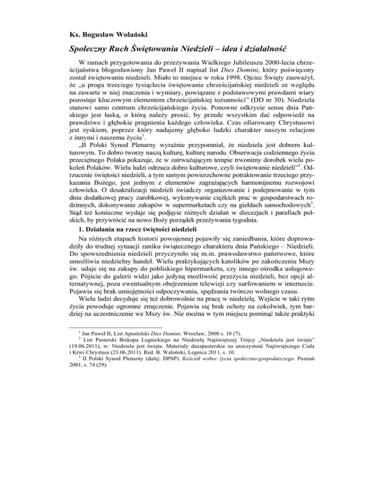 Ks. Bogusław Wolański Społeczny Ruch Świętowania Niedzieli – idea i działalność W ramach przygotowania do przeżywania Wielkiego Jubileuszu 2000-lecia chrześcijaństwa błogosławiony Jan Paweł II napisał list Dies Domini, który poświęcony został świętowaniu niedzieli. Miało to miejsce w roku 1998. Ojciec Święty zauważył, że „u progu trzeciego tysiąclecia świętowanie chrześcijańskiej niedzieli ze względu na zawarte w niej znaczenia i wymiary, powiązane z podstawowymi prawdami wiary pozostaje kluczowym elementem chrześcijańskiej tożsamości” (DD nr 30). Niedziela stanowi samo centrum chrześcijańskiego życia. Ponowne odkrycie sensu dnia Pańskiego jest łaską, o którą należy prosić, by przede wszystkim dać odpowiedź na prawdziwe i głębokie pragnienia każdego człowieka. Czas ofiarowany Chrystusowi jest zyskiem, poprzez który nadajemy głęboko ludzki charakter naszym relacjom z innymi i naszemu życiu1. „II Polski Synod Plenarny wyraźnie przypomniał, że niedziela jest dobrem kulturowym. To dobro tworzy naszą kulturę, kulturę narodu. Obserwacja codziennego życia przeciętnego Polaka pokazuje, że w zatrważającym tempie trwonimy dorobek wielu pokoleń Polaków. Wielu ludzi odrzuca dobro kulturowe, czyli świętowanie niedzieli”2. Odrzucenie świętości niedzieli, a tym samym powierzchowne potraktowanie trzeciego przykazania Bożego, jest jednym z elementów zagrażających harmonijnemu rozwojowi człowieka. O desakralizacji niedzieli świadczy organizowanie i podejmowanie w tym dniu dodatkowej pracy zarobkowej, wykonywanie ciężkich prac w gospodarstwach rodzinnych, dokonywanie zakupów w supermarketach czy na giełdach samochodowych3. Stąd też konieczne wydaje się podjęcie różnych działań w diecezjach i parafiach polskich, by przywrócić na nowo Boży porządek przeżywania tygodnia. 1. Działania na rzecz świętości niedzieli Na różnych etapach historii powojennej pojawiły się zaniedbania, które doprowadziły do trudnej sytuacji zaniku świątecznego charakteru dnia Pańskiego – Niedzieli. Do spowszednienia niedzieli przyczyniło się m.in. prawodawstwo państwowe, które umożliwia niedzielny handel. Wielu praktykujących katolików po zakończeniu Mszy św. udaje się na zakupy do pobliskiego hipermarketu, czy innego ośrodka usługowego. Pójście do galerii widzi jako jedyną możliwość przeżycia niedzieli, bez opcji alternatywnej, poza ewentualnym obejrzeniem telewizji czy surfowaniem w internecie. Pojawia się brak umiejętności odpoczywania, spędzania twórczo wolnego czasu. Wielu ludzi decyduje się też dobrowolnie na pracę w niedzielę. Wejście w taki rytm życia powoduje ogromne zmęczenie. Pojawia się brak ochoty na cokolwiek, tym bardziej na uczestniczenie we Mszy św. Nie można w tym miejscu pominąć także praktyki 1 Jan Paweł II, List Apostolski Dies Domini. Wrocław, 2000 s. 10 (7). List Pasterski Biskupa Legnickiego na Niedzielę Najświętszej Trójcy „Niedziela jest święta” (19.06.2011), w: Niedziela jest święta. Materiały duszpasterskie na uroczystość Najświętszego Ciała i Krwi Chrystusa (23.06.2011). Red. B. Waloński, Legnica 2011, s. 10. 3 II Polski Synod Plenarny (dalej: DPSP). Kościół wobec życia społeczno-gospodarczego. Poznań 2001, s. 74 (29). 2 Ks. Bogusław Wolański 96 studiów zaocznych. Błędny system zaplanowania zajęć doprowadza do tego, że studenci nie mają możliwości odpoczynku, a niejednokrotnie uczestniczenia w Eucharystii. Często zajęcia odbywają się od rana do wieczora z krótką przerwą na posiłek. W Polsce w XXI wieku były już podejmowane różne inicjatywy, które stawały w obronie świętości niedzieli. W 2006 r. Ruch Światło-Życie zainaugurował ogólnopolską kampanię społeczną „Świętuję Niedzielę”. Jest ona adresowana do wszystkich ludzi dobrej woli, którzy pragną włączyć się w promowanie nowej kultury świętowania. Jednym z przejawów jest takie kształtowanie czasu niedzieli, który zapewni aktywny odpoczynek i umożliwi budowanie relacji międzyosobowych. Organizatorzy tej akcji akcentują szczególnie jedną postawę: W niedzielę nie kupuję, w niedzielę nie handluję4. Warto również zauważyć, że 1 lutego 2008 r. podczas konferencji „Wygrajmy niedzielę” zostało podpisane porozumienie „Przymierze na rzecz wolnej niedzieli” sygnowane przez 21 przedstawicieli organizacji pozarządowych, stowarzyszeń pracodawców, związków zawodowych oraz autorytety ze świata nauki i polityki. Jego celem jest także dążenie do zachowania świątecznego charakteru niedzieli5. Nie można też pominąć inicjatywy europejskiej, która zrodziła się niedawno, bo 20 czerwca 2011 r. Przedstawiciele 65 organizacji z całej Europy podpisali w Brukseli deklarację założycielską „Europejskiego Przymierza na rzecz Niedzieli”. Jednym z sygnatariuszy dokumentu był przewodniczący Sekretariatu Banków, Handlu i Ubezpieczeń NSZZ Solidarność. Zarówno w Polsce, jak i w Europie został zatracony sens niedzieli, nie tylko w aspekcie religijnym, ale także jako prawo każdego człowieka do odpoczynku z rodziną. Podpisaniu deklaracji założycielskiej Przymierza towarzyszyła konferencja ekspercka, której uczestnicy dyskutowali o znaczeniu niedzieli, jako dnia wolnego od pracy, dla zdrowia fizycznego i psychicznego człowieka, zachowania równowagi pomiędzy życiem prywatnym i zawodowym oraz dla uczestnictwa pracowników w kulturze oraz życiu religijnym6. 2. Społeczny Ruch Świętowania Niedzieli 11 marca 2011 r. swoją działalność rozpoczął Społeczny Ruch Świętowania Niedzieli7, który zrodził się w środowisku legnickim. Zainspirowani programem duszpasterskim Kościoła w Polsce „Kościół domem i szkołą modlitwy” członkowie różnych grup społecznych postanowili skonkretyzować działania na rzecz niedzieli i pobudzenia polskich rodzin, by stawały się szkołą św