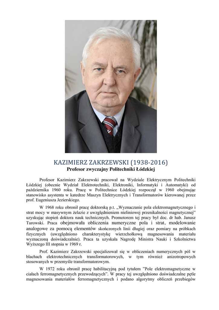 KAZIMIERZ ZAKRZEWSKI (1938-‐‑2016) Profesor zwyczajny Politechniki Łódzkiej Profesor Kazimierz Zakrzewski pracował na Wydziale Elektrycznym Politechniki Łódzkiej (obecnie Wydział Elektrotechniki, Elektroniki, Informatyki i Automatyki) od października 1960 roku. Pracę w Politechnice Łódzkiej rozpoczął w 1960 obejmując stanowisko asystenta w katedrze Maszyn Elektrycznych i Transformatorów kierowanej przez prof. Eugeniusza Jezierskiego. W 1968 roku obronił pracę doktorską p.t. „Wyznaczanie pola elektromagnetycznego i strat mocy w masywnym żelazie z uwzględnieniem nieliniowej przenikalności magnetycznej” uzyskując stopień doktora nauk technicznych. Promotorem tej pracy był doc. dr hab. Janusz Turowski. Praca obejmowała obliczenia numeryczne pola i strat, modelowanie analogowe za pomocą elementów skończonych linii długiej oraz pomiary na próbkach fizycznych (uwzględniono charakterystykę wierzchołkową magnesowania materiału wyznaczoną doświadczalnie). Praca ta uzyskała Nagrodę Ministra Nauki i Szkolnictwa Wyższego III stopnia w 1969 r. Prof. Kazimierz Zakrzewski specjalizował się w obliczeniach numerycznych pól w blachach elektrotechnicznych transformatorowych, w tym również anizotropowych stosowanych w przemyśle transformatorowym. W 1972 roku obronił pracę habilitacyjną pod tytułem ”Pole elektromagnetyczne w ciałach ferromagnetycznych przewodzących”. W pracy tej uwzględniono doświadczalne pętle magnesowania materiałów ferromagnetycznych i podano algorytmy obliczeń przebiegów elektromagnetycznych wewnątrz środowiska ferromagnetycznego. Praca habilitacyjna została wyróżniona Nagrodą Ministra Nauki, Szkolnictwa Wyższego i Techniki II stopnia. W 1983 roku Rada Państwa nadała profesorowi Kazimierzowi Zakrzewskiemu tytuł naukowy profesora nauk technicznych. Profesor ma w dorobku 170 artykułów naukowych i 3 monografie,19 artykułów z tzw. listy filadelfijskiej, 24 artykuły w czasopismach PAN, 42 referaty na konferencjach międzynarodowych, 18 referatów na konferencjach krajowych. Prof. K. Zakrzewski wypromował stosunkowo liczną grupę współpracowników. Spośród siedmiu doktorów, trzech jest już profesorami tytularnymi: Jan Sykulski w Uniwersytecie w Southampton, Sławomir Wiak w Politechnice Łódzkiej, Marian Łukaniszyn w Politechnice Opolskiej. Na stanowisku profesora pracuje dr hab. Bronisław Tomczuk w Politechnice Opolskiej, dr inż. Jan Dobkowski pełni funkcję Dyrektora Naukowego Centrum Techniki Morskiej w Gdyni, dr inż. Grażyna Sobiczewska jest starszym wykładowcą, a dr. inż. Maciej Kacperski-adiunktem w Politechnice Łódzkiej. Profesor, jako promotor „rite constitutus” wypromował dwóch doktorów „honoris causa” Politechniki Łódzkiej: członka rzeczywistego PAN prof. dr. Tadeusza Śliwińskiego i prof. Michała Jabłońskiego, emerytowanego profesora Politechniki Łódzkiej. W dorobku opiniodawczym jest 29 recenzji przewodów habilitacyjnych, 8 recenzji wydawniczych prac habilitacyjnych, 38 recenzji prac doktorskich. Profesor opiniował 11 wniosków profesorskich do tytułu i 13 w sprawie zatrudnienia na stanowisku profesora. Opiniował blisko 200 artykułów naukowych i referatów konferencyjnych. W ramach działalności w Centralnej Komisji ds. stopni naukowych i tytułu naukowego był superrecenzentem blisko 60-tu wniosków profesorskich i habilitacyjnych. W czasie pracy na Politechnice Łódzkiej przebywał na stażu: 1972 - fabryka TRANSFORMATORENUNION w Bad Cannstadt k/ Stuttgartu, 1978 - Wszechzwiązkowy Instytut Budowy Transformatorów w Zaporożu na Ukrainie. Jako profesor wizytujący pracował w Universite des Sciences et Technologies w Lille (1980) oraz w z Instytutem Fizyko-Energetycznym Łotewskiej Akademii Nauk w Rydze (1989-1995). Utrzymywał ścisłe kontakty naukowe z Narodowym Instytutem Politechnicznym w Kijowie, z Uniwersytetem w Pawii, z Katolickim Uniwersytetem w Loeven, Uniwersytetem w Southampton, z Technische Hochschule w Ilmenau, Technische Universitat w Dreźnie, z Uniwersytetem Strathclyde w Szkocji, z Instytutem Elektrodynamiki Ukraińskiej Akademii Nauk w Kijowie. Profesor Kazimierz Zakrzewski był wybitnym naukowcem i inżynierem w dziedzinie maszyn elektrycznych i transformatorów. Jego zainteresowania naukowe dotyczą zagadnień związanych z metodami obliczania pola elektromagnetycznego i strat w materiałach masywnych i zblachowanych (z uwzględnieniem doświadczalnych pętli histerezy), z modelowaniem fizycznym strat w częściach konstrukcyjnych maszyn elektrycznych i transformatorów (z uwzględnieniem nieliniowości magnetycznej), metod określania obciążalności silników indukcyjnych w warunkach szerokiej regulacji prędkości obrotowej przy zasilaniu przekształtnikowym PWM, metod obliczania hamulców o wirniku ferromagnetycznym tarczowym, analizy skutków awarii transformatorów energetycznych (obliczenia trójwymiarowe pola magnetycznego). Prof. K. Zakrzewski był wiele lat dyrektorem Instytutu Maszyn Elektrycznych i Transformatorów (obecnie Instytut Mechatroniki i Systemów Informatycznych) oraz prodziekanem na wydziale Elektrotechniki, Elektroniki, Informatyki i Automatyki. Prof. K. Zakrzewski jest postacią znaną w Polsce w świecie akademickim, czego dowodem jest niniejsza lista: 1. Członkostwo w Komitecie Elektrotechniki Polskiej Akademii Nauk od 1990 r. 2. Przewodnictwo Komitetu Elektrotechniki od 2003 r. 3. Przewodnictwo Sekcji Maszyn Elektrycznych i Transformatorów Komitetu Elektrotechniki PAN od 1997 r. 4. Członkostwo w Centralnej Komisji do spraw stopni naukowych i tytułu naukowego przy Premierze Rzeczypospolitej Polskiej (od 2000 r.) 5. Przewodnictwo Rady Naukowej Instytutu Elektrotechniki w Warszawie (od 1999 r.) 6. Członkostwo Zarządu Głównego Polskiego Towarzystwa Elektrotechniki Teoretycznej i Stosowanej (1998-1992 i od 1996, 7. Członkostwo Honorowe Polskiego Towarzystwa Elektrotechniki Teoretycznej i Stosowa