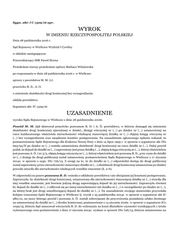 Sygn. akt: I C 1329/16 upr. WYROK W IMIENIU RZECZYPOSPOLITEJ POLSKIEJ Dnia 28 października 2016 r. Sąd Rejonowy w Wieliczce Wydział I Cywilny w składzie następującym: Przewodniczący SSR Paweł Styrna Protokolant starszy protokolant sądowy Barbara Wiśniewska po rozpoznaniu w dniu 28 października 2016 r. w Wieliczce sprawy z powództwa M. M. (1) przeciwko B. D., A. O. o zniesienie służebności drogi koniecznej bez wynagrodzenia oddala powództwo. Sygnatura akt: IC 1329/16 UZASADNIENIE wyroku Sądu Rejonowego w Wieliczce z dnia 28 października 2016r. Powód M. M. (2) skierował przeciwko pozwanym B. D. i A. Ö. powództwo, w którym domagał się zniesienia służebności drogi koniecznej ujawnionej w dziale(...)księgi wieczystej nr (...) po działce nr (...) ustanowionej na rzecz każdoczesnego właściciela nieruchomości władnącej stanowiącej działkę nr (...) objętej księgą wieczystą nr (...) bez wynagrodzenia oraz zasądzenia kosztów postępowania. Na uzasadnienie zgłoszonego żądania wskazał, że postanowieniem Sądu Rejonowego dla Krakowa Nowej Huty z dnia 14 lipca 1995 r. w sprawie o sygnaturze akt INs 693/94/N po działce nr (...) została ustanowiona służebność drogi koniecznej na rzecz działki nr (...). Dalej powód podał, że dojazd do działki nr (...) zapewniony jest przez działkę (...), objętą księgą wieczystą nr (...), której właścicielem jest pozwana A. Ö. i nr 3/3, objętą księgą wieczystą nr (...), której właścicielem jest pozwana B. D., przy czym do działki nr (...) dostęp do drogi publicznej został ustanowiony postanowieniem Sądu Rejonowego w Wieliczce z 17 stycznia 2014r. w sprawie o sygn. INs 726/13. Z uwagi na to, że do działki nr (...) odpowiedni dostęp do drogi publicznej został zapewniony przez nieruchomości stanowiące działki nr (...) służebność drogi koniecznej ustanowiona po działce powoda utraciła dla nieruchomości władnących wszelkie znaczenie (k. 2-6). W odpowiedzi na pozew pozwana B. D. wniosła o oddalenie powództwa i nie obciążanie jej kosztami postępowania. Zaprzeczyła, by służebność drogi koniecznej, ustanowiona dla nieruchomości stanowiącej działkę nr (...) straciła dla niej wszelkie znaczenie, jest bowiem jedyną drogą zapewniającą dojazd do jej nieruchomości. Zaprzeczyła również by dojazd do działki nr (...) odbywał się po innej nieruchomości niż działka nr (...) w szczególności po działce nr (...), na której brak jest drogi umożliwiającej dojazd do działki nr (...). Na uzasadnienie swojego stanowiska przywołała kolejno orzeczenia Sądu Rejonowego w Wieliczce tj. wyrok z 25 października 2013r. w sprawie o sygnaturze akt IC 980/12, na mocy którego powód i pozwana A. Ö. zostali zobowiązani do przywrócenia posiadania szlaku drożnego na ustanowionej do działki nr (...) drodze koniecznej; postanowienie z 14 stycznia 2016r. w sprawie o sygnaturze ICo 1049/15, którym Sąd umocował wierzyciela B. D. do wykonania na koszt dłużników czynności wynikających z tytułu wykonawczego oraz postanowienie z dnia 17 stycznia 2014r. wydane w sprawie INs 726/13, którym ustanowiono na rzecz każdoczesnego właściciela działki nr (...) służebność przejazdu i przechodu po nieruchomości stanowiącej działkę nr (...). Zarzuciła, że w razie zniesienia służebności drogi konicznej nieruchomość, której jest właścicielem zostanie pozbawiona prawnie ustanowionego dostępu do drogi publicznej. Pozwana A. Ö., na rozprawie w dniu 19 października 2016r. uznała powództwo. W sprawie bezsporne były okoliczności: W księdze wieczystej o nr (...) prowadzonej, dla nieruchomości oznaczonej jako działka nr (...), stanowiącej własność M. M. (1), ujawniona jest służebność przejazdu i przechodu do nieruchomości objętej księgą wieczystą nr (...) stanowiącej działkę nr (...) stanowiącej działkę nr (...) pasem o szerokości (...) na rzecz każdoczesnego właściciela nieruchomości składającej się z działki nr (...) zgodnie z projektem służebności drogi koniecznej sporządzonym przez biegłego sądowego E. M. na warunkach określonych w punkcie III postanowienia Sądu Rejonowego dla Krakowa Nowej Huty z dnia 14 lipca 1995r. o sygnaturze INs 693/94/N. Działka nr (...) stanowi własność A. Ö.. Działka nr (...) stanowi współwłasność pozwanych B. D. i A. Ö.. Z kolei działka nr (...) ujawniona w księdze wieczystej nr (...) stanowi własność B. D.. Postanowieniem z dnia 17 stycznia 2014r. Sąd Rejonowy w Wieliczce w sprawie o sygnaturze INs 726/13 ustanowił na rzecz każdoczesnego właściciela nieruchomości stanowiącej działkę ewidencyjną nr (...) dla której urządzono księgę wieczystą nr (...) służebność przejazdu i przechodu przez nieruchomość stanowiącą działkę ewidencyjną (...) objętą księgą wieczystą (...) zgodnie z mapą sporządzoną przez geodetę uprawnionego E. M. z dnia (...) tzn. szlakiem szerokości około(...) metra na długości (...)metra, Sąd ustalił następujący stan faktyczny: Wykonywanie służebności drogi koniecznej do działki nr (...), odbywa się północną stroną działki nr (...). Działka nr (...) nie posiada innego dostępu do drogi publicznej niż przez działkę nr (...), przy czym na działce (...) istnieje częściowo urządzona na gruncie służebność drogi koniecznej jednakże nie umożliwia ona bezpośredniego dojazdu do działki (...). dowód: zeznania powoda k. 49v. zeznania pozwanej B. D. k. 50 oględziny nieruchomości z dokumentacja fotograficzna k. 52-57 Niniejszy stan faktyczny został ustalony w oparciu o załączone do akt sprawy i wskazane wyżej dokumenty urzędowe. Autentyczność wskazanych dokumentów, w świetle zebranego materiału dowodowego, nie budziła wątpliwości i nie była kwestionowana przez żadną ze stron postępowania. Ustaleniu stanu faktycznego posłużyły również zeznania powoda i pozwanej, którym Sąd dał wiarę