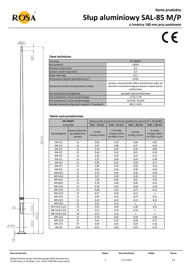 Karta produktu Słup aluminiowy SAL-85 M/P o średnicy 180 mm przy podstawie Dane techniczne Typ słupa Kod produktu Wysokość słupa H [m] Grubość ścianki słupa [mm] Waga netto [kg] Orientacyjna objętość jednostkowa [m3] SAL-85M/P 42930 8,5 4,3 51,1 0,556 oprawy z mocownaniem fi60 o parametrach wagi i powierzchni nie przekraczających danych z tabeli wytrzymałościowej Oprawy do montażu bezpośrednio na słupie Typ stosowanych wysięgników Typ fundamentu / kosza zbrojeniowego Kod fundamentu / kosza zbrojeniowego Komplet elementów złącznych zwykłych / zrywalnych wg tabeli wytrzymałościowej B-70 / Z-70 311170 / 311207 4012 / 4013 Tabele wytrzymałościowe Dopuszczalna powierzchnia boczna pojedynczej oprawy [m2] dla Cx=0,7 SAL-85M/P kod 42930 Vref. = 22 m/s Vref. = 24 m/s Vref. = 26 m/s Vref. = 28 m/s typ wysięgnika dopuszczalna waga pojedynczej oprawy I strefa, II kateg. terenu I i III strefa, II kateg. terenu do 450m n.p.m. II strefa, II kateg. terenu III strefa, II kateg. terenu do 755m n.p.m. WR-1/1 WR-1/2 WR-2/1 WR-2/2 WR-2/3 WR-3/1 WR-3/2 WR-4/1 WR-4/2 WR-5A/1 WR-5A/2 WR-6A/1 WR-8A/1 WR-13/1 WR-13/2 WR-13/3 WR-14/1 WR-14/2 WR-14/3 WR-14/1/1,5/5 WR-14/2/1,5/5 WR-14/3/1,5/5 WR-15/1 WR-15/2 WR-17/1 WR-18 15 15 15 15 15 15 15 15 15 15 15 15 15 15 15 15 15 15 15 15 15 14 15 15 10 14,5 0,95 0,47 0,76 0,40 0,29 0,73 0,39 0,94 0,43 0,76 0,37 1,00 0,78 0,78 0,38 0,27 0,65 0,32 0,21 0,55 0,27 0,17 0,76 0,41 0,50 0,51 0,79 0,38 0,63 0,32 0,23 0,60 0,31 0,78 0,39 0,63 0,29 0,85 0,64 0,63 0,29 0,20 0,53 0,24 0,16 0,44 0,19 0,12 0,62 0,32 0,35 0,34 0,59 0,27 0,45 0,21 0,15 0,43 0,20 0,58 0,28 0,46 0,20 0,62 0,46 0,44 0,17 0,12 0,37 0,14 x 0,30 0,10 x 0,44 0,20 0,23 0,22 0,53 0,24 0,40 0,18 0,13 0,38 0,17 0,52 0,24 0,40 0,17 0,56 0,41 0,38 0,15 x 0,32 0,12 x 0,25 x x 0,38 0,17 0,18 0,19 Dane producenta Zakład Produkcji Sprzętu Oświetleniowego ROSA Stanisław Rosa 43-109 Tychy, ul. Strefowa 1, tel. +48 32 73 88 901, www.rosa.pl Edycja Data aktualizacji 3 11.12.2014 Podpis Strona 1/2 Karta produktu Słup aluminiowy SAL-85 M/P o średnicy 180 mm przy podstawie Tabele wytrzymałościowe Dopuszczalna powierzchnia boczna pojedynczej oprawy [m2] dla Cx=0,7 SAL-85M/P kod 42930 Vref. = 22 m/s Vref. = 24 m/s Vref. = 26 m/s Vref. = 28 m/s typ wysięgnika dopuszczalna waga pojedynczej oprawy I strefa, II kateg. terenu I i III strefa, II kateg. terenu do 450m n.p.m. II strefa, II kateg. terenu III strefa, II kateg. terenu do 755m n.p.m. WR-18A WR-61 WR-T1/1,5 WR-T2/1,5 WRP1/1,0/0,7/5 WRP1/1,0/1,2/5 WRP1/1,5/0,7/5 WRP1/1,5/1,2/5 WRP2/1,0/0,7/5 WRP2/1,0/1,2/5 WRP2/1,5/0,7/5 WRP2/1,5/1,2/5 WRP3/1,0/0,7/5 WRP3/1,0/1,2/5 WRP3/1,5/0,7/5 WRP3/1,5/1,2/5 WN-1 WN-2 WN-21 WN-3 WN-4 WN-42 14,5 11 15 15 15 15 15 15 15 15 15 15 13 11,5 12 11 15 15 15 15 11,5 11,5 0,42 0,50 0,59 0,30 0,70 0,61 0,49 0,51 0,38 0,30 0,32 0,25 0,30 0,25 0,27 0,22 0,82 (Cx=1) 0,39 (Cx=1) 0,34 (Cx=1) 0,27 (Cx=1) 0,27 (Cx=1) 0,27 (Cx=1) 0,31 0,39 0,47 0,22 0,58 0,49 0,39 0,40 0,29 0,23 0,24 0,17 0,24 0,19 0,21 0,16 0,69 (Cx=1) 0,32 (Cx=1) 0,28 (Cx=1) 0,23 (Cx=1) 0,23 (Cx=1) 0,23 (Cx=1) 0,18 0,25 0,31 0,11 0,41 0,33 0,26 0,25 0,19 0,13 0,14 x 0,16 0,11 0,13 x 0,52 (Cx=1) 0,24 (Cx=1) 0,20 (Cx=1) 0,17 (Cx=1) 0,16 (Cx=1) 0,16 (Cx=1) 0,14 0,21 0,27 x 0,36 0,28 0,22 0,21 0,16 0,11 0,11 x 0,13 x 0,10 x 0,47 (Cx=1) 0,21 (Cx=1) 0,18 (Cx=1) 0,15 (Cx=1) 0,15 (Cx=1) 0,15 (Cx=1) Dopuszczalna powierzchnia boczna opraw i wysięgników [m2] dla Cx=1 SAL-85M/P kod 42930 Vref. = 22 m/s Vref. = 24 m/s Vref. = 26 m/s Vref. = 28 m/s Dopuszczalna masa opraw i wysięgników [kg] I strefa, II kateg. terenu I i III strefa, II kateg. terenu do 450m n.p.m. II strefa, II kateg. terenu III strefa, II kateg. terenu do 755m n.p.m. 50 0,77 0,64 0,49 0,44 Dane producenta Zakład Produkcji Sprzętu Oświetleniowego ROSA Stanisław Rosa 43-109 Tychy, ul. Strefowa 1, tel. +48 32 73 88 901, www.rosa.pl Edycja Data aktualizacji 3 11.12.2014 powierzchnia: aluminium szlifowane anodowanie w 10 kolorach, każdy z możliwością wybłyszczania opcja malowania proszkowego wg RAL (inne farby na życzenie klienta) opcja zabezpieczenia elastomerem w kolorze słupa do wysokości 350 mm (inna wysokość na życzenie klienta) wnęka standard ROSA pakowanie: włóknina polipropylenowa Podpis Strona 2/2