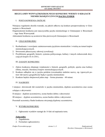 KONKURSY GIMNAZJALNE rok szkolny 2014/2015 REGULAMIN WEWNĄTRZSZKOLNEGO KONKURSU WIEDZY O KRAJACH NIEMIECKOJĘZYCZNYCH DACH-LÄNDER I. POSTANOWIENIA OGÓLNE Niniejszy regulamin określa warunki, na jakich odbywa się konkurs przeprowadzony w Gimnazjum w Brzezinach Organizatorem konkursu jest nauczycielka języka niemieckiego w Gimnazjum w Brzezinach – mgr Anna Wawrzyniak Adresatami konkursu są uczniowie klas pierwszych Gimnazjum w Brzezinach II. CELE KONKURSU 1. Rozbudzanie i rozwijanie zainteresowania językiem niemieckim i wiedzą na temat krajów niemieckojęzycznych. 2. Stworzenie płaszczyzny zdrowej rywalizacji. 3. Przybliżenie geografii, historii, systemu politycznego, kultury i innych ciekawostek dotyczących krajów D-A-CH-L. III. ZASADY KONKURSU 1. Zakres konkursu obejmuje wiadomości z historii, geografii, polityki, sportu oraz kultury (filmu, muzyki, literatury) krajów niemieckojęzycznych. 2. Konkurs odbędzie się w języku polskim (ewentualnie niektóre nazwy, np. typowych potraw lub nazwy geograficzne będą w języku niemieckim) 3. Konkurs będzie obejmował jeden etap – forma pisemna – 60 minut. IV. NAGRODY I miejsce- słowniczek lub rozmówki w języku niemieckim, dyplom uczestnictwa oraz ocena celująca z aktywności II miejsce - dyplom uczestnictwa, ocena bardzo dobra z aktywności III miejsce – dyplom uczestnictwa, ocena bardzo dobra z aktywności Pozostali uczestnicy finału konkursu otrzymają dyplomy uczestnictwa. V. WYNIKI KONKURSU 1. Ogłoszenie wyników nastąpi do 14 dni od napisania testu. Załączniki: 1. Zagadnienia 2. Formularz zgłoszeniowy Podpis Przewodniczącego: strona 1 z 3 Zaakceptował: Dyrektor Gimnazjum w Brzezinach KONKURSY GIMNAZJALNE rok szkolny 2014/2015 ZAGADNIENIA DO KONKURSU WIEDZY O KRAJACH NIEMIECKOJĘZYCZNYCH I. Pytania będą obejmowały ogólną i szczegółową wiedzę na temat krajów niemieckojęzycznych: Niemcy, Austria, Szwajcaria, Lichtenstein z zakresu geografii, historii, polityki, sportu, kultury, literatury, filmu i muzyki. II. Konkurs odbędzie się w języku polskim. III.ZAGADNIENIA Mapy i flagi krajów niemieckojęzycznych Stolice państw, powierzchnia, ludność Symbole tablic rejestracyjnych Podział administracyjny/ Landy/Kantony Szczyty górskie Rzeki Największe miasta Gospodarka/gałęzie/rozwój Dostęp do morza Godło Autostrady Miasta portowe Numery kierunkowe Katedry (znane) Prezydent/Kanclerz Hitler/ Kapitulacja Niemiec Mur berliński Zjednoczenie Niemiec Znane niemieckie firmy Zespoły muzyczne Marki samochodowe Znani wynalazcy i wynalazki Religia Styl życia Języki urzędowe w Szwajcarii Znane postaci: film, literatura, muzyka, nauka, sport, polityka – m.in. A. Einstein, W. Röntgen, J.W. Goethe, F. Schiller, K. Adenauer, A. Merkel, W.A. Mozart, J.S. Bach, G. Grass, S. Amman, H. Klum, S. Graf, M. Schumacher, E. Kant, M. Luther, M. Dietrich, L.V. Beethoven …………………………………………… (czytelny podpis osoby odpowiedzialnej) Podpis Przewodniczącego: strona 2 z 3 Zaakceptował: Dyrektor Gimnazjum w Brzezinach KONKURSY GIMNAZJALNE rok szkolny 2014/2015 Brzeziny, dn. ………………………. Gimnazjum w Brzezinach ul. Gimnazjalna 1 62-874 Brzeziny WEWNĄTRZSZKOLNY KONKURS WIEDZY O KRAJACH NIEMIECKOJĘZYCZNYCH DACH-LÄNDER Formularz zgłoszeniowy Nazwa szkoły (miejsce konkursu): Gimnazjum w Brzezinach , ul. Gimnazjalna 1, 62-874 Brzeziny Termin przeprowadzenia konkursu : 28 maja 2015r. o godzinie 10.30 Nazwisko i imię ucznia: ……………………………………………………………. Klasa: ………………….. Zapoznałam/ em się z regulaminem konkursu i akceptuję jego warunki. Podpis ucznia ………………………………………………… Osoba odpowiedzialna za przeprowadzenie konkursu w szkole – nauczycielka języka niemieckiego – mgr Anna Wawrzyniak Brzeziny, dn. ………………………. Gimnazjum w Brzezinach ul. Gimnazjalna 1 62-874 Brzeziny WEWNĄTRZSZKOLNY KONKURS WIEDZY O KRAJACH NIEMIECKOJĘZYCZNYCH DACH-LÄNDER Formularz zgłoszeniowy Nazwa szkoły (miejsce konkursu): Gimnazjum w Brzezinach , ul. Gimnazjalna 1, 62-874 Brzeziny Termin przeprowadzenia konkursu : 28 maja 2015r. o godzinie 10.30 Nazwisko i imię ucznia: …………………………………………..………………. Klasa: ………………….. Zapoznałam/ em się z regulaminem konkursu i akceptuję jego warunki. Podpis ucznia ………………………………………………… Osoba odpowiedzialna za przeprowadzenie konkursu w szkole – nauczycielka języka niemieckiego – mgr Anna Wawrzyniak Podpis Przewodniczącego: strona 3 z 3 Zaakceptował: Dyrektor Gimnazjum w Brzezinach