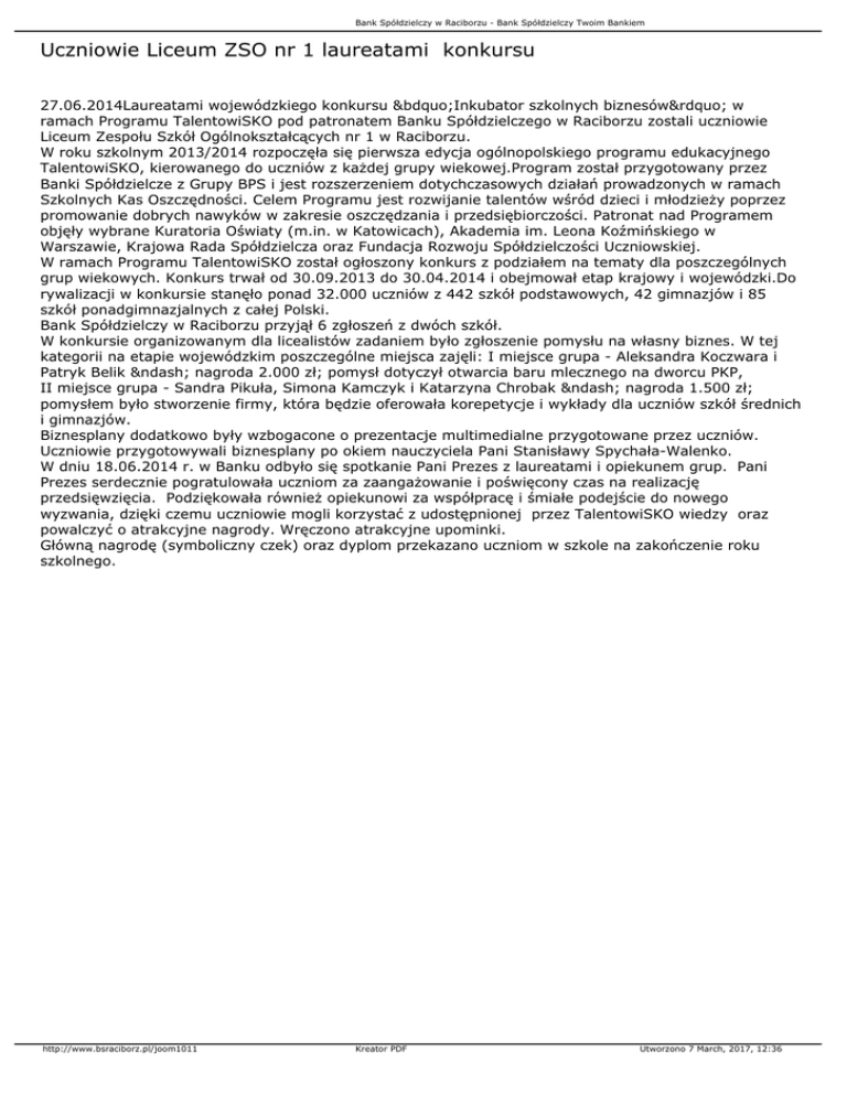 Bank Spółdzielczy w Raciborzu - Bank Spółdzielczy Twoim Bankiem Uczniowie Liceum ZSO nr 1 laureatami konkursu 27.06.2014Laureatami wojewódzkiego konkursu „Inkubator szkolnych biznesów” w ramach Programu TalentowiSKO pod patronatem Banku Spółdzielczego w Raciborzu zostali uczniowie Liceum Zespołu Szkół Ogólnokształcących nr 1 w Raciborzu. W roku szkolnym 2013/2014 rozpoczęła się pierwsza edycja ogólnopolskiego programu edukacyjnego TalentowiSKO, kierowanego do uczniów z każdej grupy wiekowej.Program został przygotowany przez Banki Spółdzielcze z Grupy BPS i jest rozszerzeniem dotychczasowych działań prowadzonych w ramach Szkolnych Kas Oszczędności. Celem Programu jest rozwijanie talentów wśród dzieci i młodzieży poprzez promowanie dobrych nawyków w zakresie oszczędzania i przedsiębiorczości. Patronat nad Programem objęły wybrane Kuratoria Oświaty (m.in. w Katowicach), Akademia im. Leona Koźmińskiego w Warszawie, Krajowa Rada Spółdzielcza oraz Fundacja Rozwoju Spółdzielczości Uczniowskiej. W ramach Programu TalentowiSKO został ogłoszony konkurs z podziałem na tematy dla poszczególnych grup wiekowych. Konkurs trwał od 30.09.2013 do 30.04.2014 i obejmował etap krajowy i wojewódzki.Do rywalizacji w konkursie stanęło ponad 32.000 uczniów z 442 szkół podstawowych, 42 gimnazjów i 85 szkół ponadgimnazjalnych z całej Polski. Bank Spółdzielczy w Raciborzu przyjął 6 zgłoszeń z dwóch szkół. W konkursie organizowanym dla licealistów zadaniem było zgłoszenie pomysłu na własny biznes. W tej kategorii na etapie wojewódzkim poszczególne miejsca zajęli: I miejsce grupa - Aleksandra Koczwara i Patryk Belik – nagroda 2.000 zł; pomysł dotyczył otwarcia baru mlecznego na dworcu PKP, II miejsce grupa - Sandra Pikuła, Simona Kamczyk i Katarzyna Chrobak – nagroda 1.500 zł; pomysłem było stworzenie firmy, która będzie oferowała korepetycje i wykłady dla uczniów szkół średnich i gimnazjów. Biznesplany dodatkowo były wzbogacone o prezentacje multimedialne przygotowane przez uczniów. Uczniowie przygotowywali biznesplany po okiem nauczyciela Pani Stanisławy Spychała-Walenko. W dniu 18.06.2014 r. w Banku odbyło się spotkanie Pani Prezes z laureatami i opiekunem grup. Pani Prezes serdecznie pogratulowała uczniom za zaangażowanie i poświęcony czas na realizację przedsięwzięcia. Podziękowała również opiekunowi za współpracę i śmiałe podejście do nowego wyzwania, dzięki czemu uczniowie mogli korzystać z udostępnionej przez TalentowiSKO wiedzy oraz powalczyć o atrakcyjne nagrody. Wręczono atrakcyjne upominki. Główną nagrodę (symboliczny czek) oraz dyplom przekazano uczniom w szkole na zakończenie roku szkolnego. http://www.bsraciborz.pl/joom1011 Kreator PDF Utworzono 7 March, 2017, 12:36