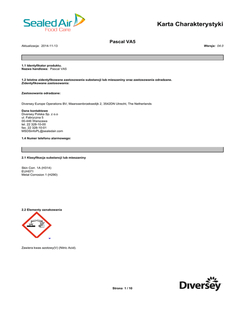 Karta Charakterystyki Pascal VA5 Wersja: 04.0 Aktualizacja: 2014-11-13 1.1 Identyfikator produktu. Nazwa handlowa: Pascal VA5 1.2 Istotne zidentyfikowane zastosowania substancji lub mieszaniny oraz zastosowania odradzane. Zidentyfikowane zastosowania: Zastosowania odradzane: Diversey Europe Operations BV, Maarssenbroeksedijk 2, 3542DN Utrecht, The Netherlands Dane kontaktowe Diversey Polska Sp. z o.o ul. Fabryczna 5 00-446 Warszawa tel. 22 328-10-00 fax. 22 328-10-01 [email protected] 1.4 Numer telefonu alarmowego: 2.1 Klasyfikacja substancji lub mieszaniny Skin Corr. 1A (H314) EUH071 Metal Corrosion 1 (H290) 2.2 Elementy oznakowania Zawiera kwas azotowy(V) (Nitric Acid). Strona 1 / 10 KARTA CHARAKTERYSTYKI Pascal VA5 XIII. 3.2 Mieszaniny kwas azotowy(V) Numer WE Numer CAS Numer REACH 231-714-2 7697-37-2 01-2119487297-23 * Polimer. Wdychanie Kontakt z oczami: pierwszej pomocy: Wdychanie: Kontakt z oczami: substancji, patrz sekcja 11. alkoholu. Strona 2 / 10 Klasyfikacja zgodna z (WE) 1272/2008 Ox. Liq. 3 (H272) Skin Corr. 1A (H314) EUH071 Metal Corrosion 1 (H290) Klasyfikacja O;R8 C;R35 Uwagi Procent wagowy 30-50 KARTA CHARAKTERYSTYKI Pascal VA5 6.4 Odniesienia do innych sekcji pojemniku. kwas azotowy(V) dopuszczalne dopuszczalne 1.4 mg/m3 (NDSCh) 2.6 mg/m3 Zalecane procedury monitorowania: krótkoterminowe skutki miejscowe krótkoterminowe skutki ogólnoustrojowe skutki miejscowe skutki ogólnoustrojowe danych danych danych danych krótkoterminowe skutki miejscowe krótkoterminowe skutki ogólnoustrojowe (mg / kg mc) skutki miejscowe skutki ogólnoustrojowe (mg / kg mc) danych danych danych danych krótkoterminowe skutki miejscowe krótkoterminowe skutki ogólnoustrojowe (mg / kg mc) skutki miejscowe skutki ogólnoustrojowe (mg / kg mc) kwas azotowy(V) kwas azotowy(V) Strona 3 / 10 KARTA CHARAKTERYSTYKI Pascal VA5 kwas azotowy(V) danych danych danych danych krótkoterminowe skutki miejscowe krótkoterminowe skutki ogólnoustrojowe skutki miejscowe skutki ogólnoustrojowe 3) kwas azotowy(V) 2.6 1.3 danych danych 3) krótkoterminowe skutki miejscowe kwas azotowy(V) krótkoterminowe skutki ogólnoustrojowe 1.3 skutki miejscowe skutki ogólnoustrojowe 0.65 danych Wody powierzchniowe, (mg / l) danych danych Okresowe (mg / l) Oczyszczalnia danych danych danych Osady morskie (mg / kg) Gleba (mg / kg) W powietrzu (mg/m3) (mg / kg) danych danych danych danych kwas azotowy(V) kwas azotowy(V) produktu: Okulary ochronne lub gogle (EN166). Ochrona oczu / twarzy: Czas przebicia >= 480 min Czas przebicia >= 30 min skóry i/ lub rozbryzgi. Ochrona dróg oddechowych: wód powierzchniowych i wód gruntowych. roztworem roboczym produktu: 3 Strona 4 / 10 KARTA CHARAKTERYSTYKI Pascal VA5 Ochrona oczu / twarzy: Czas przebicia >= 480 min Czas przebicia >= 30 min Ochrona dróg oddechowych: Metoda / uwaga Barwa: Przejrzysty, Bezbarwny Zapach: Charakterystyczny Próg zapachu Nie dotyczy pH: < 2 Nie Dane dla substancji, temperatura wrzenia: Metoda (°C) kwas azotowy(V) 116 atmosferyczne (hPa) Metody nie podano Metoda / uwaga Nie dotyczy. Podtrzymuje palenie: Nie dotyczy. Metoda / uwaga Metoda (Pa) 770 kwas azotowy(V) Metody nie podano Temperatura (°C) 20 Metoda / uwaga 1.31 g/cm³ (20 °C) Metoda (g/l) > 500 kwas azotowy(V) Strona 5 / 10 Metody nie podano Temperatura (°C) KARTA CHARAKTERYSTYKI Pascal VA5 Metoda / uwaga 9.2. Inne informacje Korozja metali: siarczyny. SEKCJA 11: Informacje toksykologiczne Punkt Gatunek: Metoda Czas ekspozycji (h) Gatunek: Metoda Czas ekspozycji (h) Gatunek: Metoda Czas ekspozycji (h) Szczur OECD 403 (EU B.2) (mg / kg) kwas azotowy(V) Brak danych Punkt (mg / kg) kwas azotowy(V) Brak danych Punkt (mg / l) kwas azotowy(V) LC 50 1.56 Wynik Gatunek Królik Metoda Metody nie podano Czas ekspozycji Wynik Gatunek Metoda Czas ekspozycji kwas azotowy(V) Strona 6 / 10 KARTA CHARAKTERYSTYKI Pascal VA5 kwas azotowy(V) Metody nie podano Wynik Gatunek Metoda Czas ekspozycji Gatunek Metoda Czas ekspozycji (h) Gatunek Metoda Czas ekspozycji kwas azotowy(V) danych. Wynik kwas azotowy(V) danych Wynik kwas azotowy(V) danych Wynik (in vitro) Metoda Wynik (in vivo) (in vitro) OECD 471 (EU B.12/13) kwas azotowy(V) Metoda (in vivo) Zmiana kwas azotowy(V) Punkt kwas azotowy(V) Specyficzny efekt Gatunek (mg / kg mc / d) 1500 NOAEL Punkt Szczur Metoda Czas ekspozycji OECD 422, oral Gatunek Metoda Szczur OECD 422, oral Gatunek Metoda Czas ekspozycji (dni) Gatunek Metoda Czas ekspozycji (dni) (mg/kg bw/d) kwas azotowy(V) NOAEL 1500 Punkt (mg/kg bw/d) kwas azotowy(V) inne skutki Czas ekspozycji (dni) 28 Brak danych Punkt (mg/kg bw/d) kwas azotowy(V) Brak danych Drogi Punkt Gatunek Metoda (mg/kg bw/d) kwas azotowy(V) Brak danych kwas azotowy(V) kwas azotowy(V) Strona 7 / 10 Czas ekspozycji (dni) Komentarze docelowe KARTA CHARAKTERYSTYKI Pascal VA5 Potencjalne szkodliwe skutki dla zdrowia i objawy SEKCJA 12: Informacje ekologiczne Punkt Gatunek Metoda Gambusia affinis Metody nie podano Gatunek Metoda Daphnia magna Straus Brak wytycznych do badania Gatunek Metoda badawcza Czas ekspozycji (h) Gatunek Metoda Czas ekspozycji (dni) Inokulum Metoda Czas ekspozycji (mg / l) kwas azotowy(V) LC 50 72 Punkt (mg / l) kwas azotowy(V) EC 50 8609 Punkt (mg / l) kwas azotowy(V) Czas ekspozycji (h) 96 Czas ekspozycji (h) 24 Brak danych Punkt (mg / l) kwas azotowy(V) Brak danych Punkt (mg / l) Brak kwas azotowy(V) danych Punkt kwas azotowy(V) LD 50 (mg / l) 8226 Gatunek Metoda Oncorhynchus mykiss Metody nie podano Gatunek Gatunek Punkt Czas ekspozycji 96 godzin (a) (y) Zaobserwowano efekty Metoda Czas ekspozycji Zaobserwowane skutki Metoda Czas ekspozycji (dni) Zaobserwowane skutki (mg / l) Brak kwas azotowy(V) danych Punkt kwas azotowy(V) (mg / kg / dw osadu) Brak danych Strona 8 / 10 KARTA CHARAKTERYSTYKI Pascal VA5 Biodegradacja Inokulum Metoda analityczna DT 50 Metoda kwas azotowy(V) kwas azotowy(V) Ocena Nie dotyczy (substancji nieorganicznej) Metoda Metody nie podano -2.3 Gatunek Ocena Nie dotyczy, nie ulega bioakumulacji