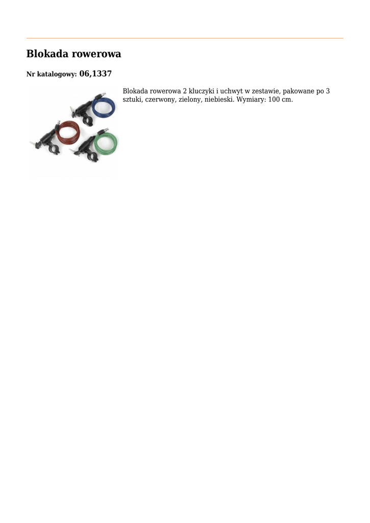 Blokada rowerowa Nr katalogowy: 06,1337 Blokada rowerowa 2 kluczyki i uchwyt w zestawie, pakowane po 3 sztuki, czerwony, zielony, niebieski. Wymiary: 100 cm.
